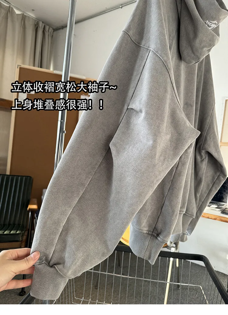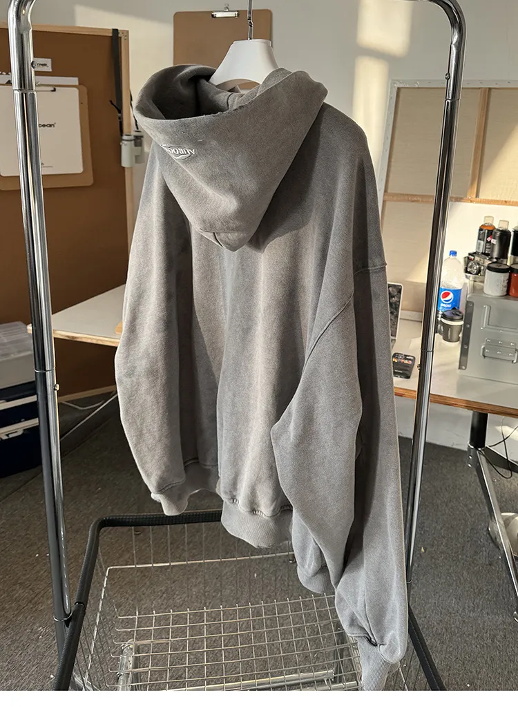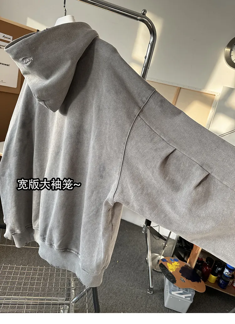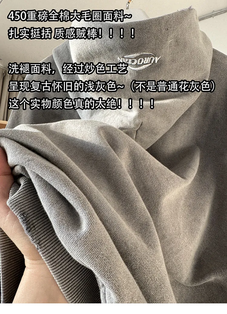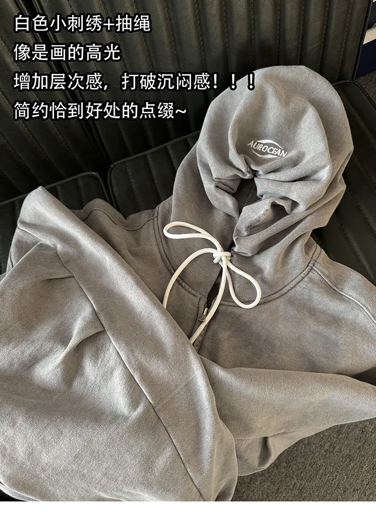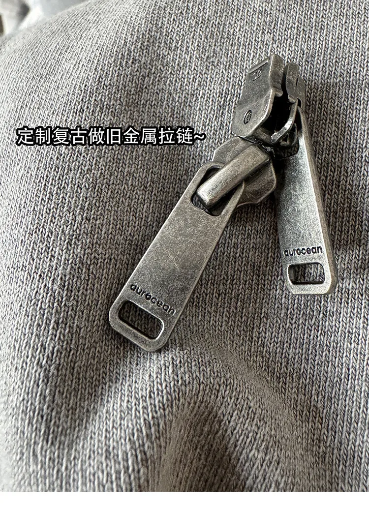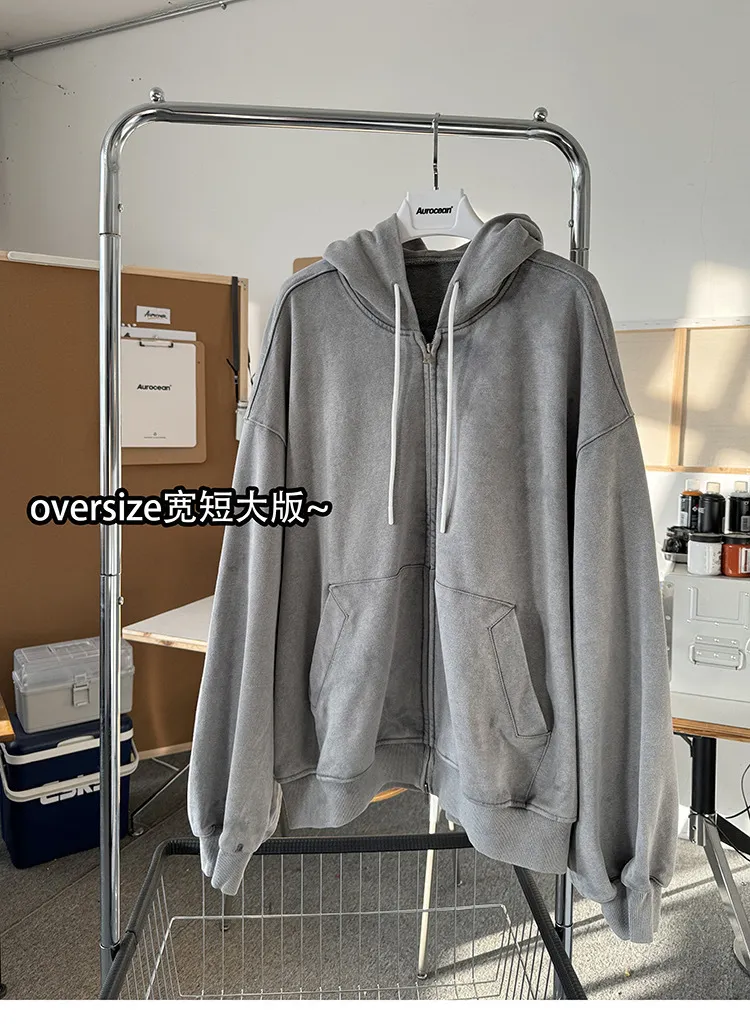 AUROCEAN 450G重磅 做舊 OS 雙拉鍊 刺繡連帽 外套(淺灰)