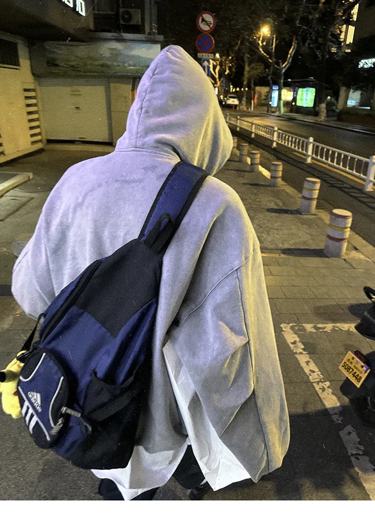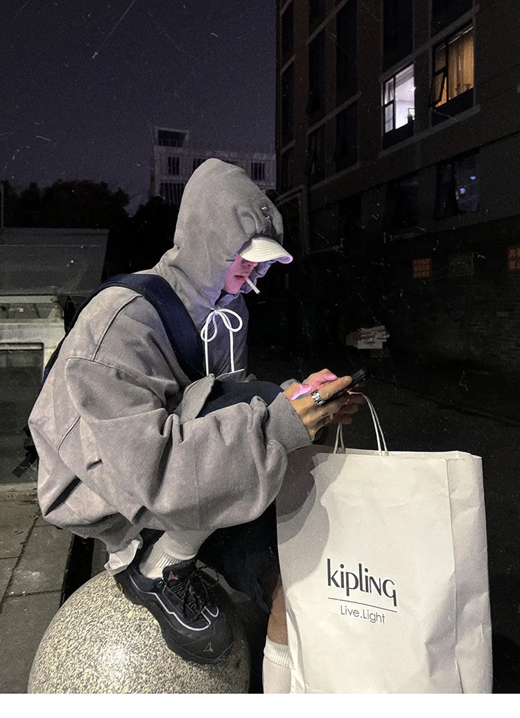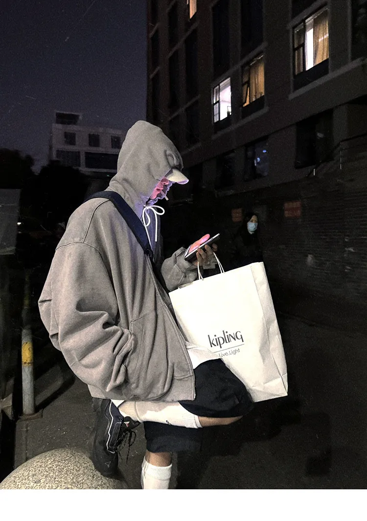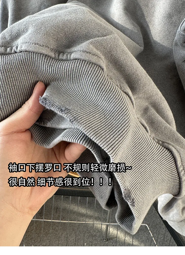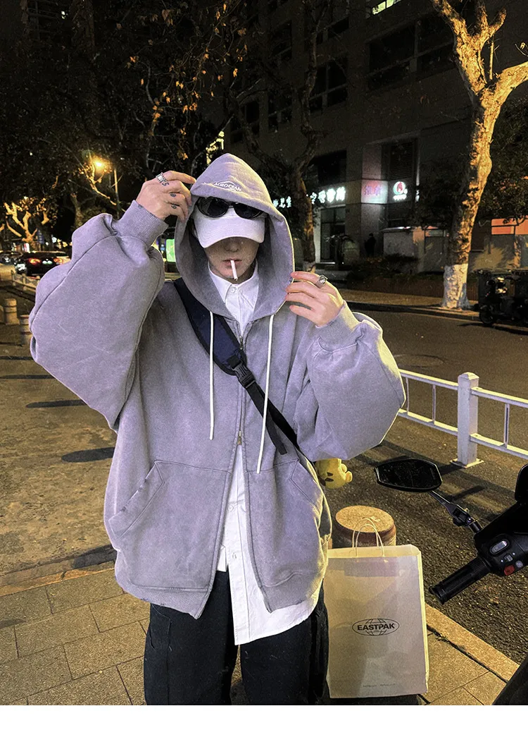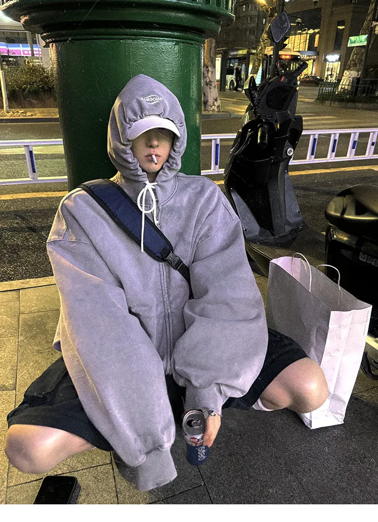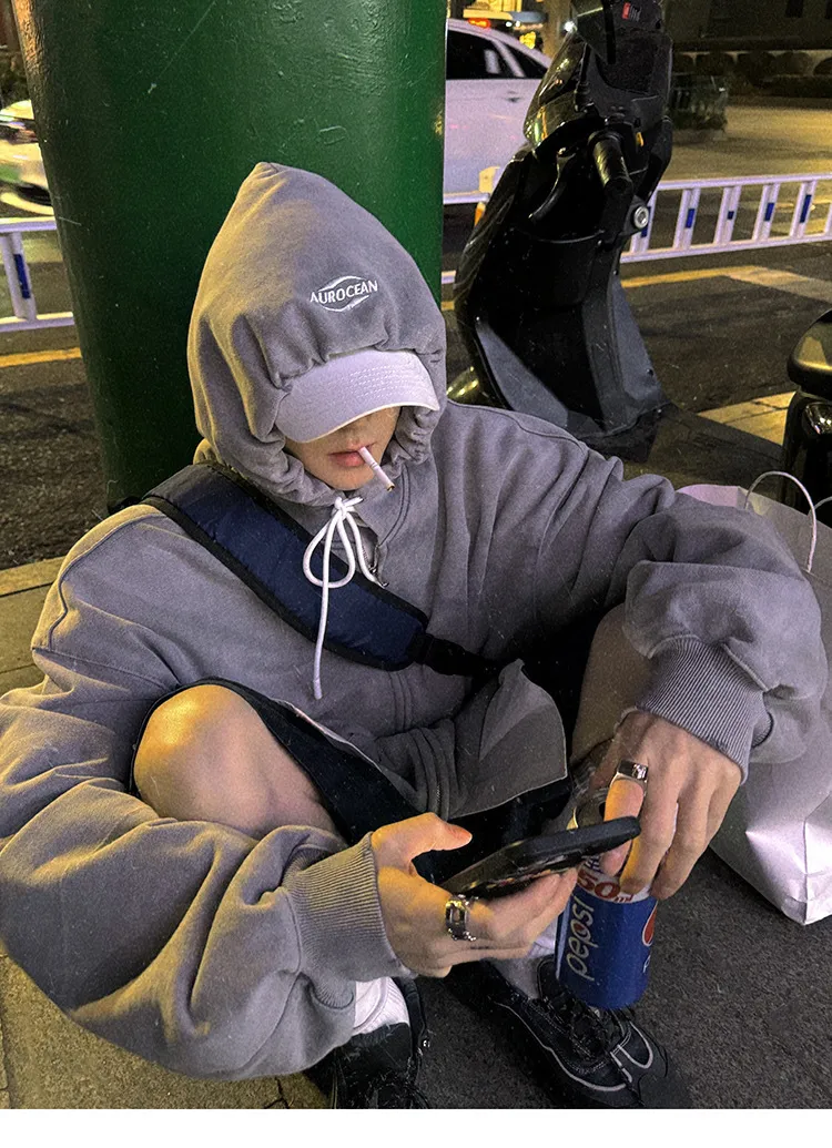 AUROCEAN 450G重磅 做舊 OS 雙拉鍊 刺繡連帽 外套(淺灰)