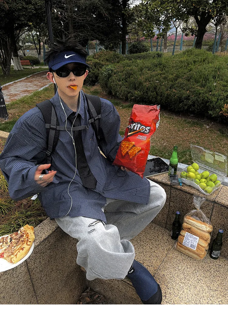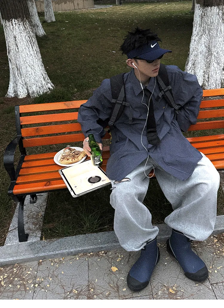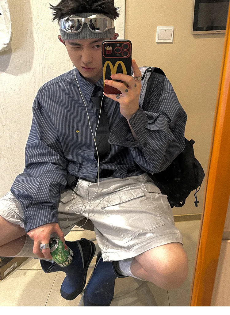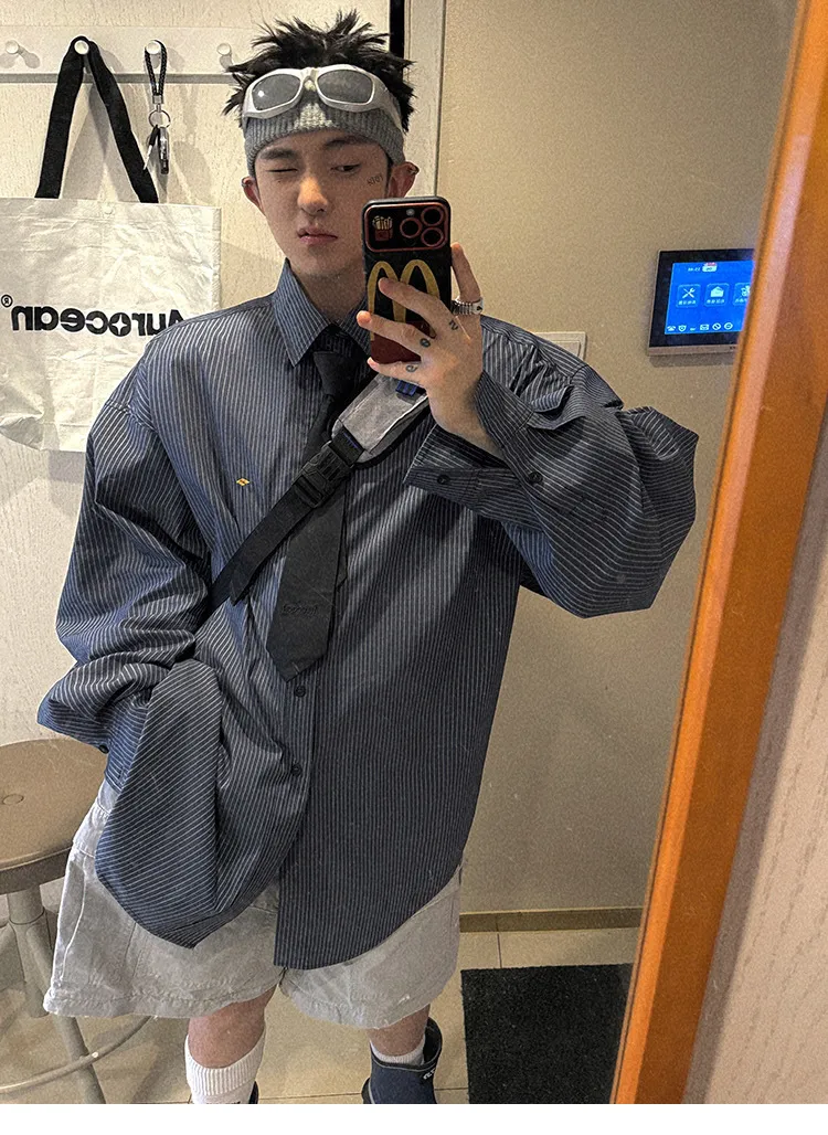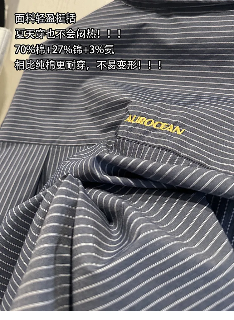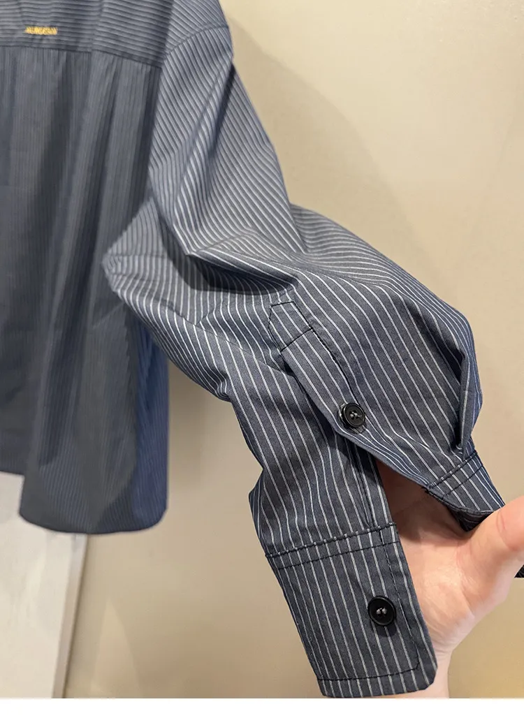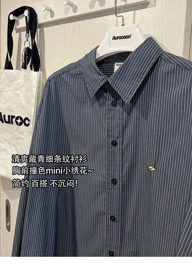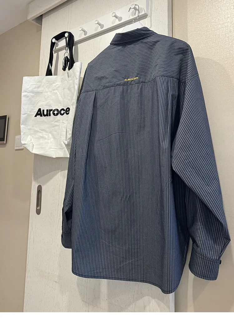 AUROCEAN 寬鬆廓形 條紋 學院風 長袖 襯衫(藏青)