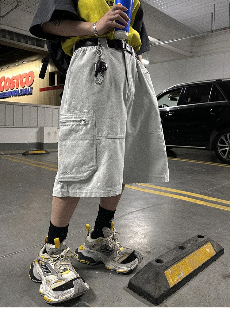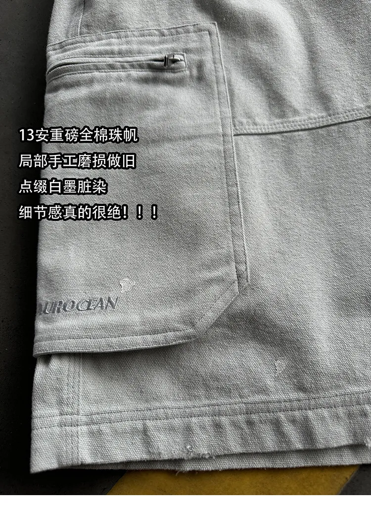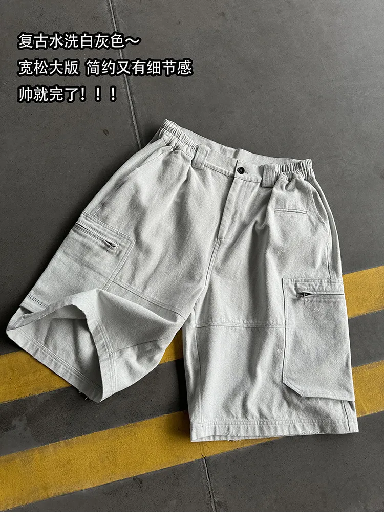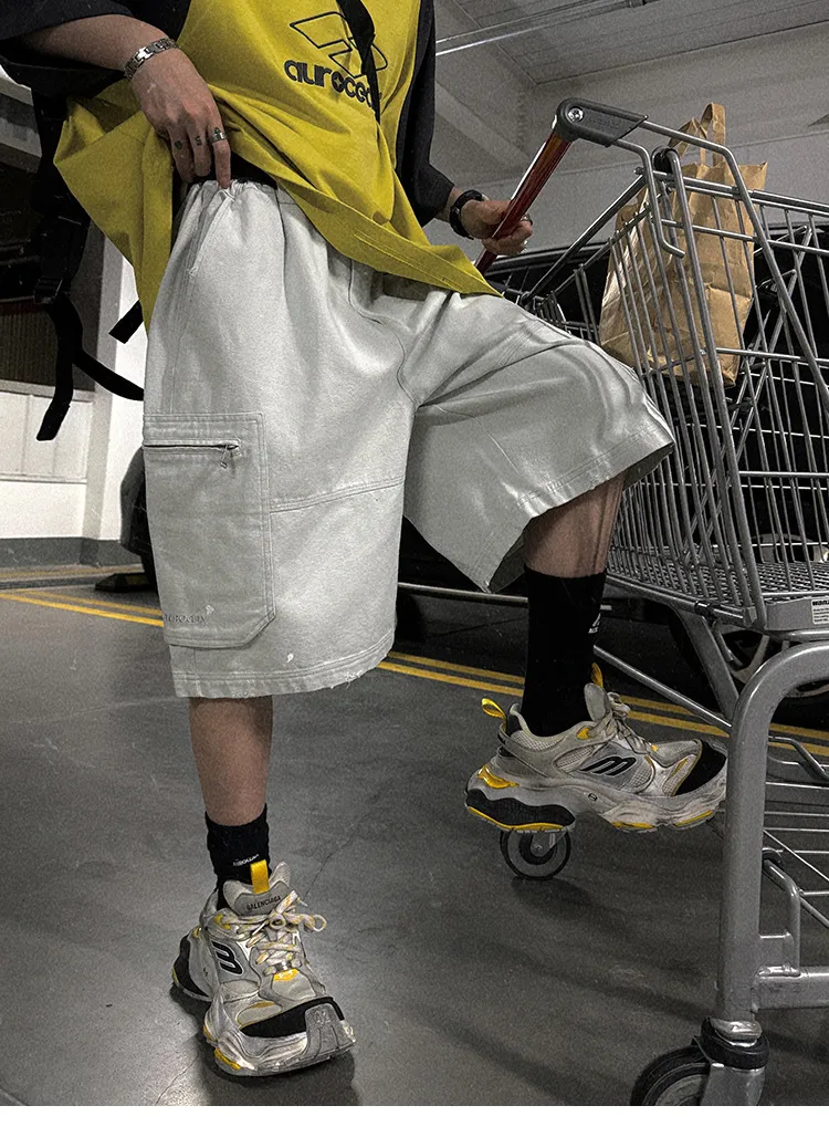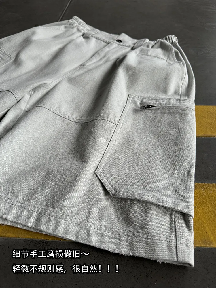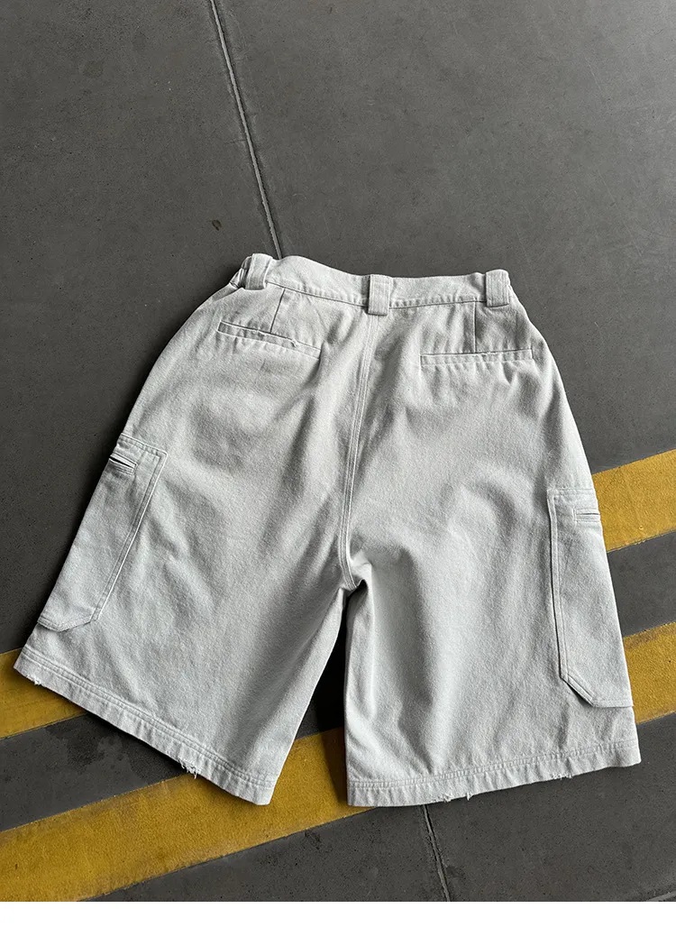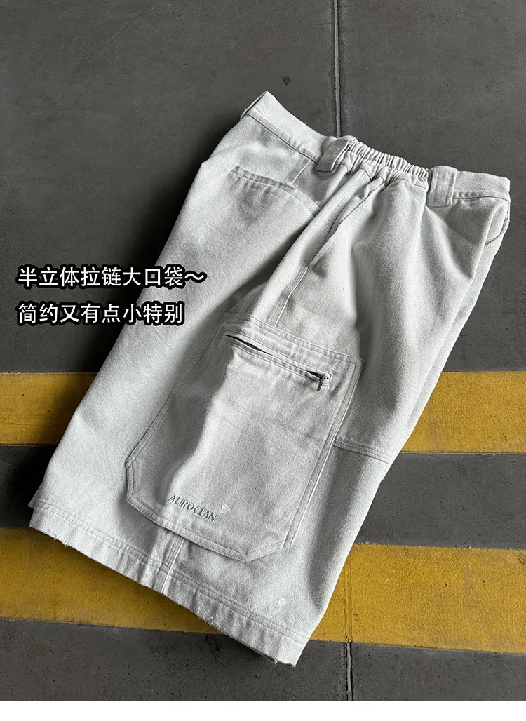 AUROCEAN 水洗做舊 破壞 重磅 工裝大口袋 短褲(灰白色)