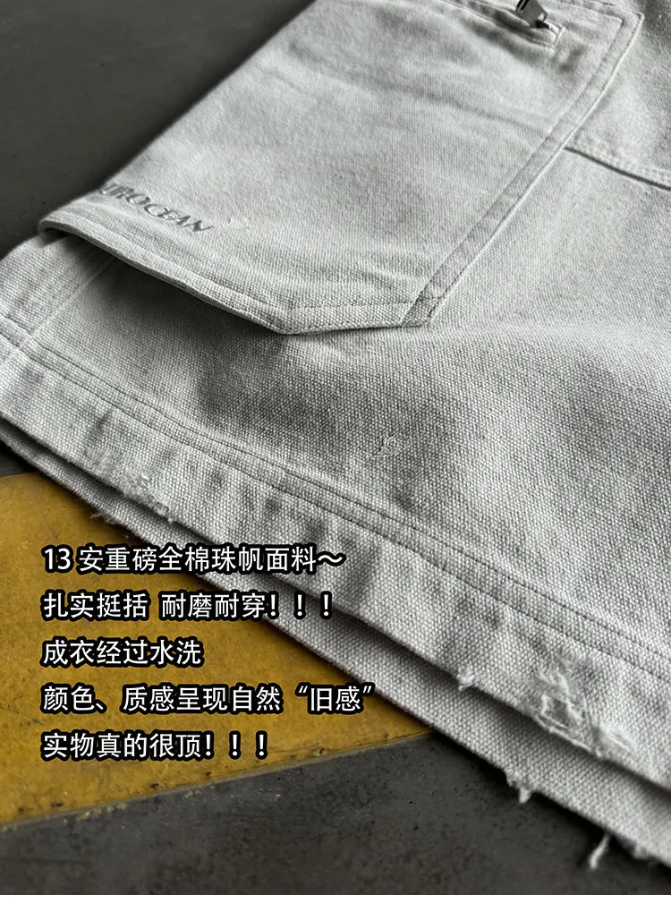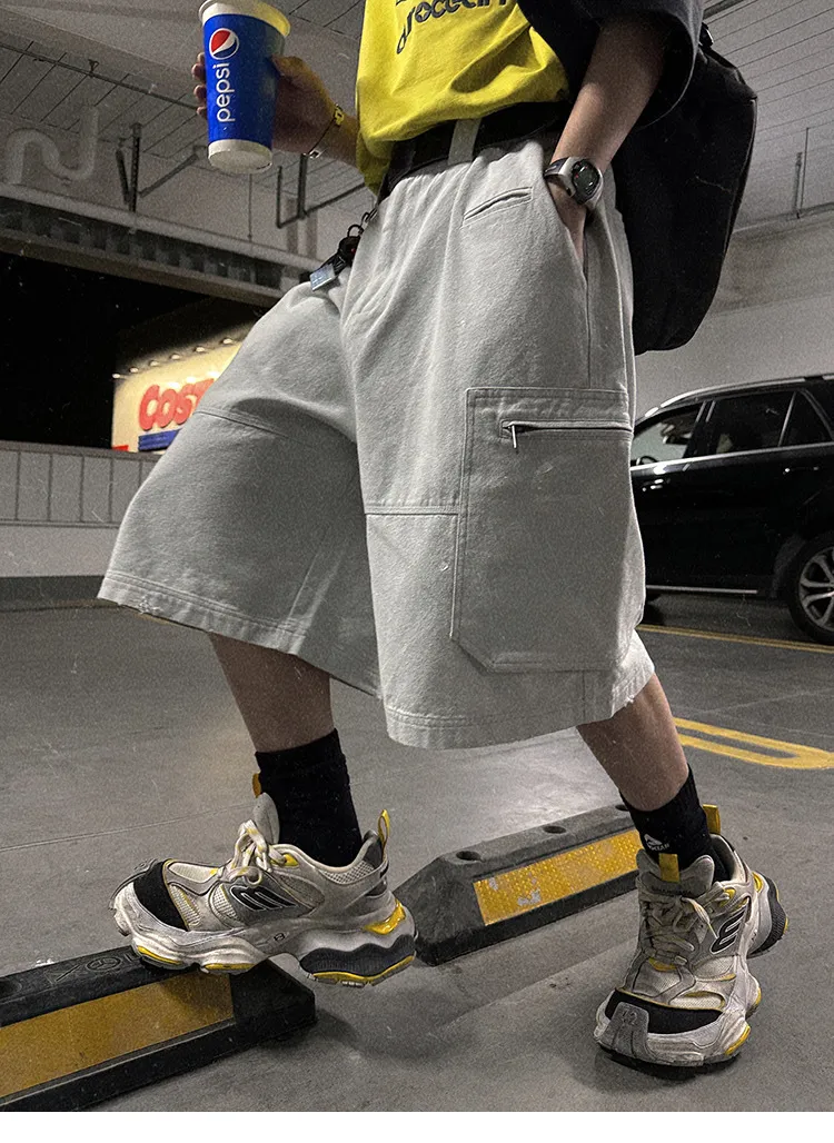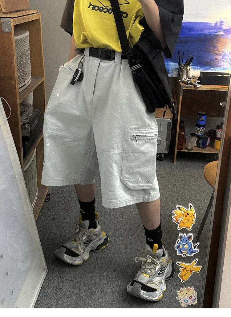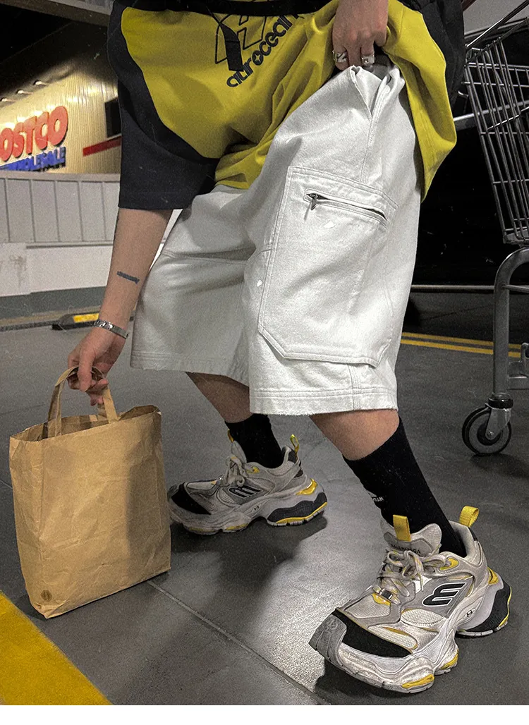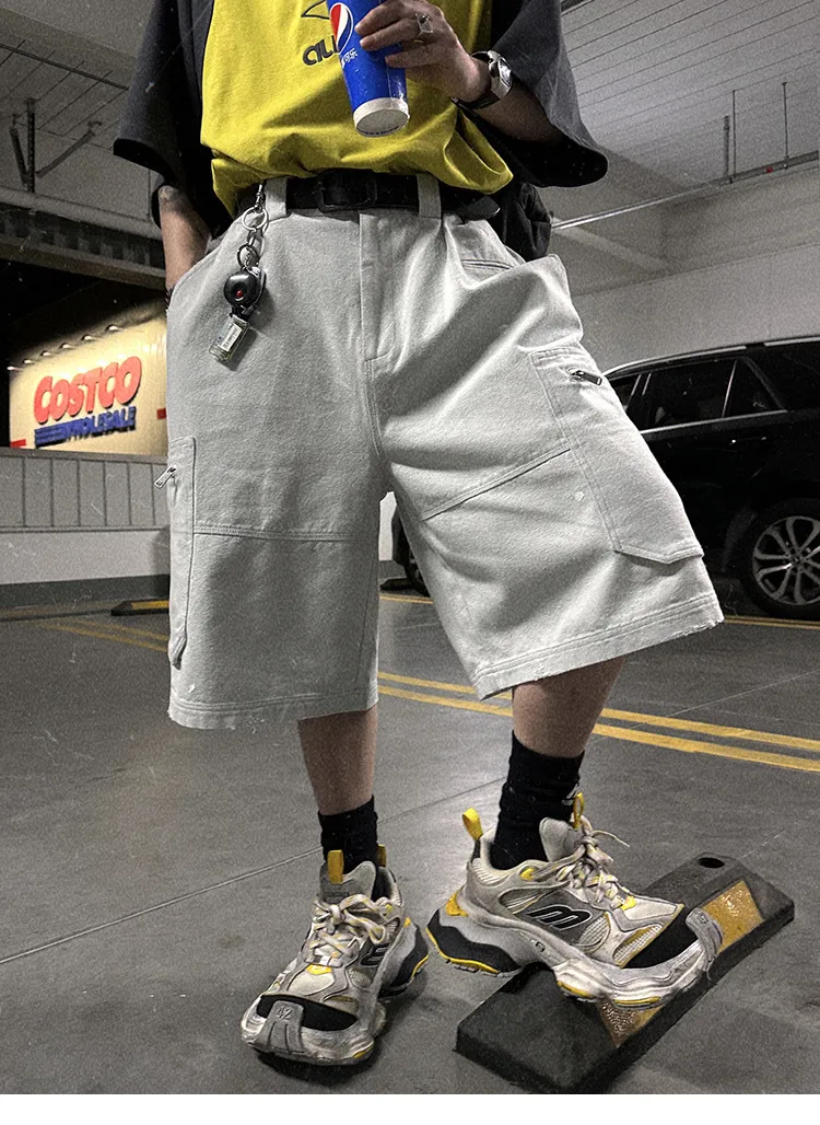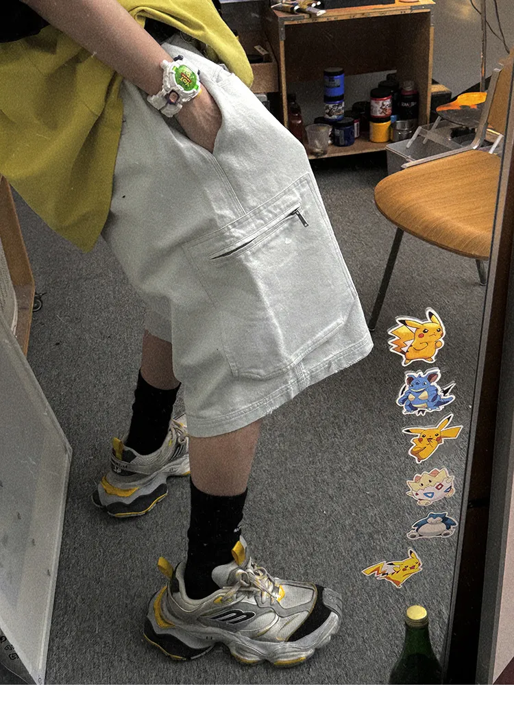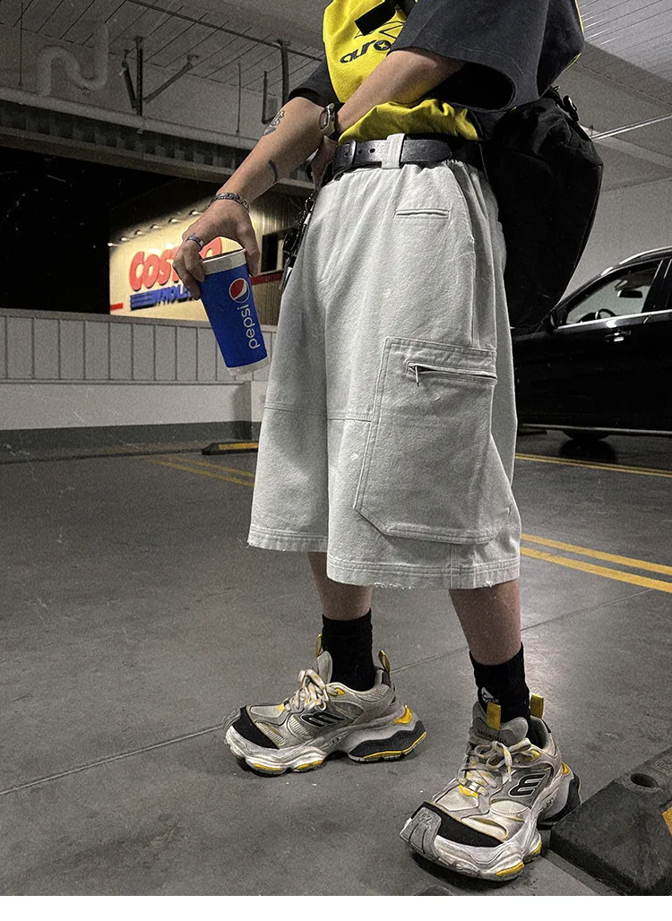 AUROCEAN 水洗做舊 破壞 重磅 工裝大口袋 短褲(灰白色)