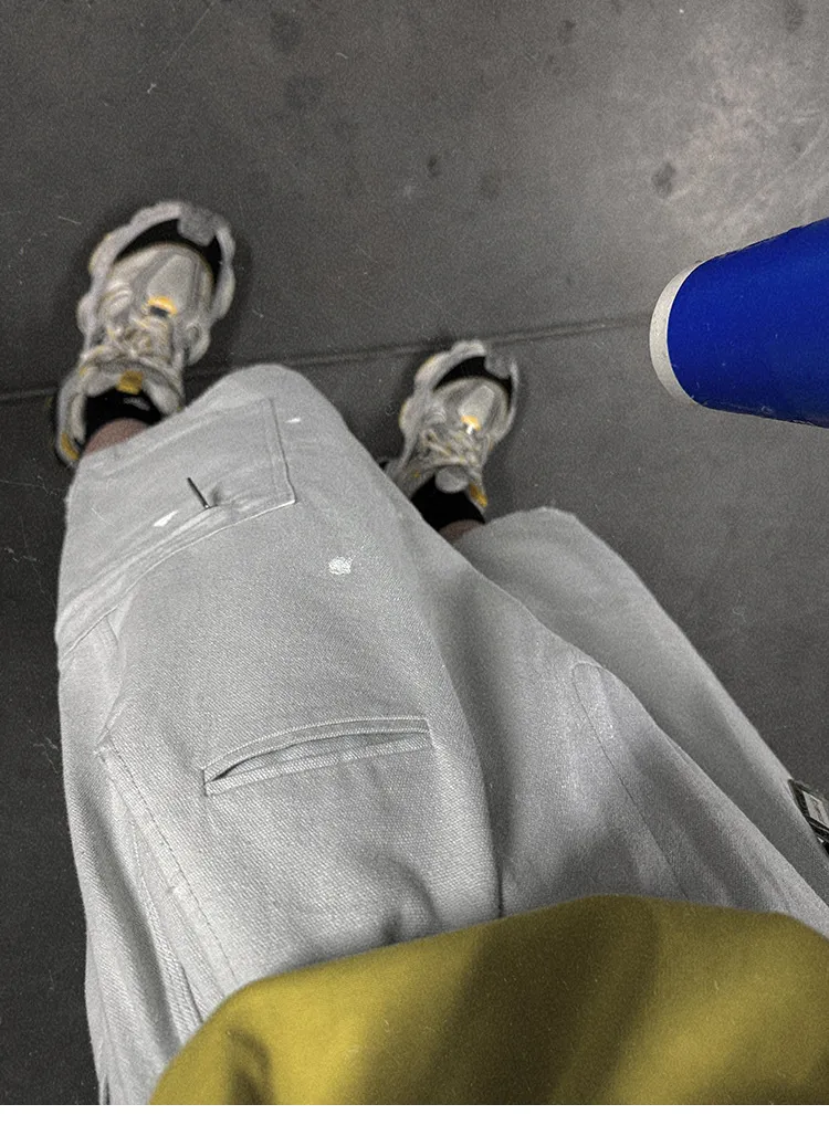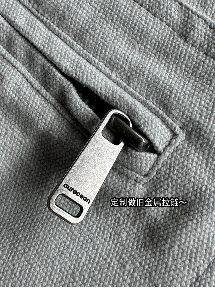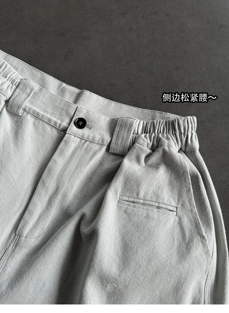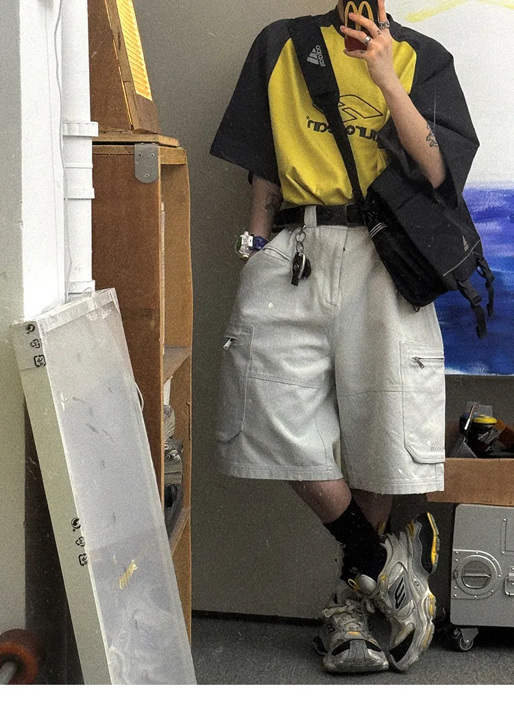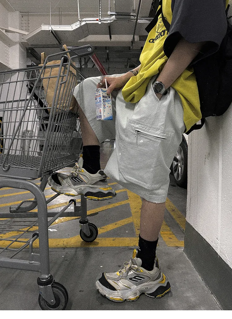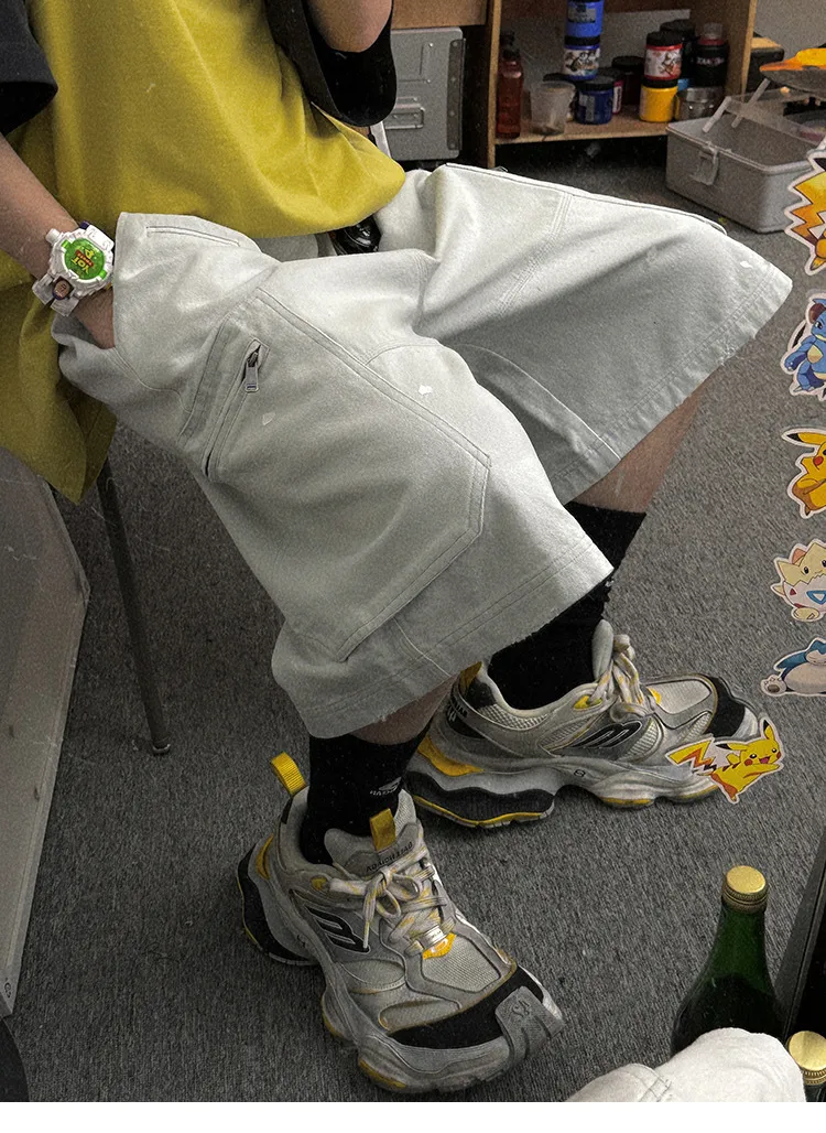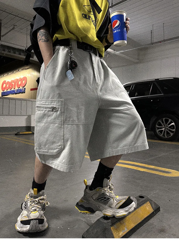 AUROCEAN 水洗做舊 破壞 重磅 工裝大口袋 短褲(灰白色)