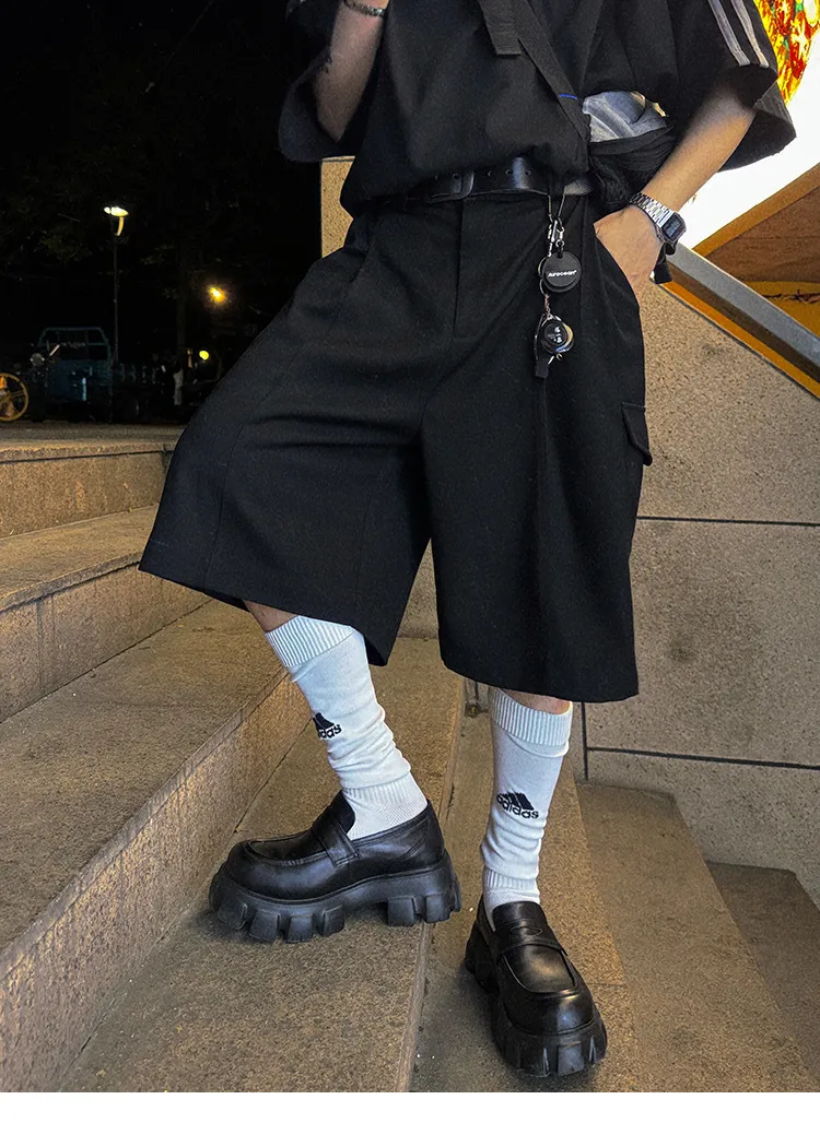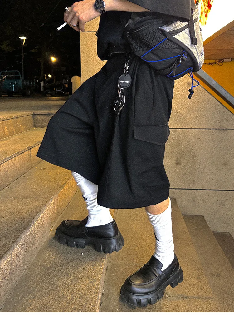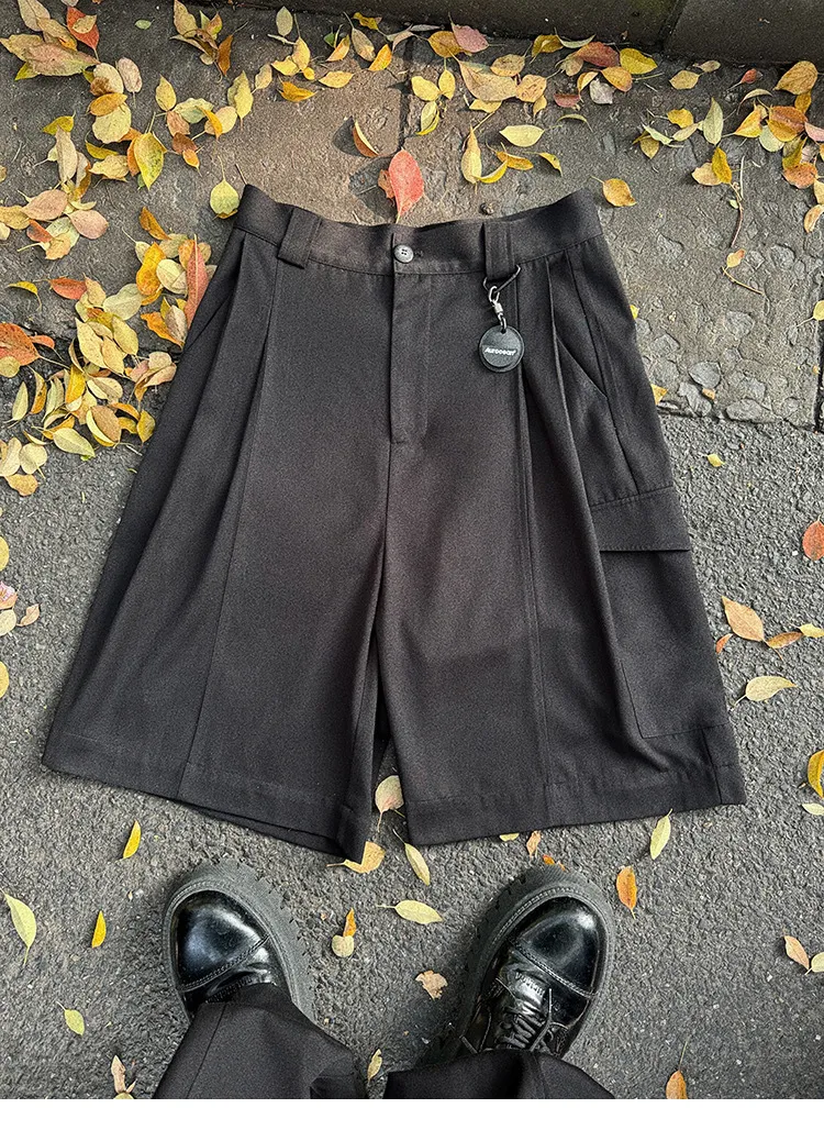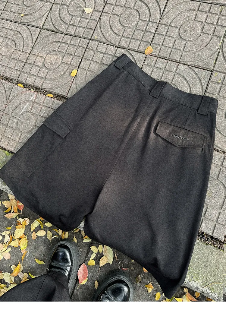AUROCEAN 抗皺 立體收摺 口袋 西裝 短褲 六分褲 附贈鑰匙圈(黑色)
