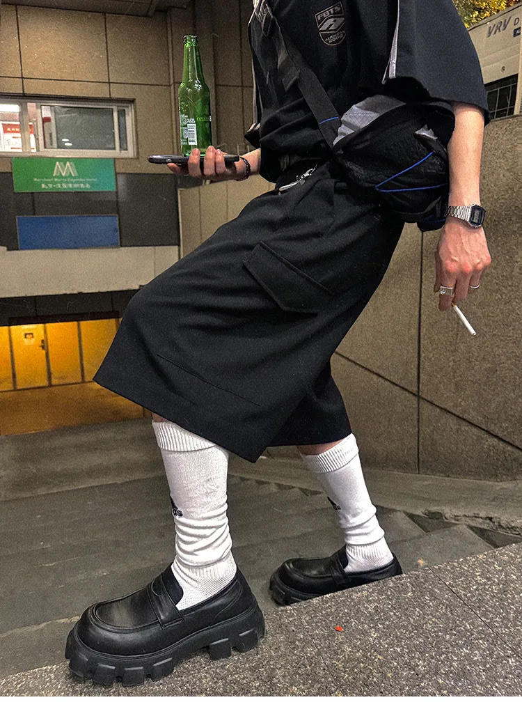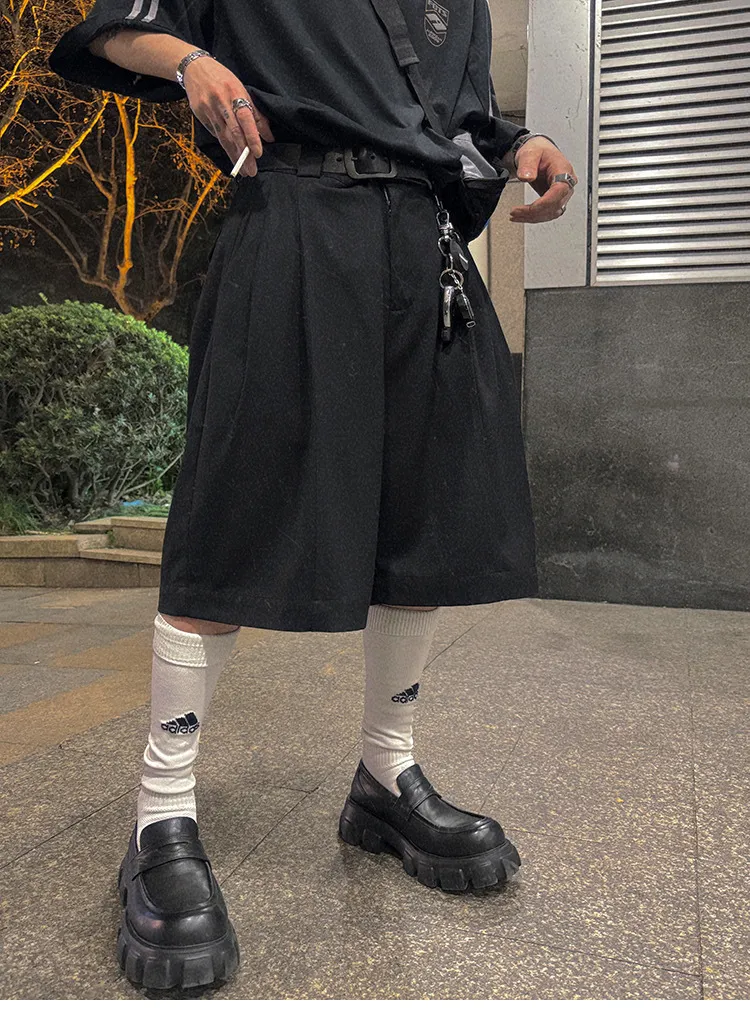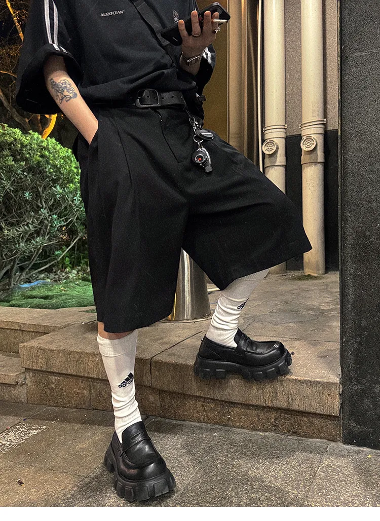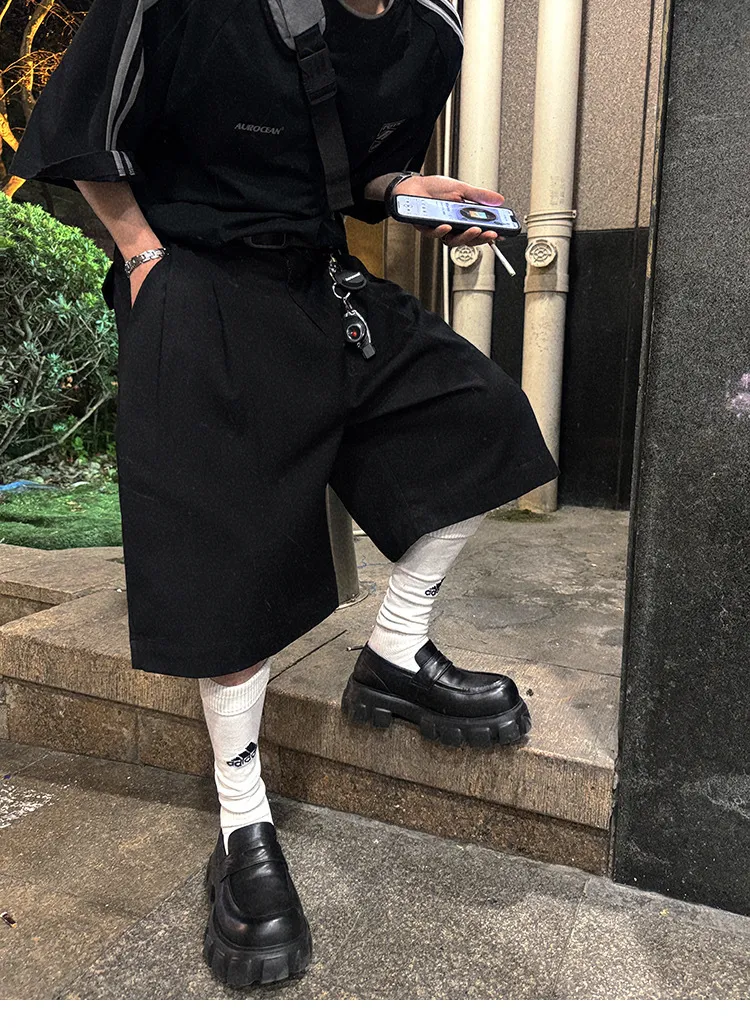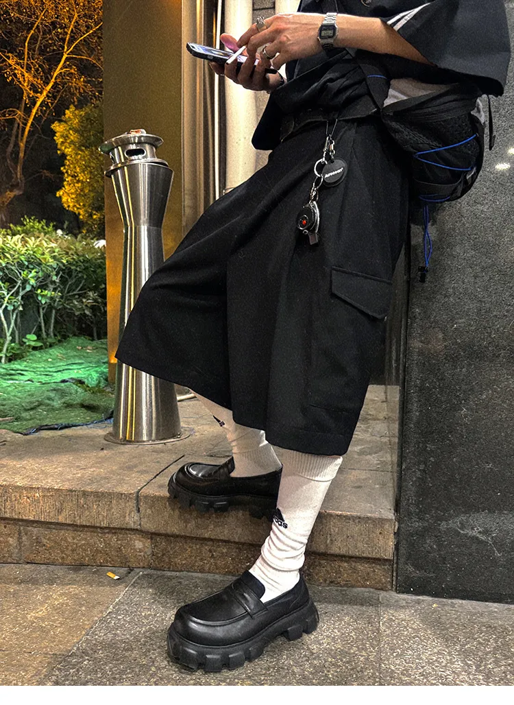 AUROCEAN 抗皺 立體收摺 口袋 西裝 短褲 六分褲 附贈鑰匙圈(黑色)