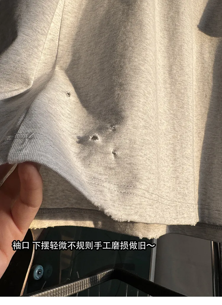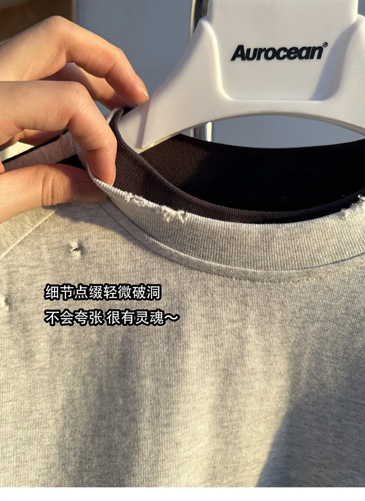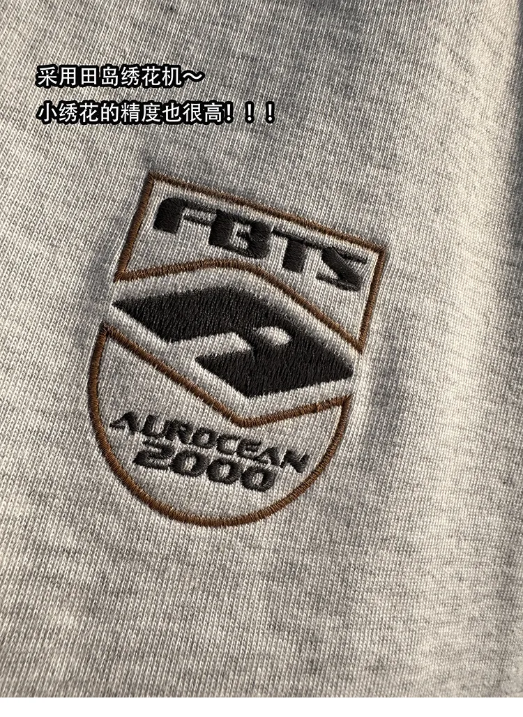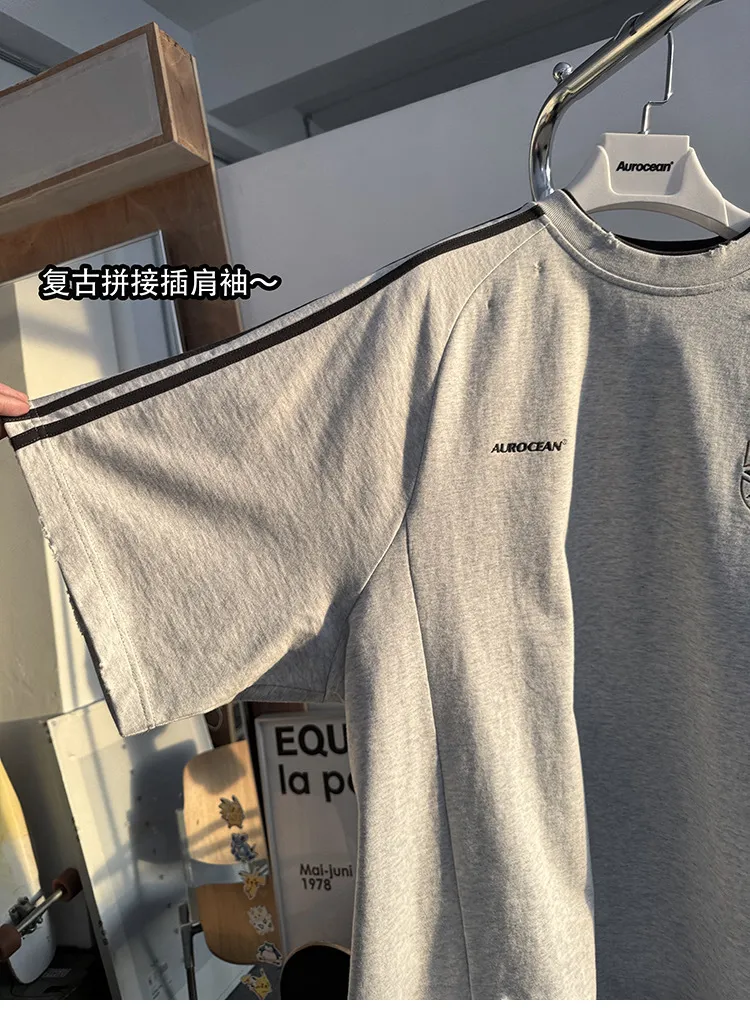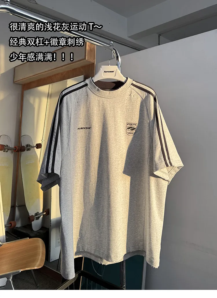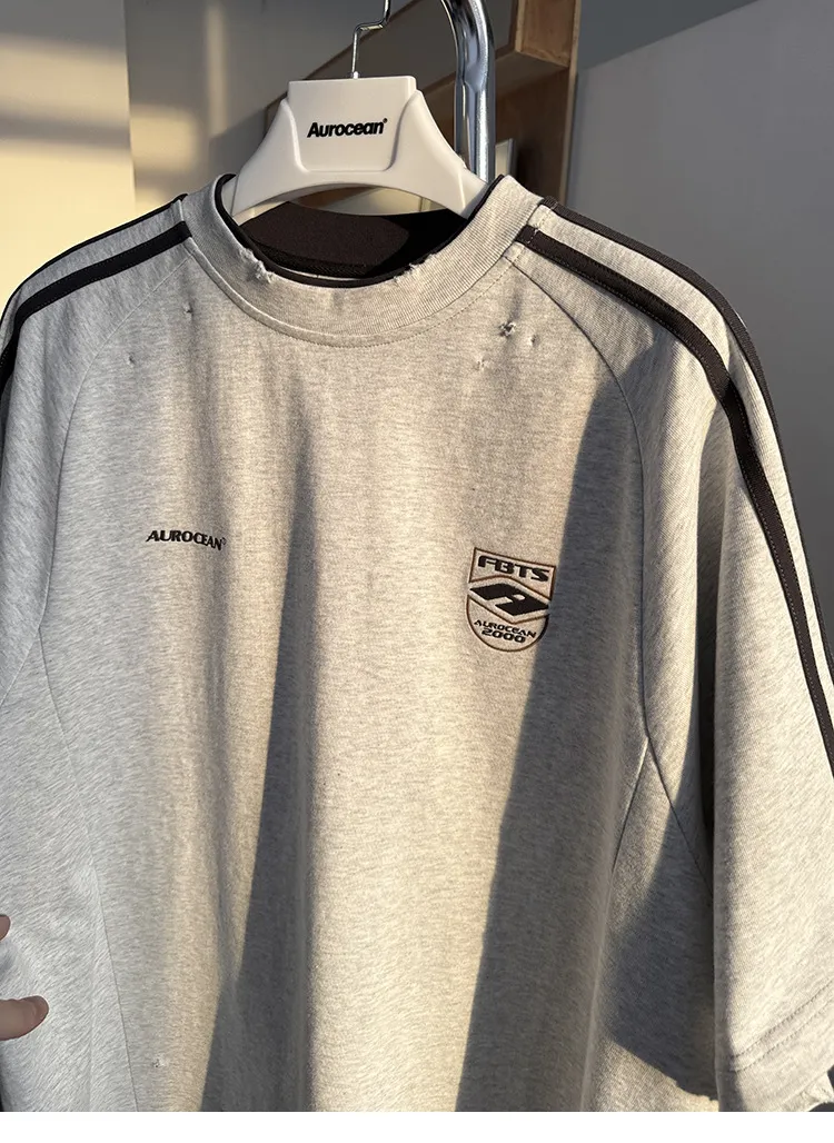 AUROCEAN 復古運動風 破壞感 雙層領 徽章刺繡 重磅 短袖 TEE(灰色)