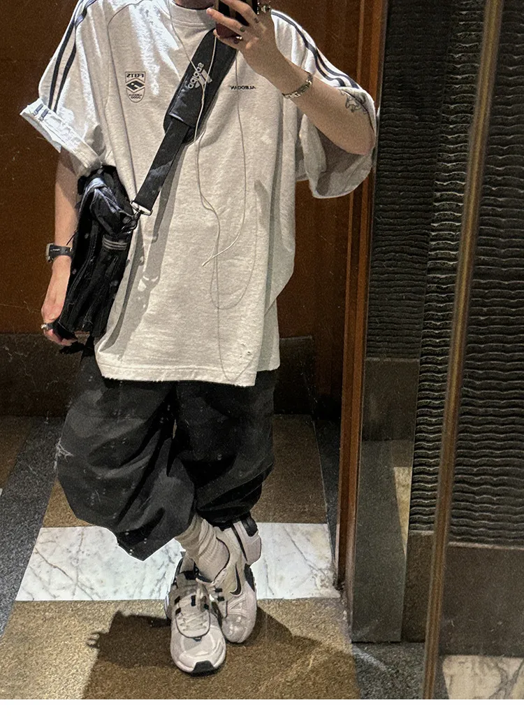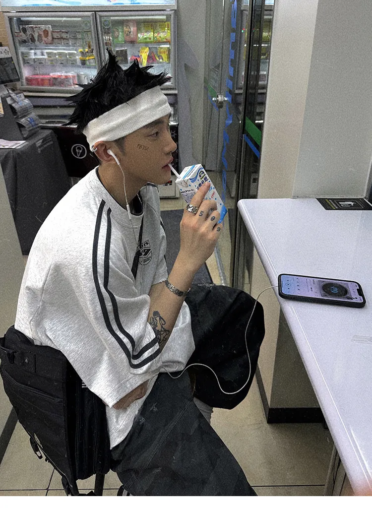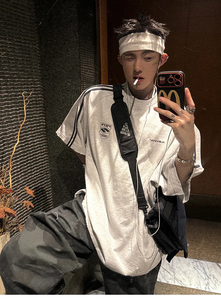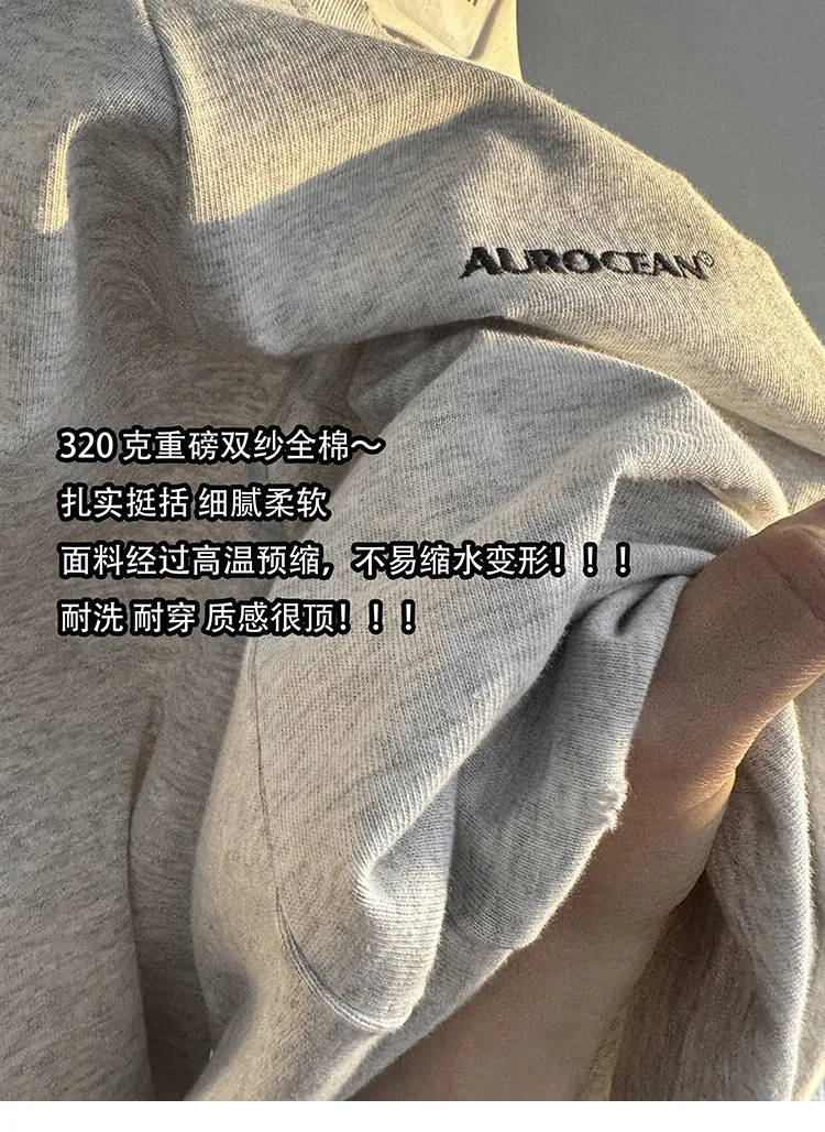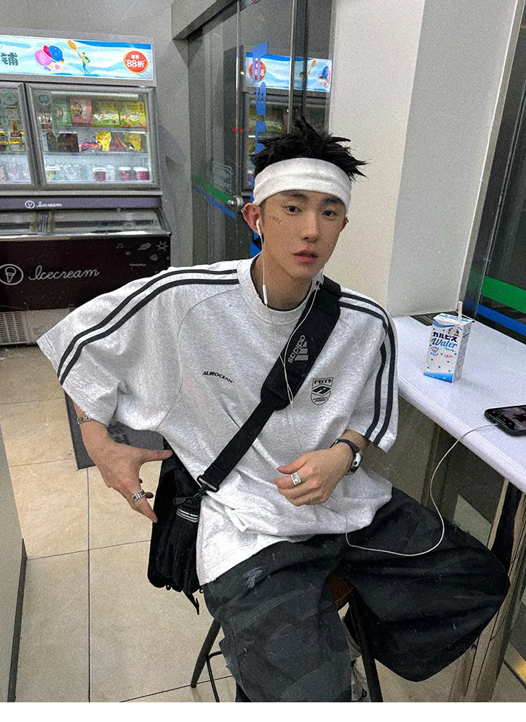 AUROCEAN 復古運動風 破壞感 雙層領 徽章刺繡 重磅 短袖 TEE(灰色)