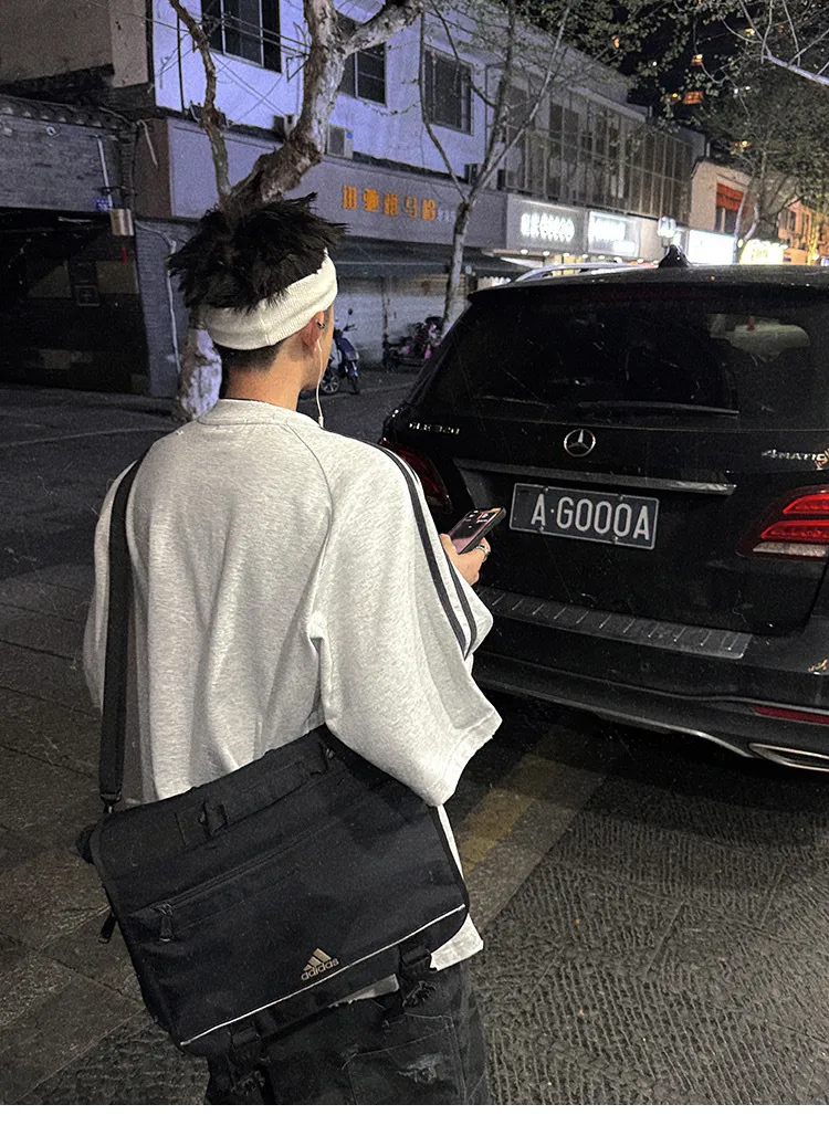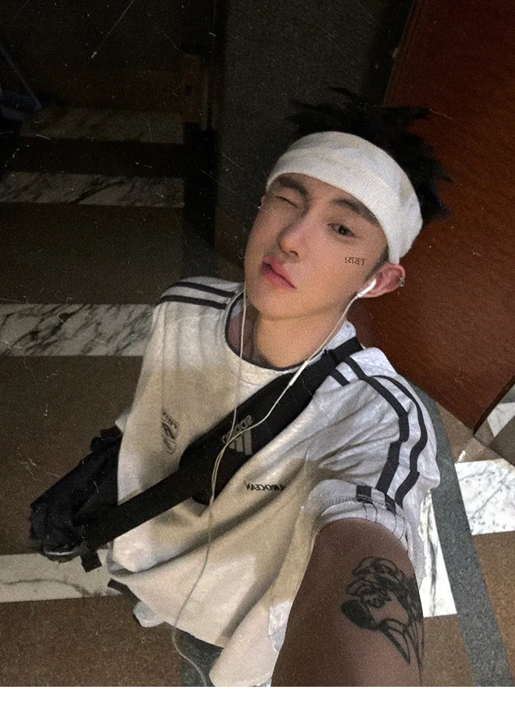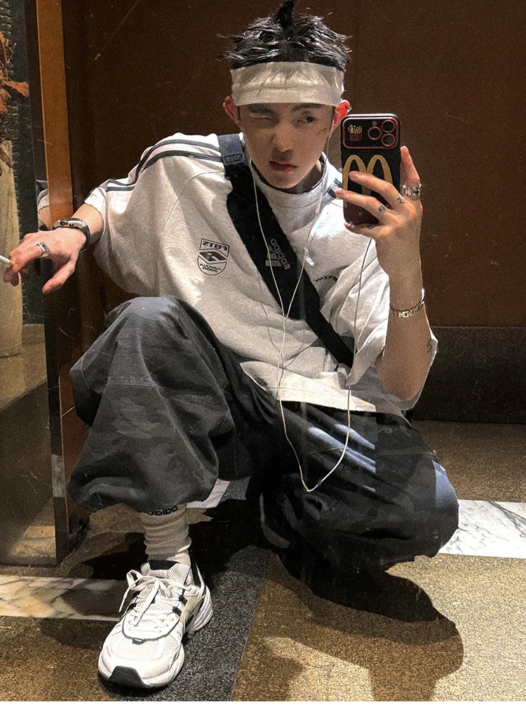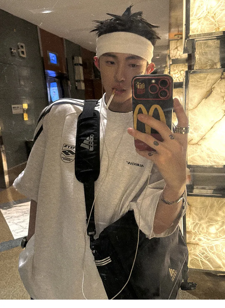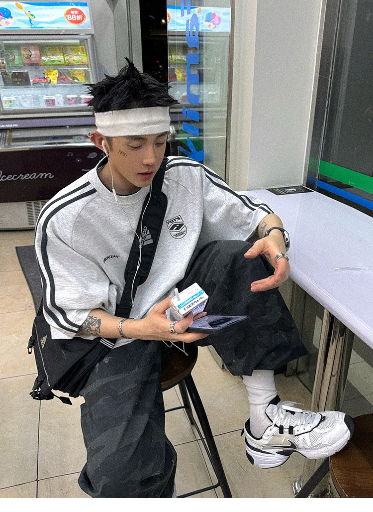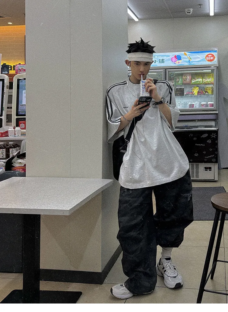 AUROCEAN 復古運動風 破壞感 雙層領 徽章刺繡 重磅 短袖 TEE(灰色)