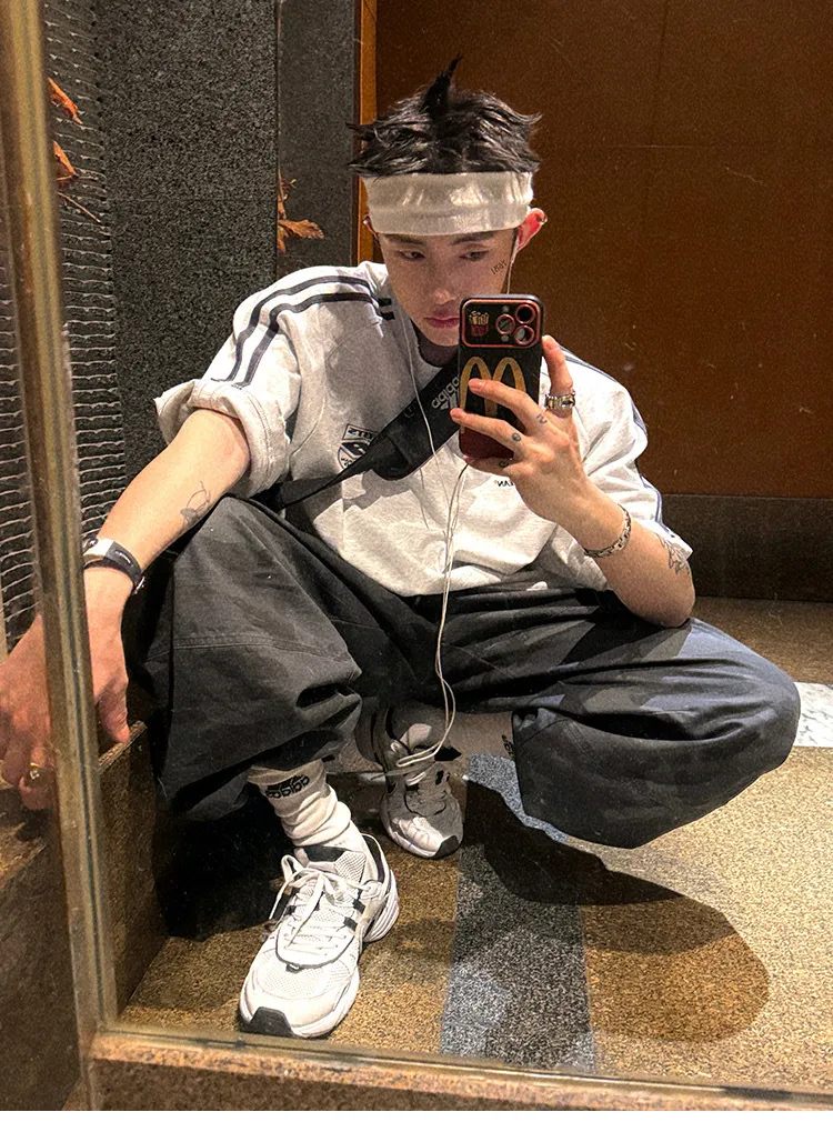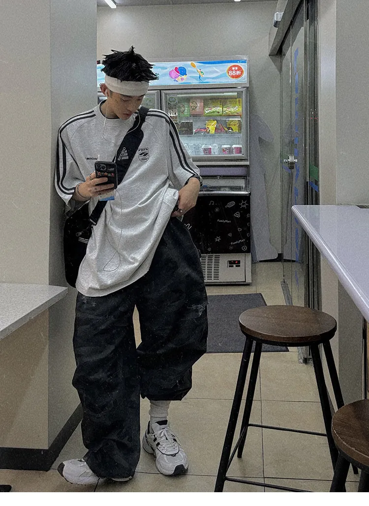 AUROCEAN 訂製水洗 暗紋 破壞 迷彩 闊腿 工裝褲 長褲(淺灰色)