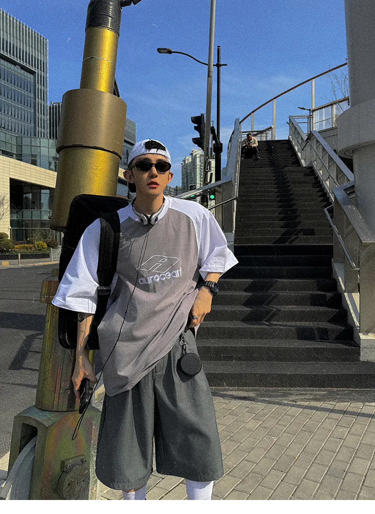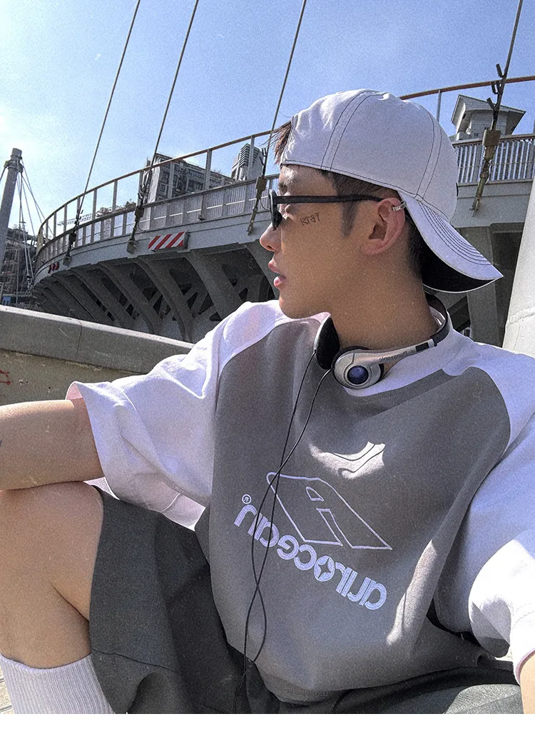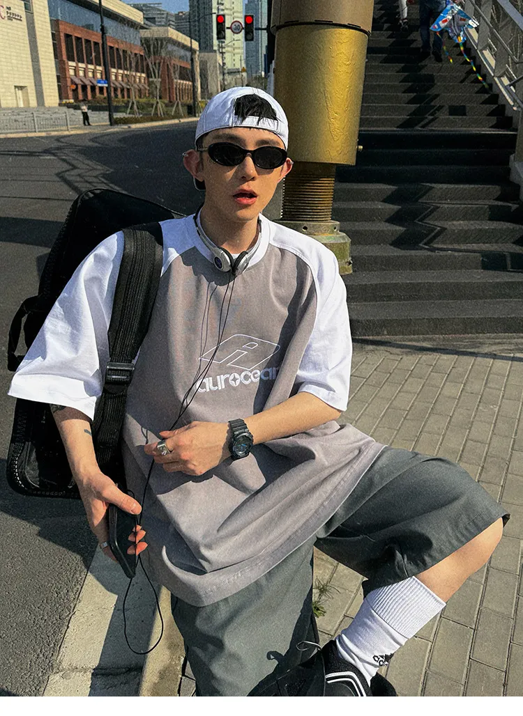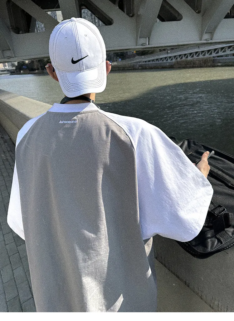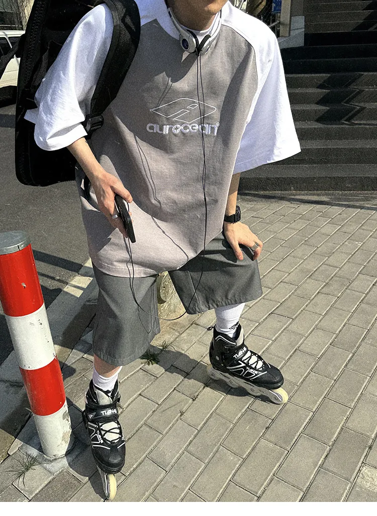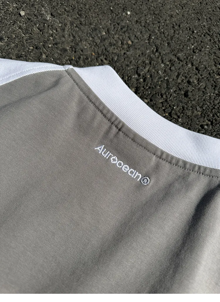 AUROCEAN 復古運動風 破壞感 雙層領 徽章刺繡 重磅 短袖 TEE(灰色)