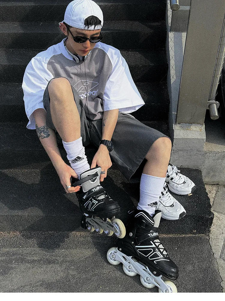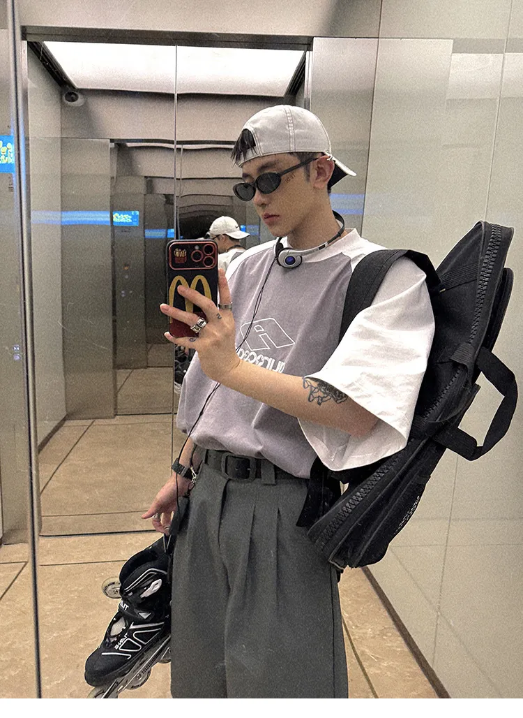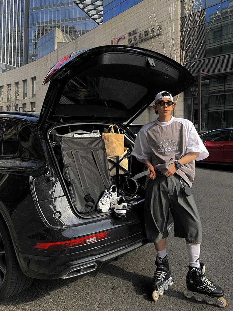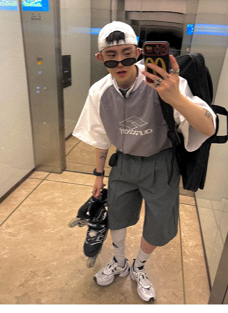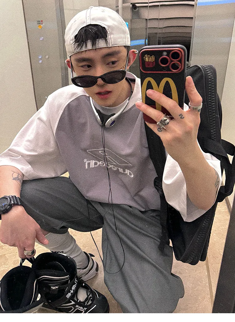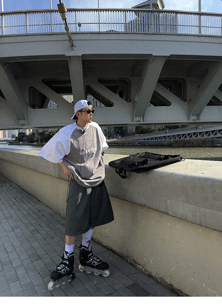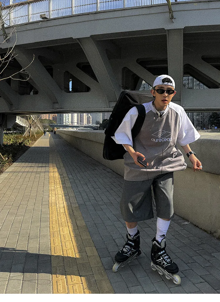 AUROCEAN 復古運動風 破壞感 雙層領 徽章刺繡 重磅 短袖 TEE(灰色)