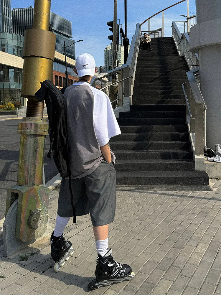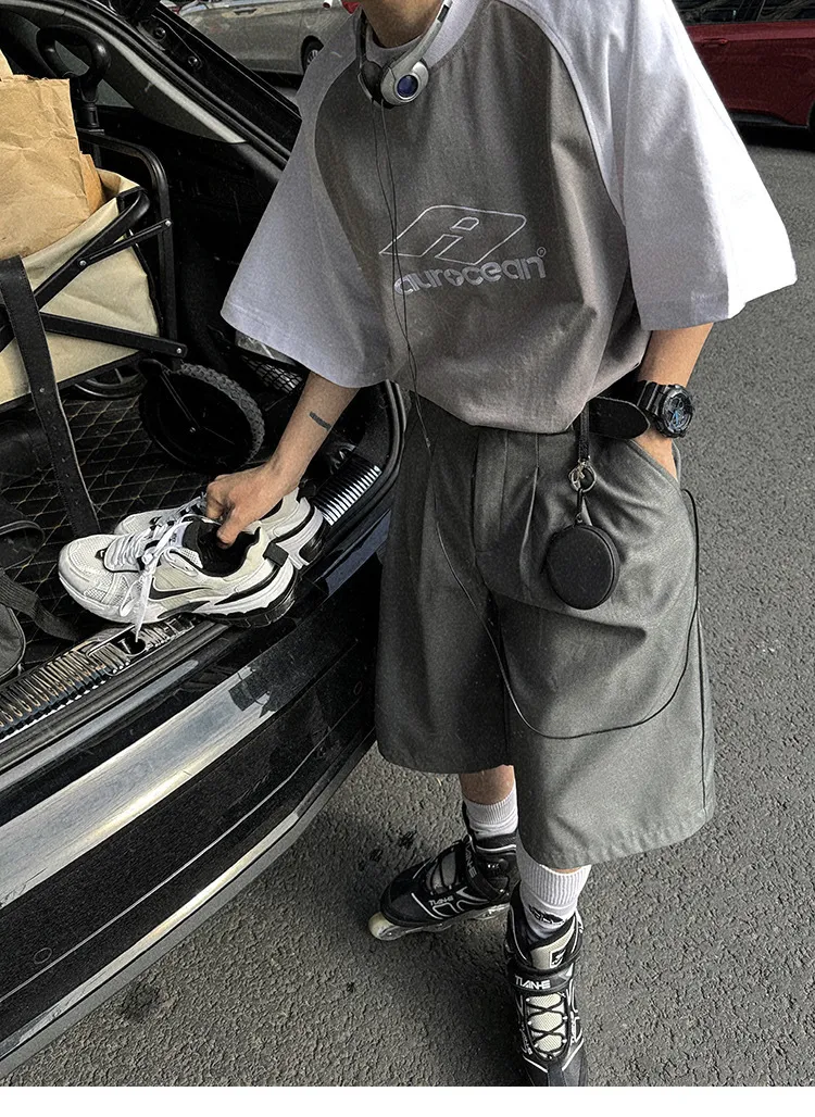 AUROCEAN 水洗做舊 破壞 重磅 工裝大口袋 短褲(灰白色)