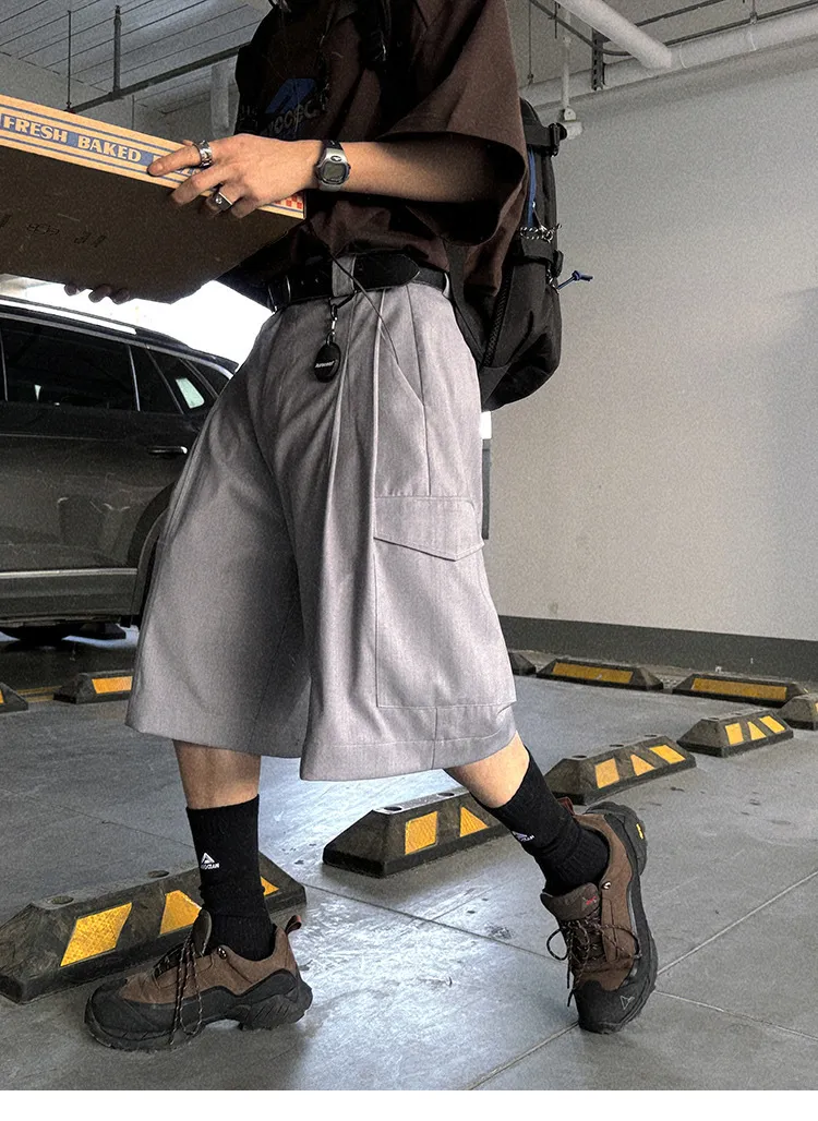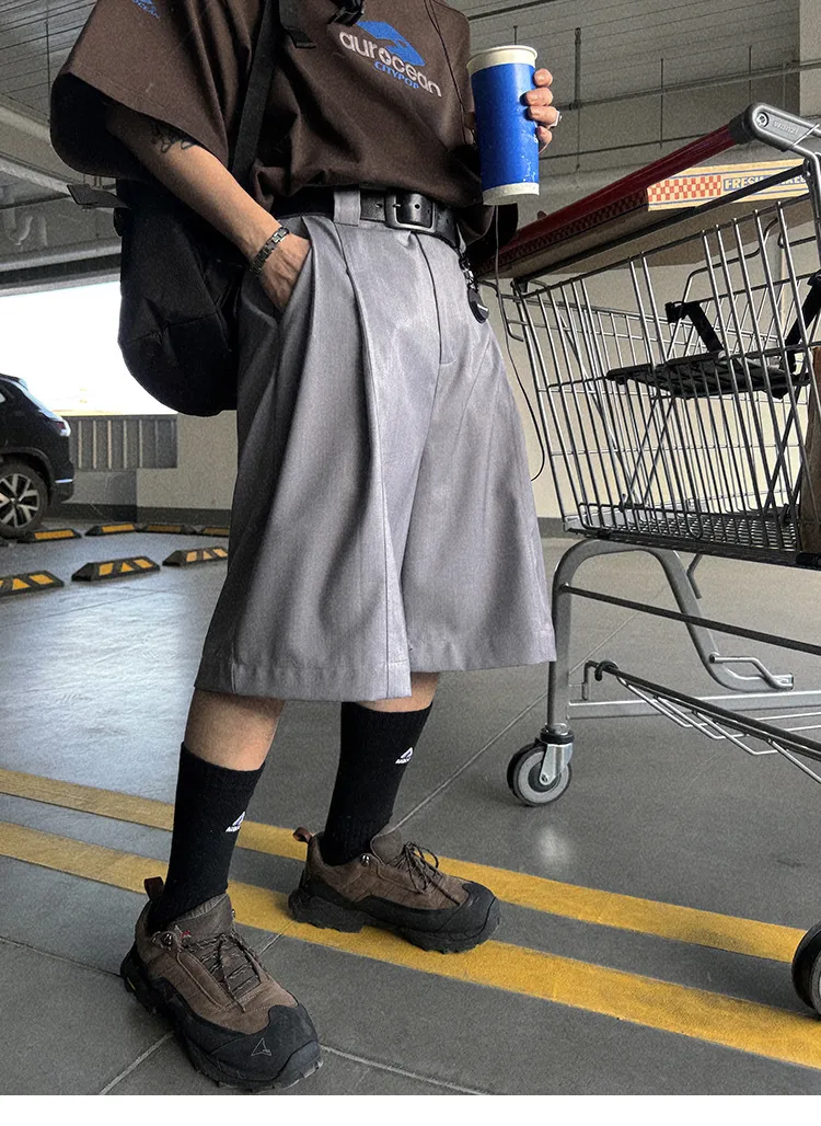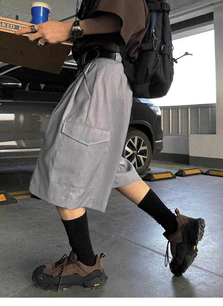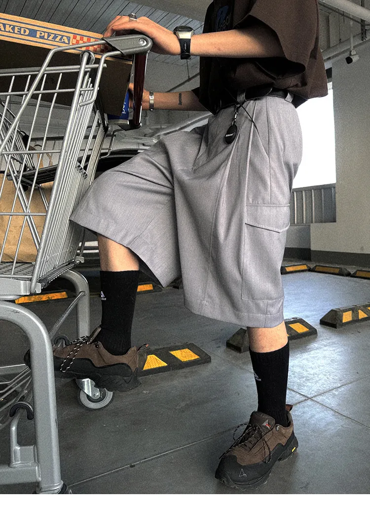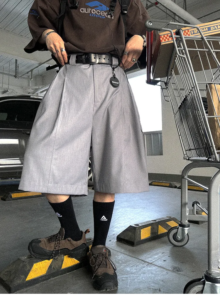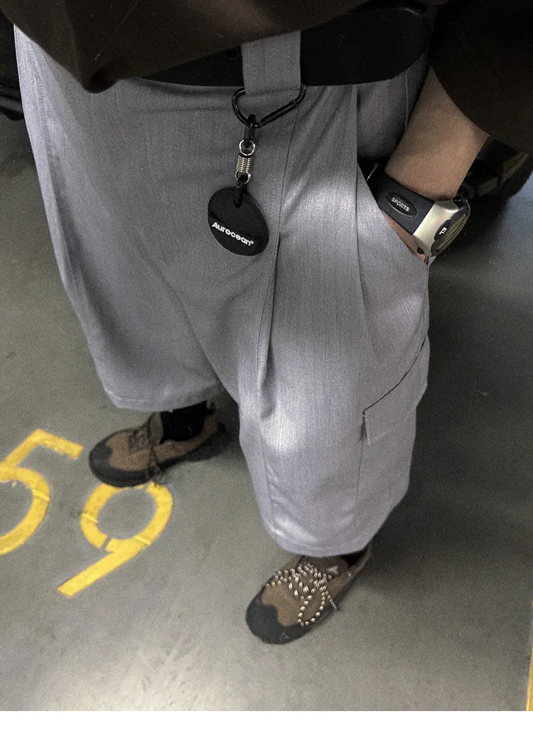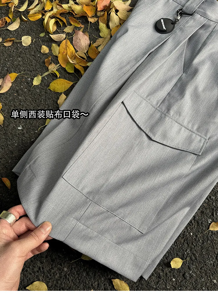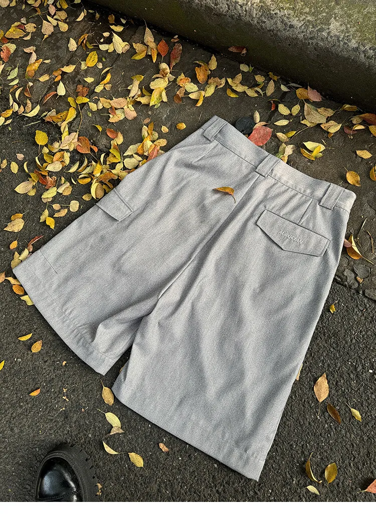 AUROCEAN 抗皺 立體收摺 口袋 西裝 短褲 六分褲 附贈鑰匙圈(灰色)
