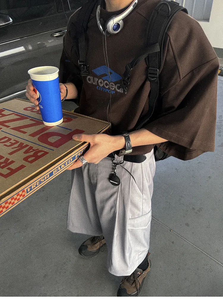 AUROCEAN 訂製水洗 暗紋 破壞 迷彩 寬版 六分褲 短褲(深灰色)