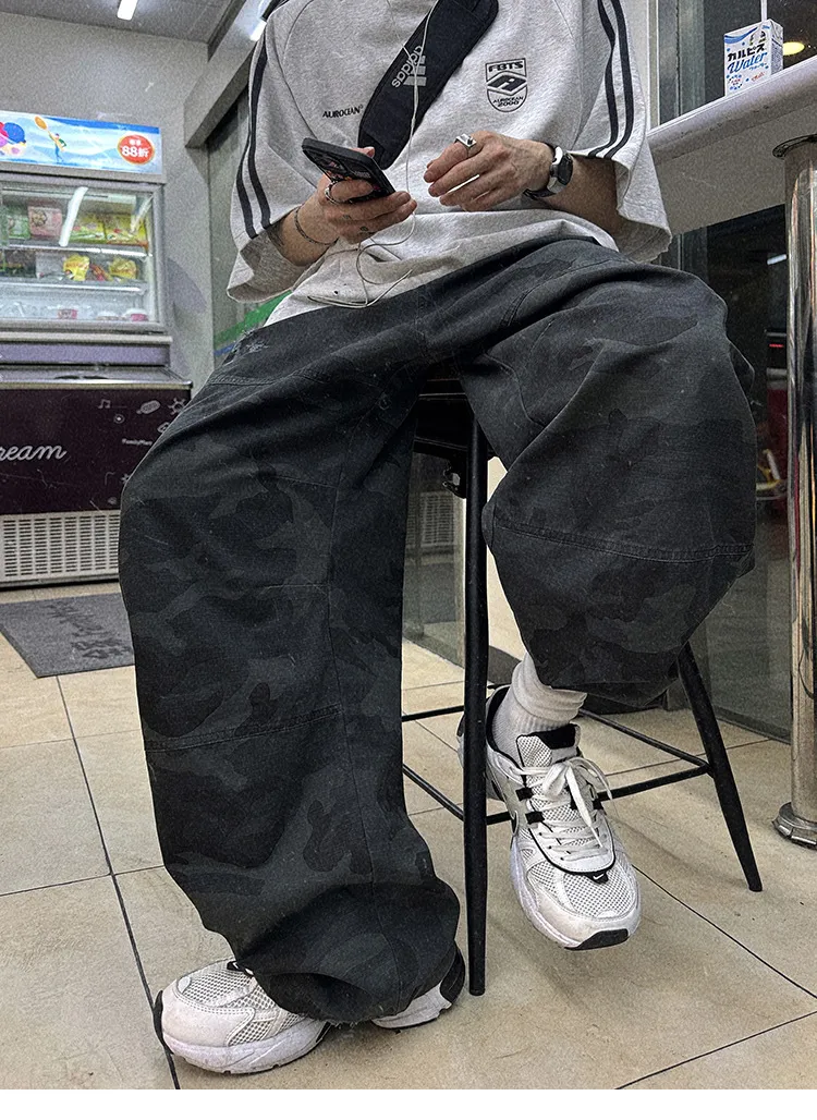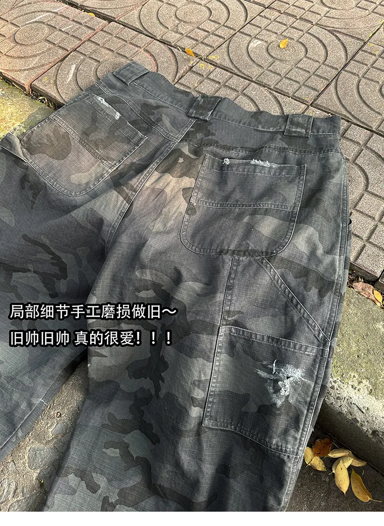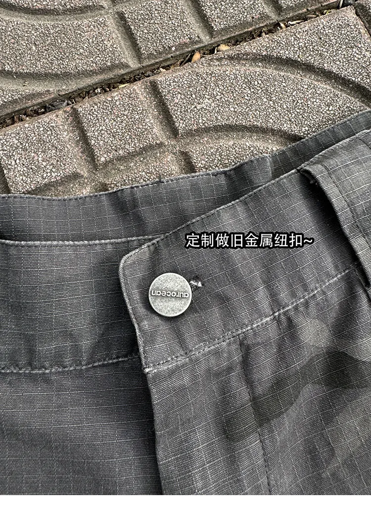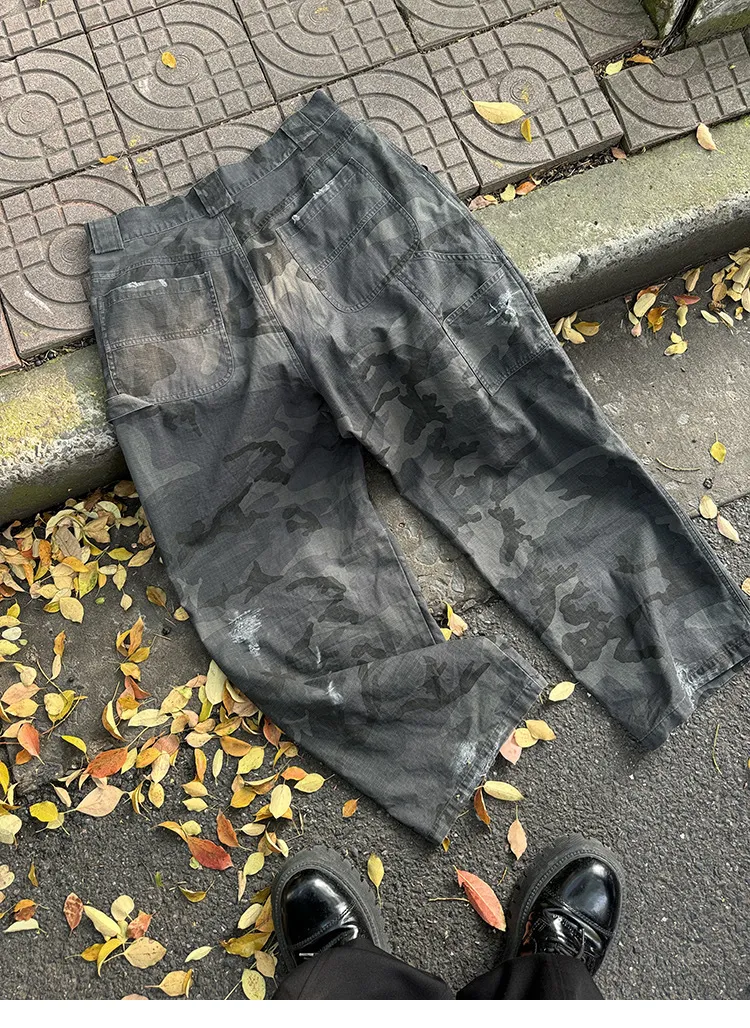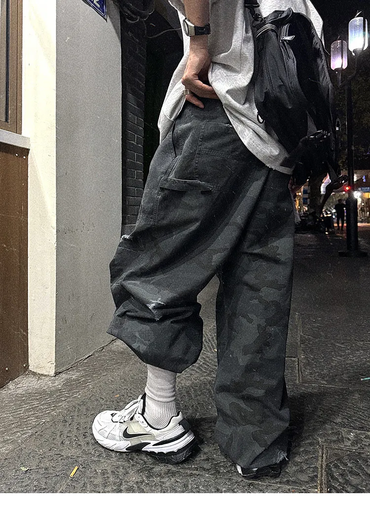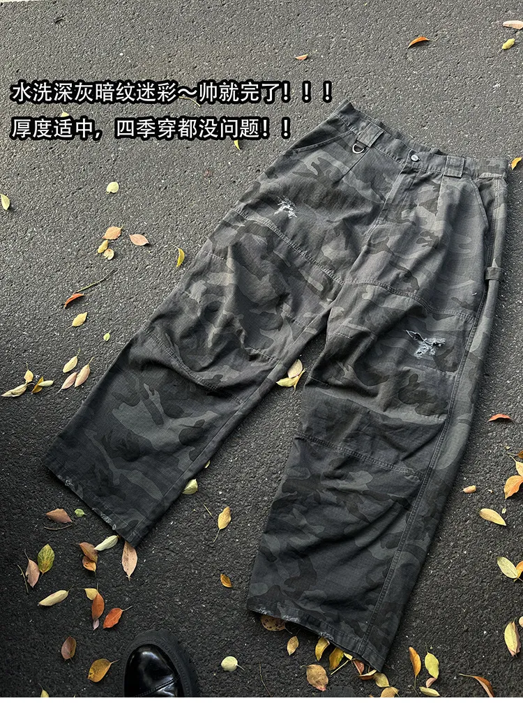AUROCEAN 訂製水洗 暗紋 破壞 迷彩 闊腿 工裝褲 長褲(深灰色)