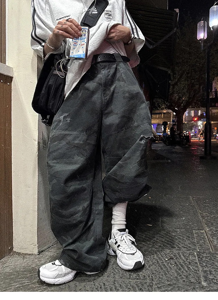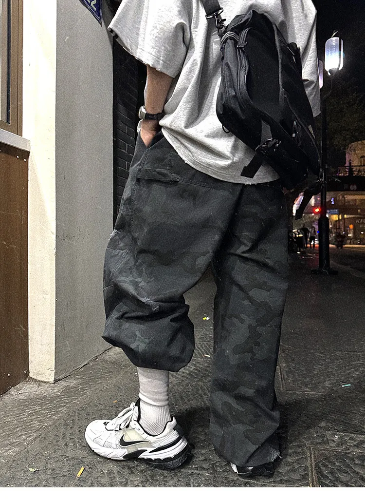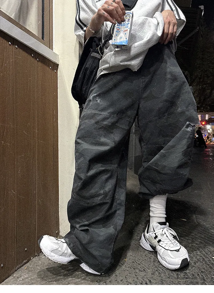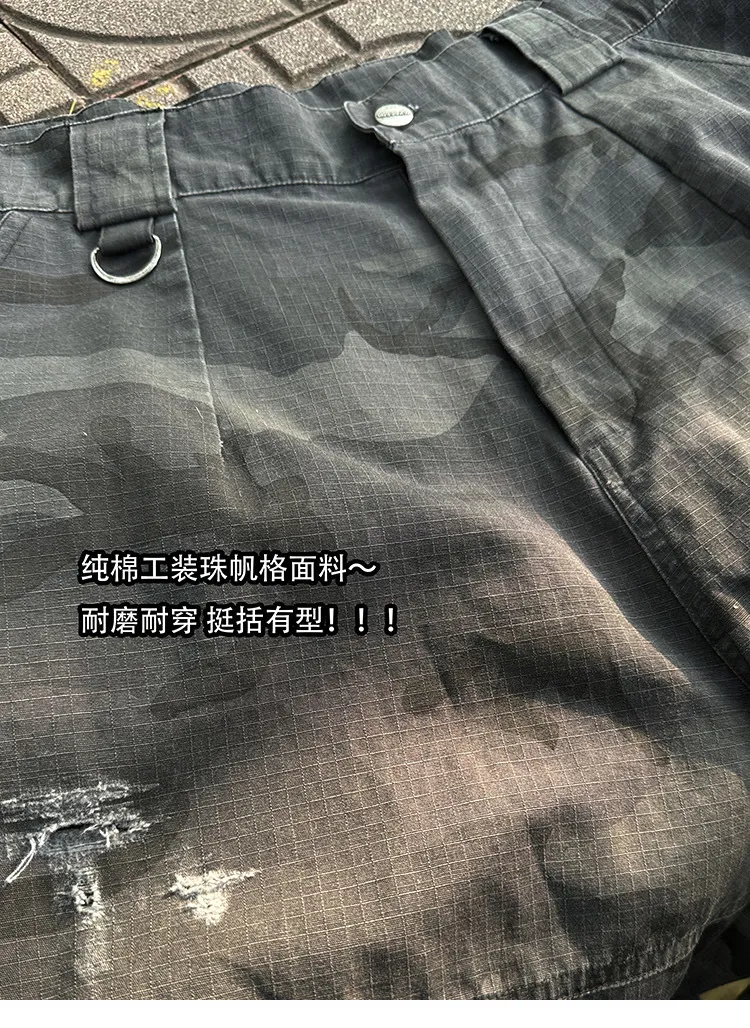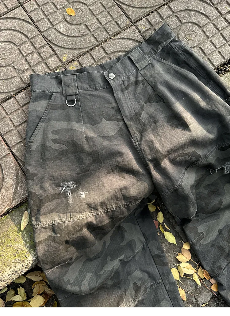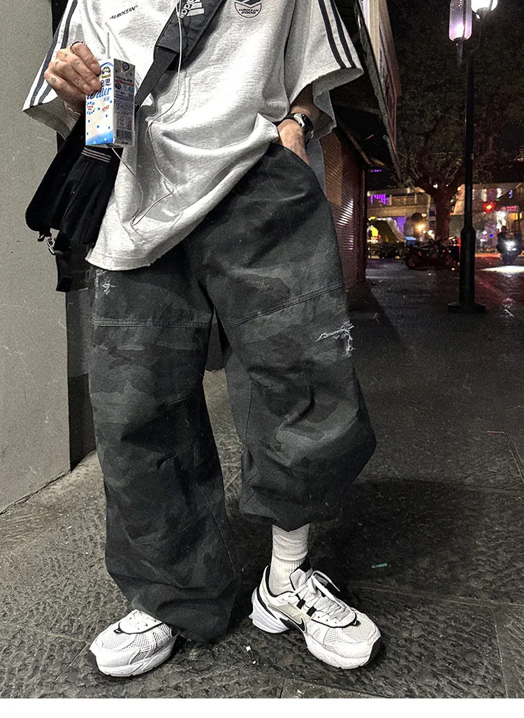 AUROCEAN 訂製水洗 暗紋 破壞 迷彩 闊腿 工裝褲 長褲(深灰色)