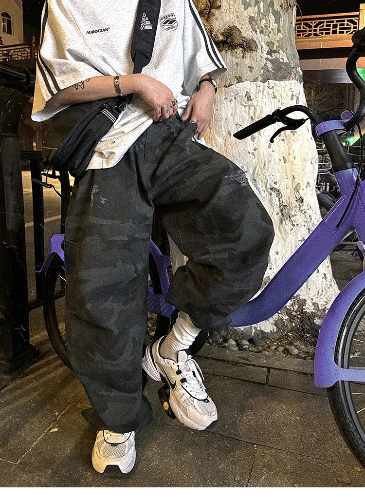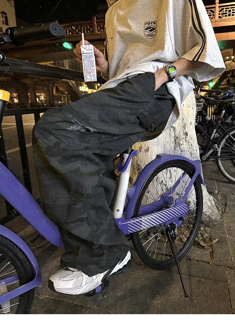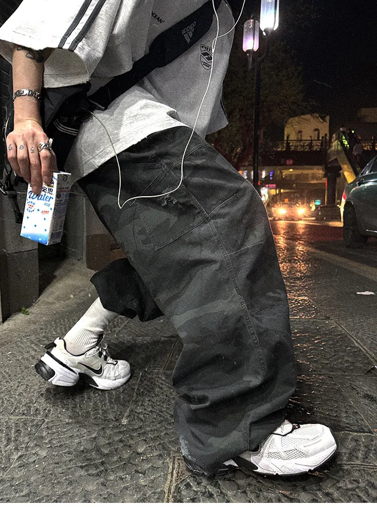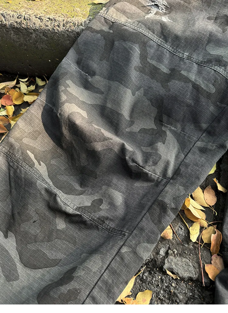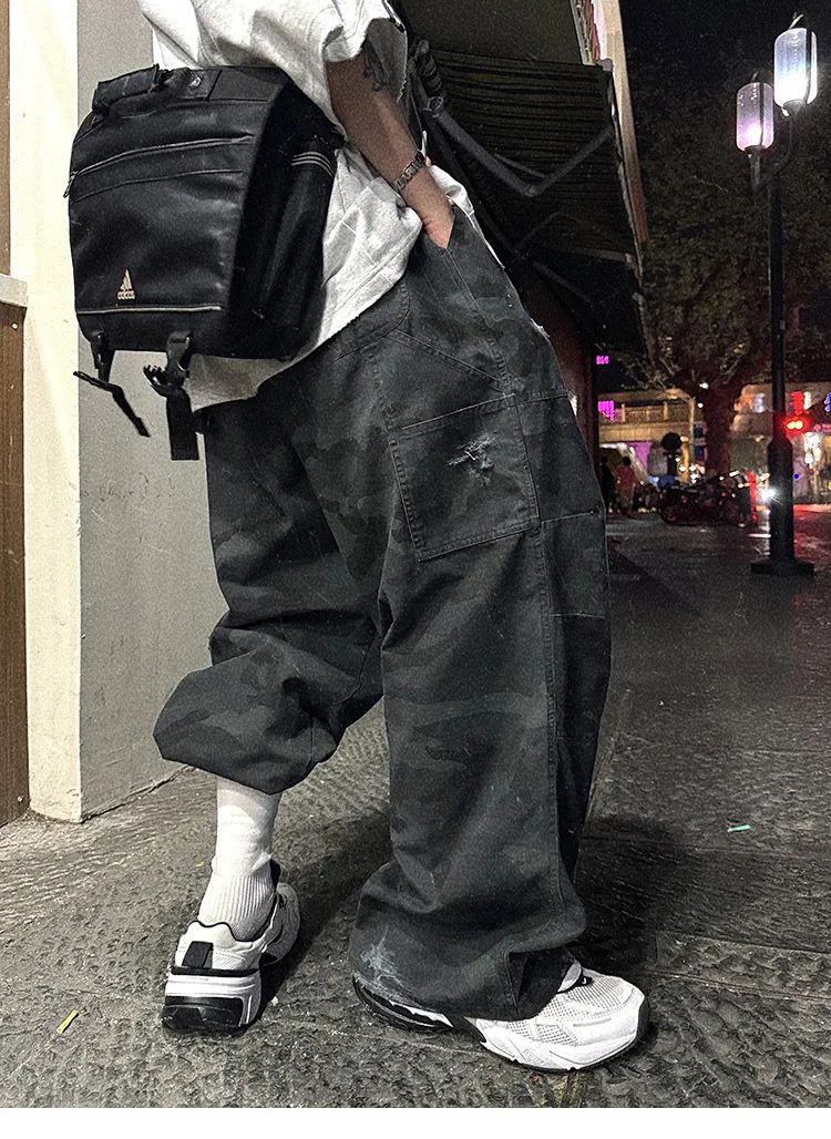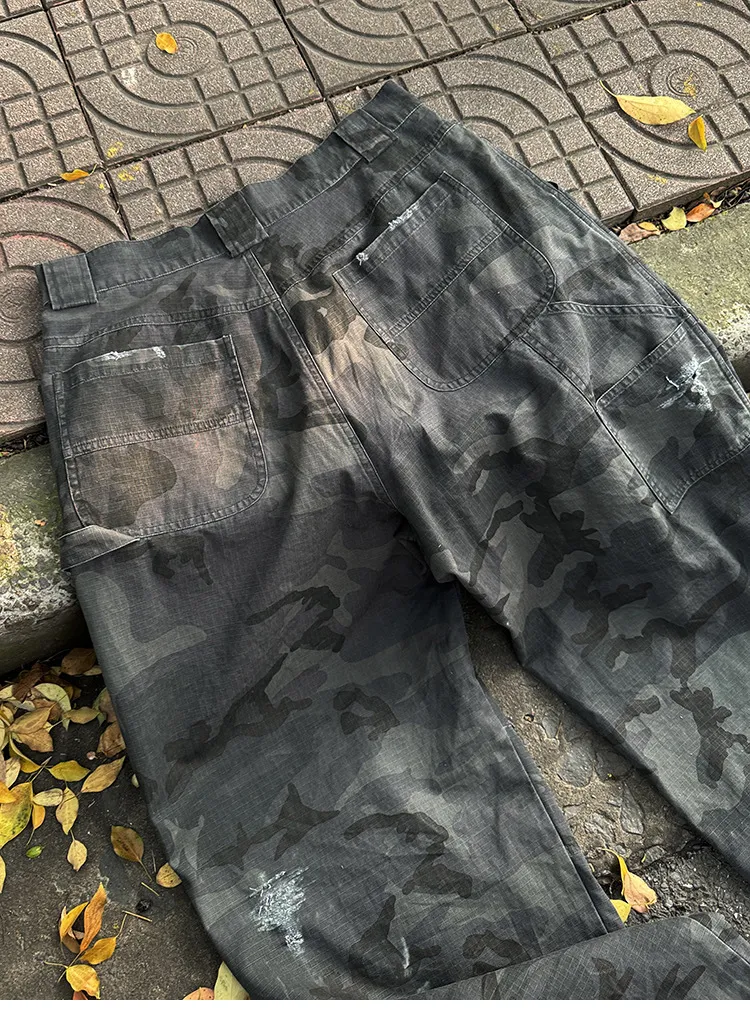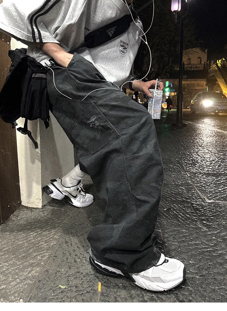 AUROCEAN 訂製水洗 暗紋 破壞 迷彩 闊腿 工裝褲 長褲(深灰色)