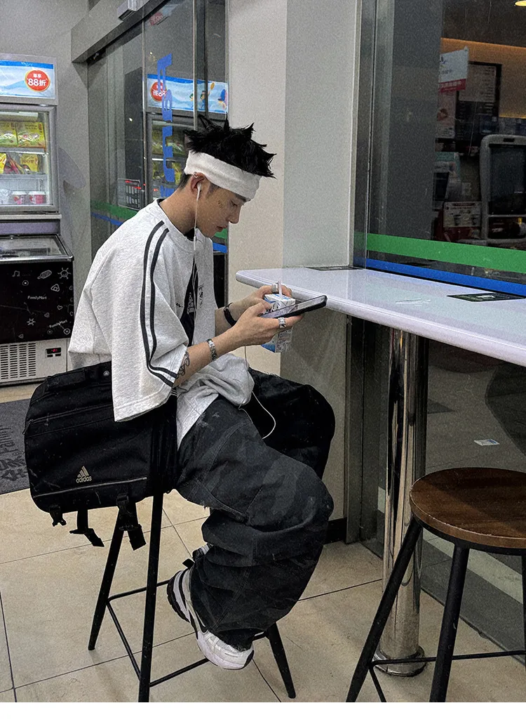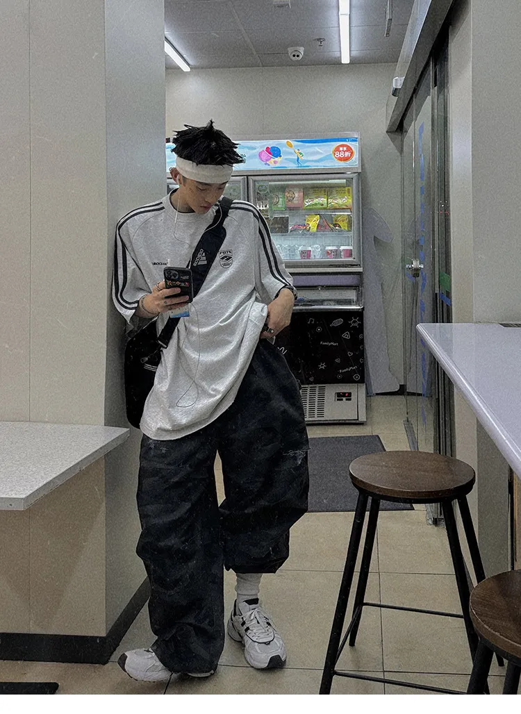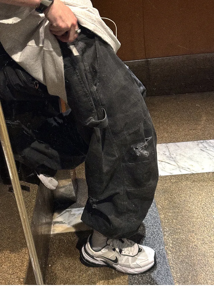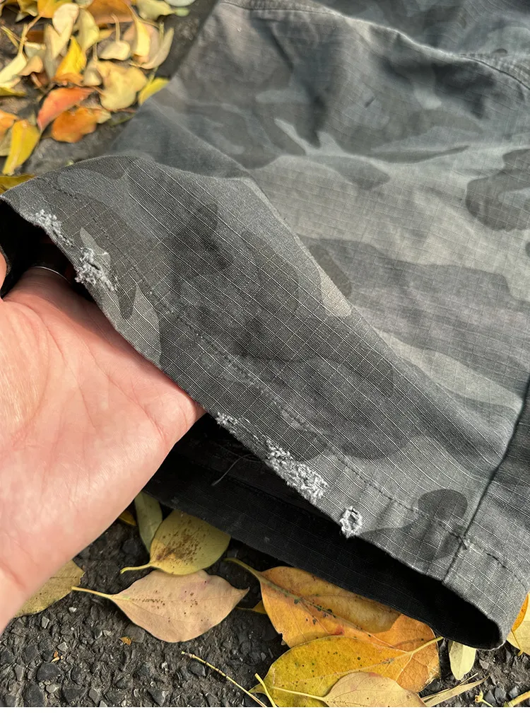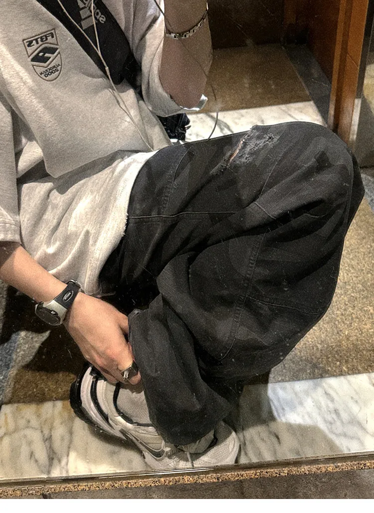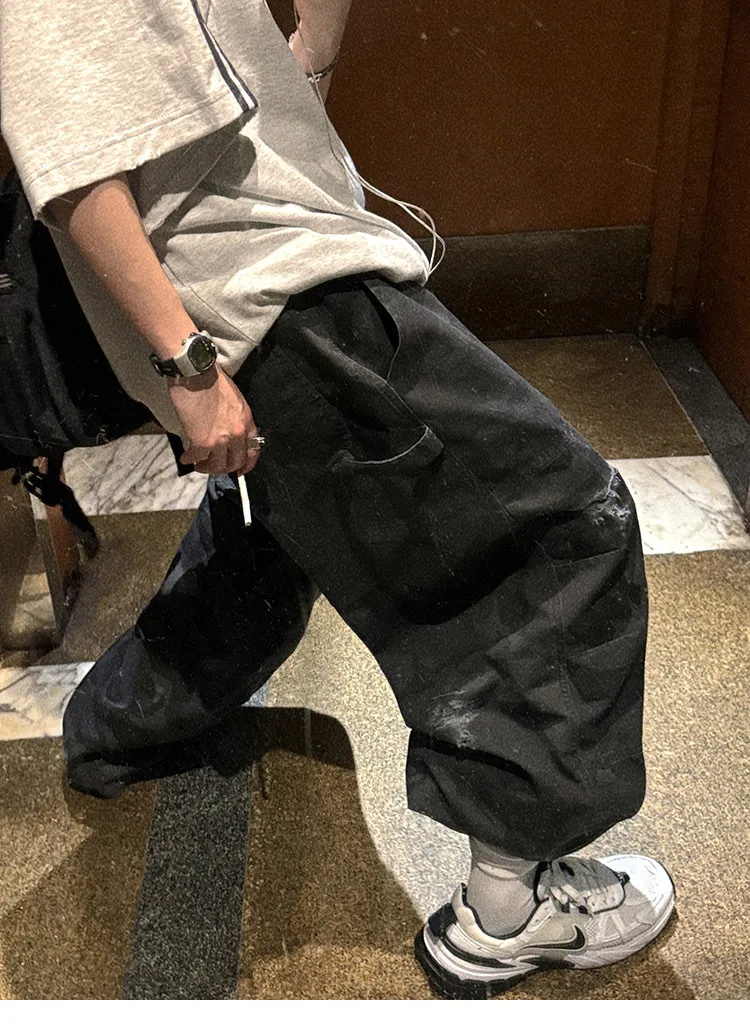 AUROCEAN 訂製水洗 暗紋 破壞 迷彩 闊腿 工裝褲 長褲(深灰色)