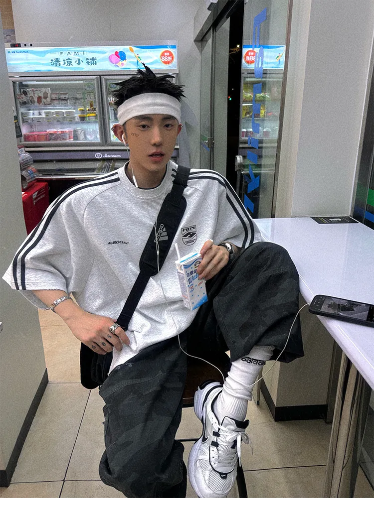 AUROCEAN 復古運動風 破壞感 雙層領 徽章刺繡 重磅 短袖 TEE(灰色)