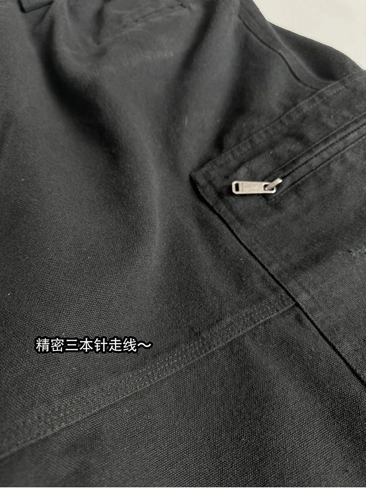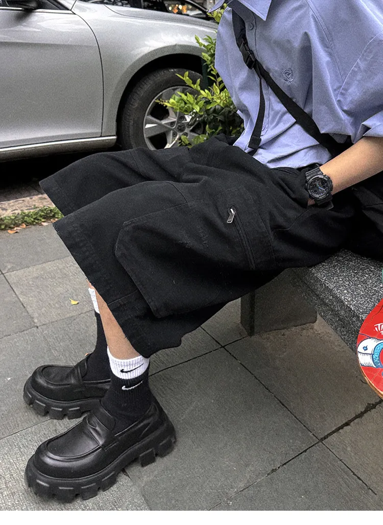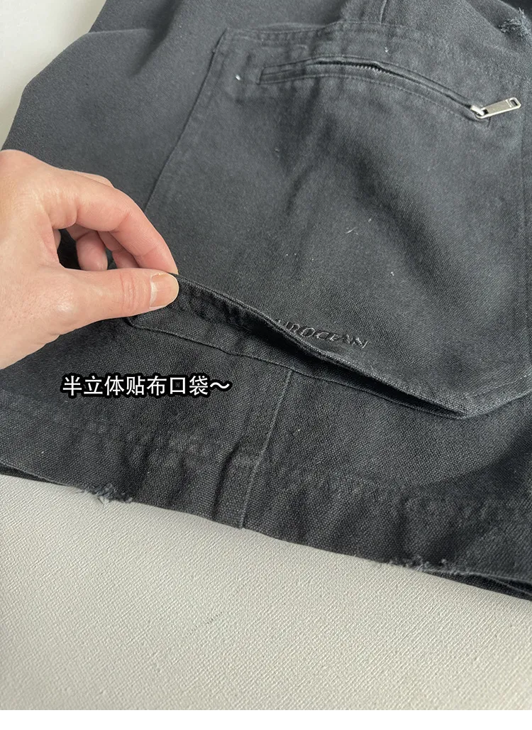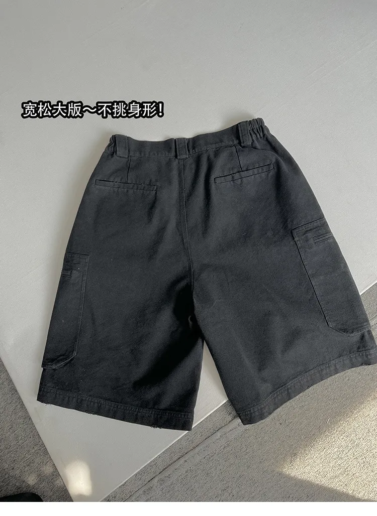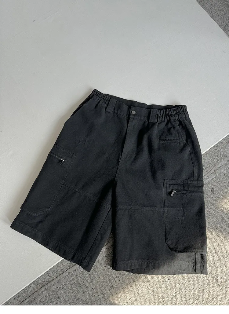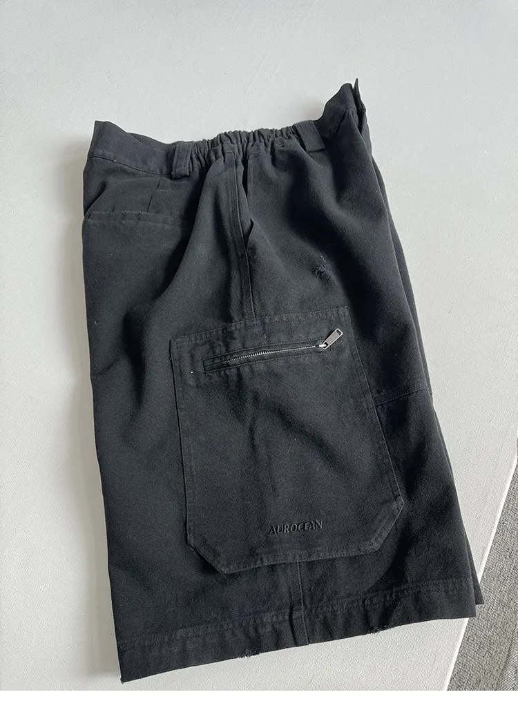AUROCEAN 水洗做舊 破壞 重磅 工裝大口袋 短褲(黑色)
