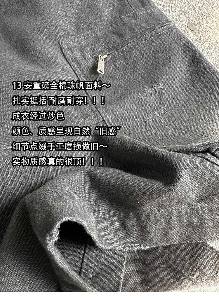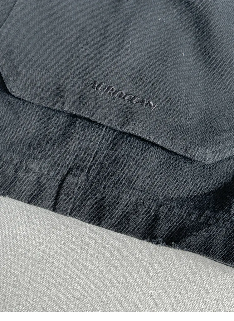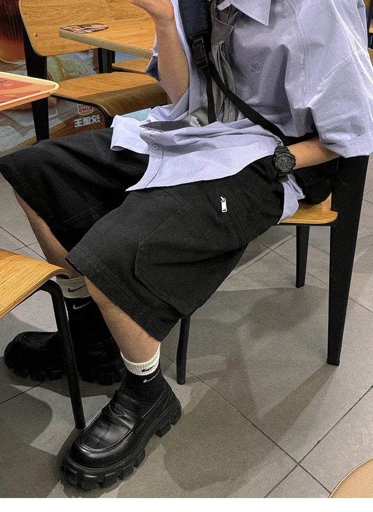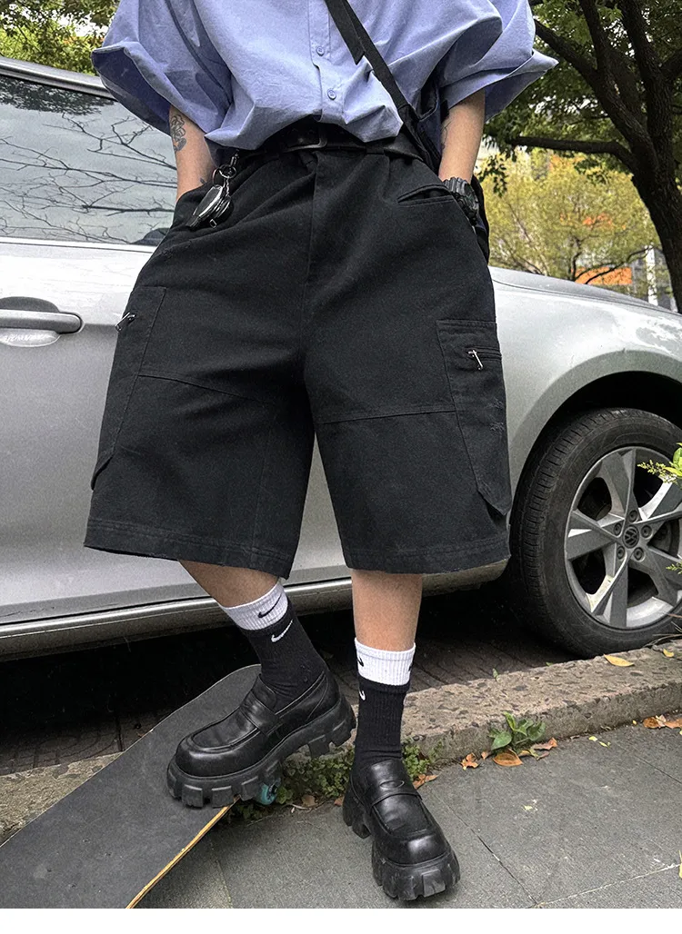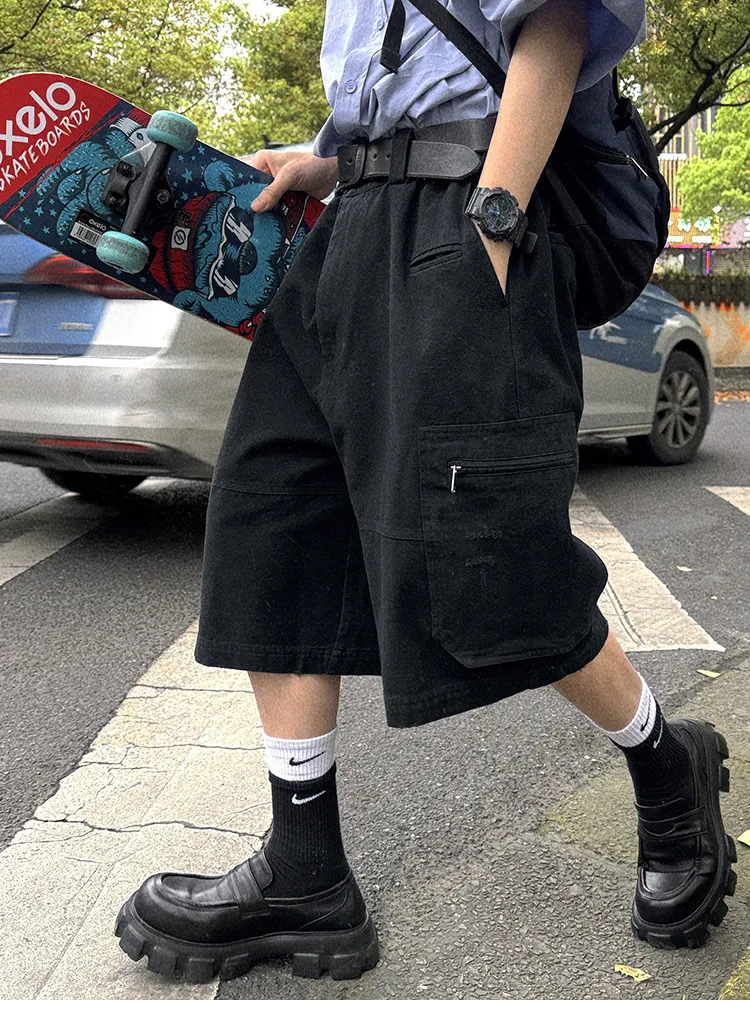 AUROCEAN 水洗做舊 破壞 重磅 工裝大口袋 短褲(黑色)