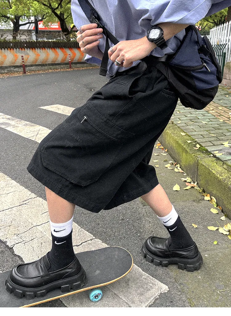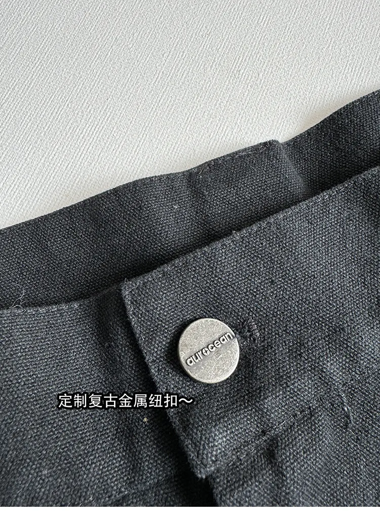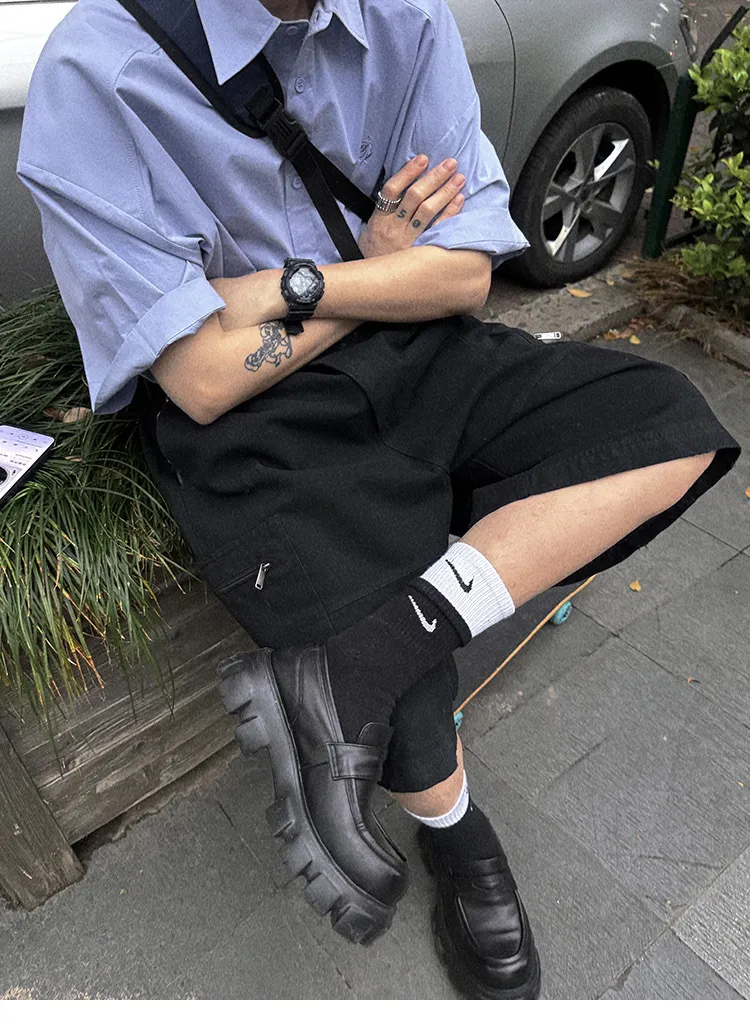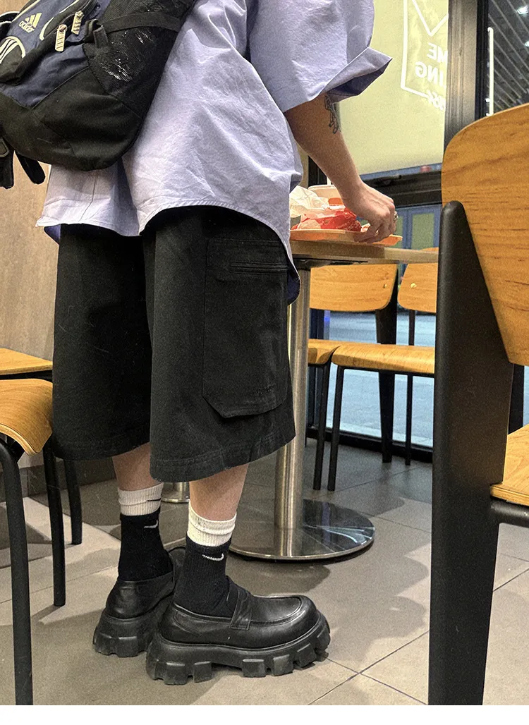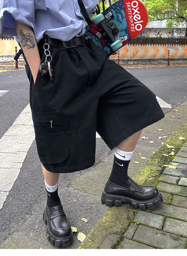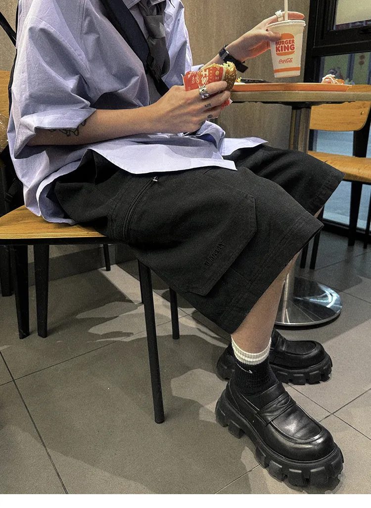 AUROCEAN 水洗做舊 破壞 重磅 工裝大口袋 短褲(黑色)