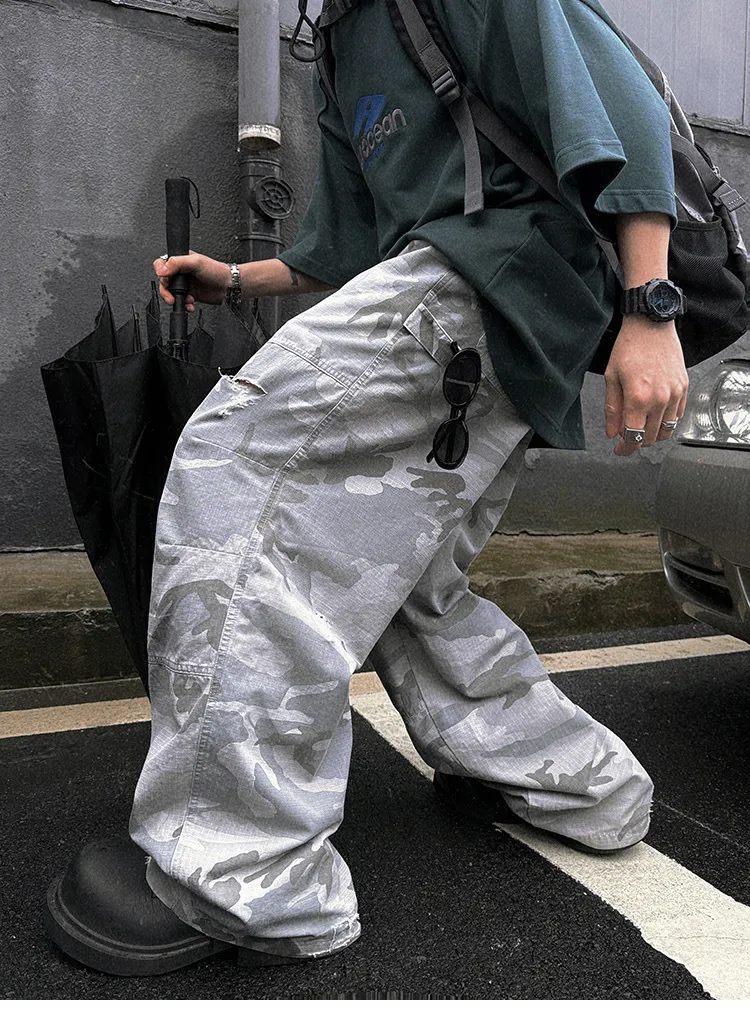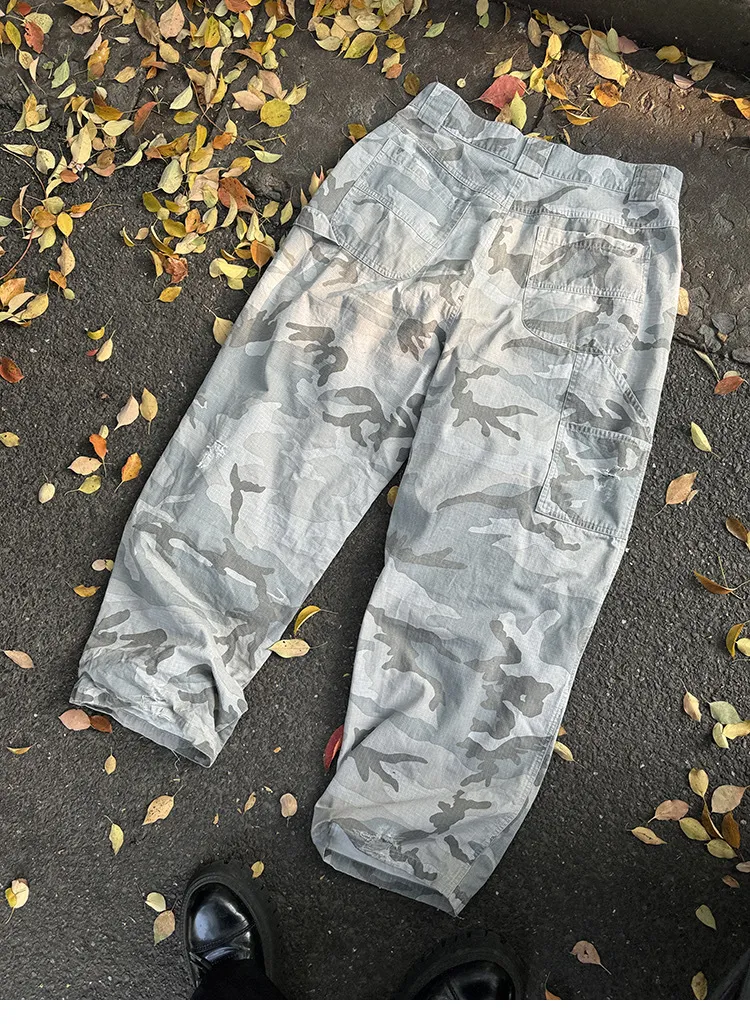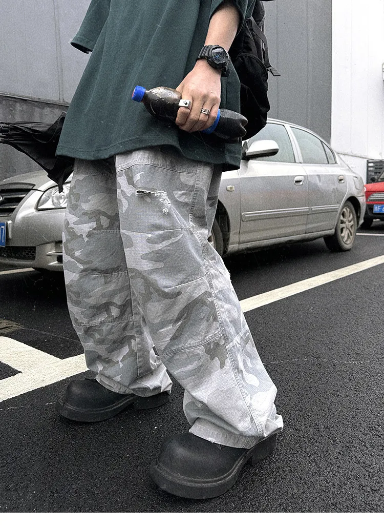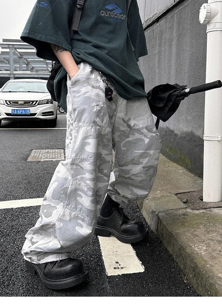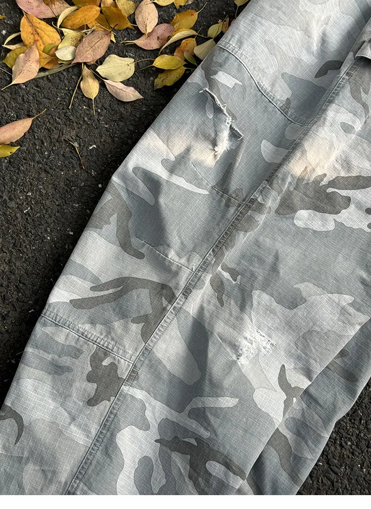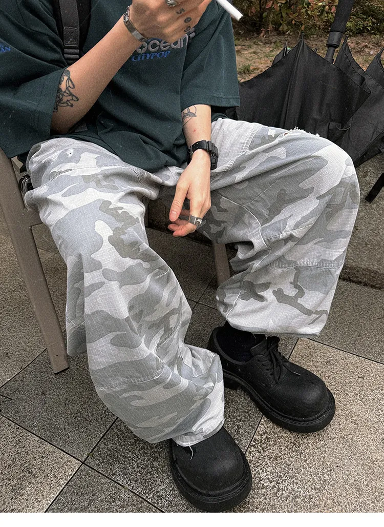 AUROCEAN 訂製水洗 暗紋 破壞 迷彩 闊腿 工裝褲 長褲(淺灰色)