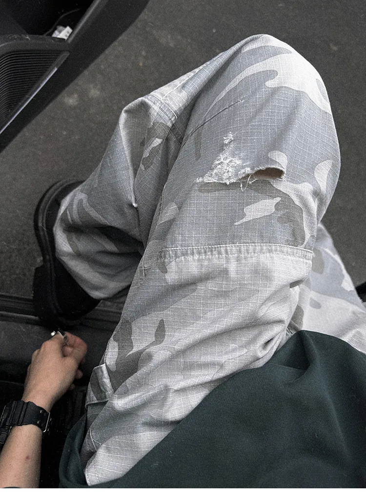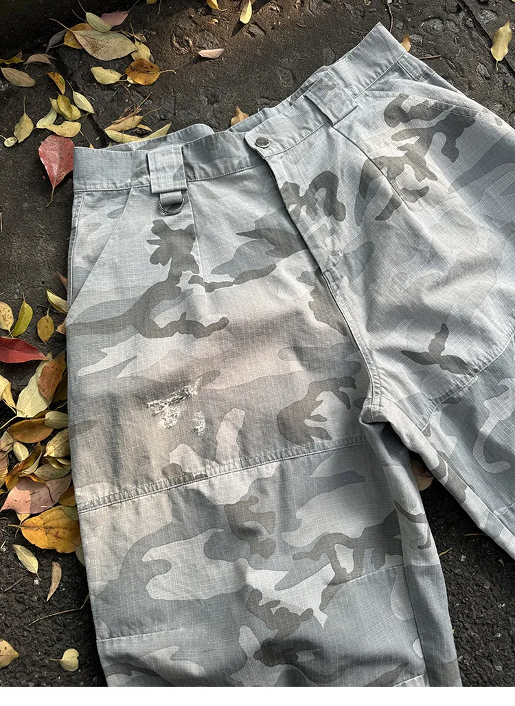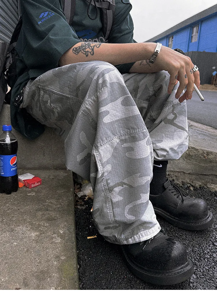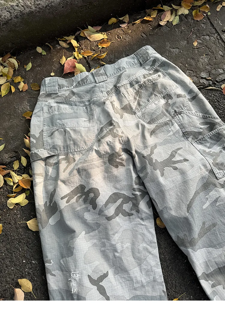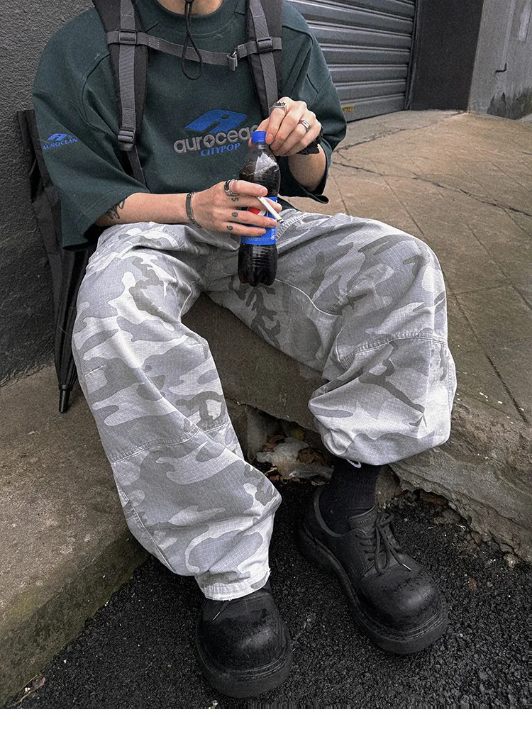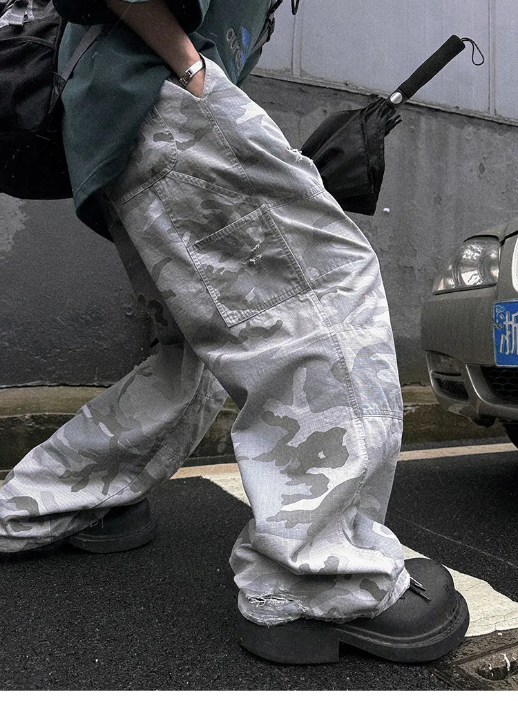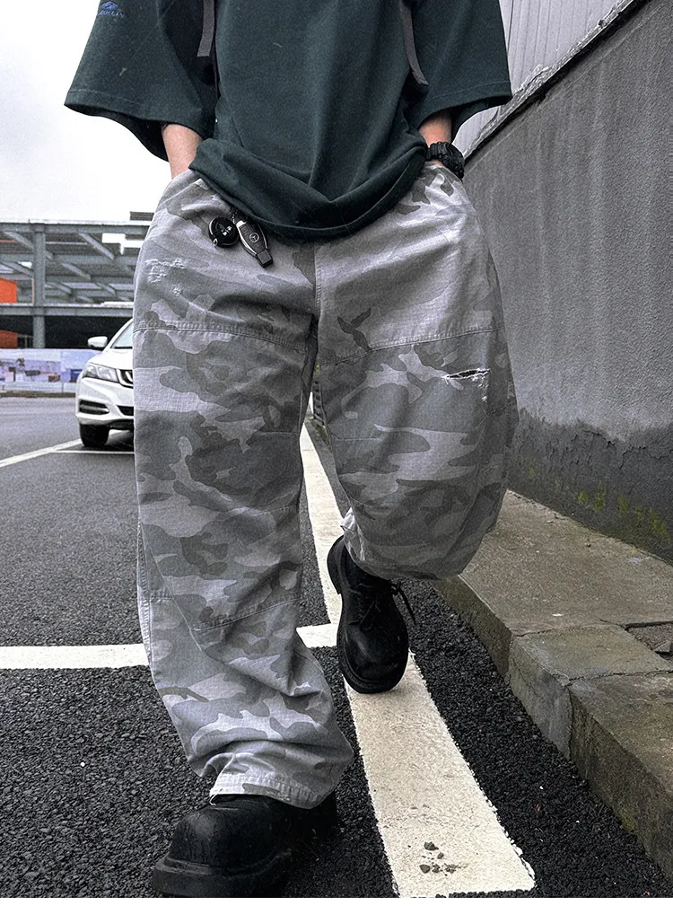 AUROCEAN 訂製水洗 暗紋 破壞 迷彩 闊腿 工裝褲 長褲(淺灰色)