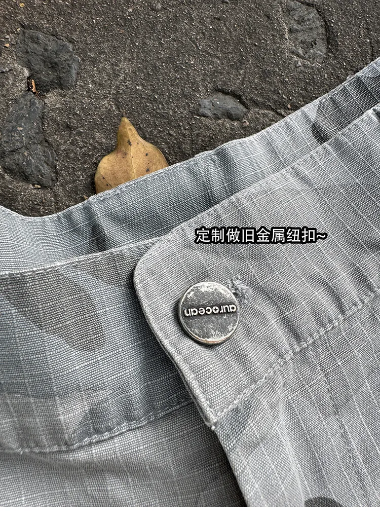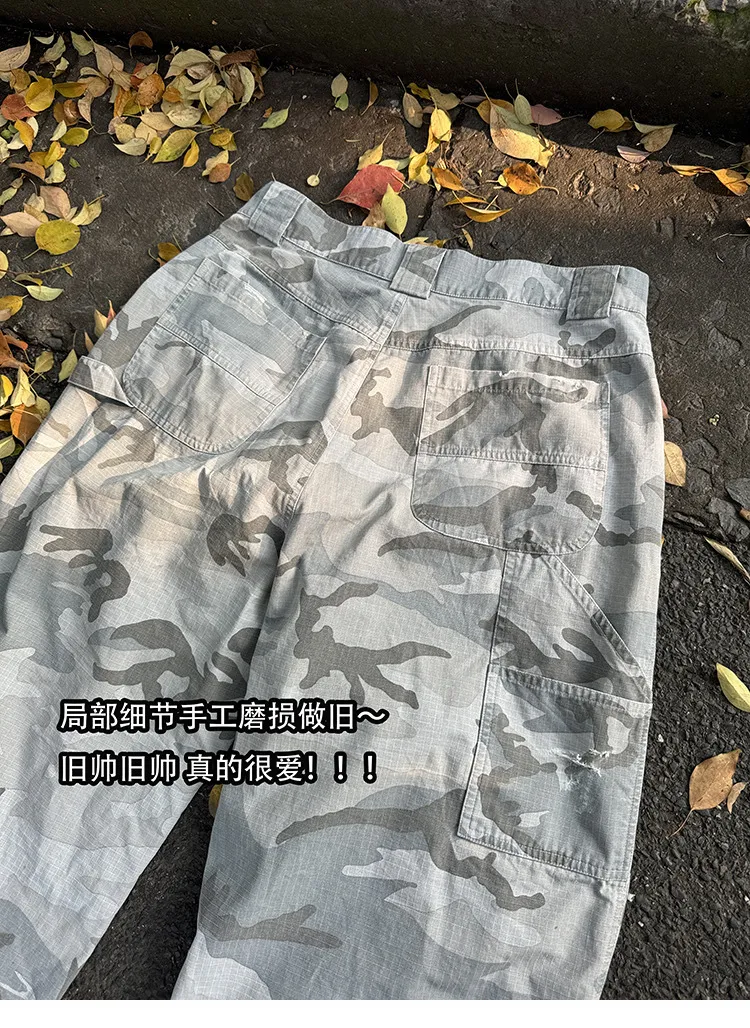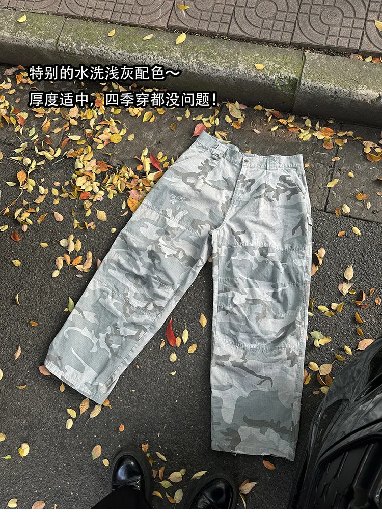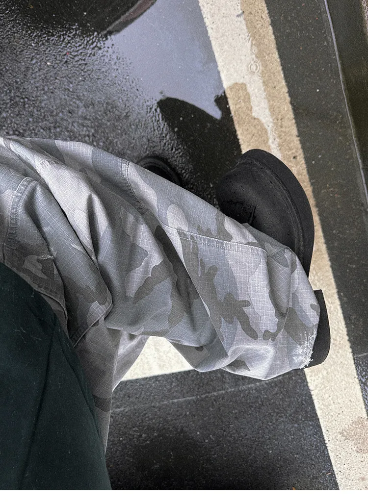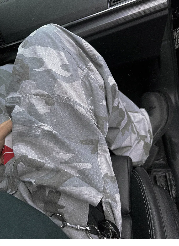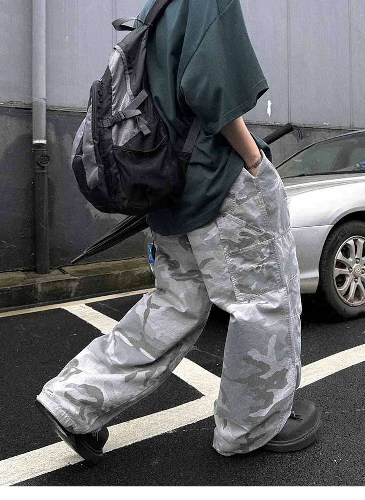 AUROCEAN 訂製水洗 暗紋 破壞 迷彩 闊腿 工裝褲 長褲(淺灰色)