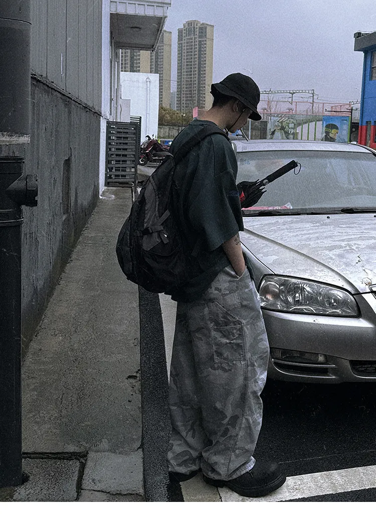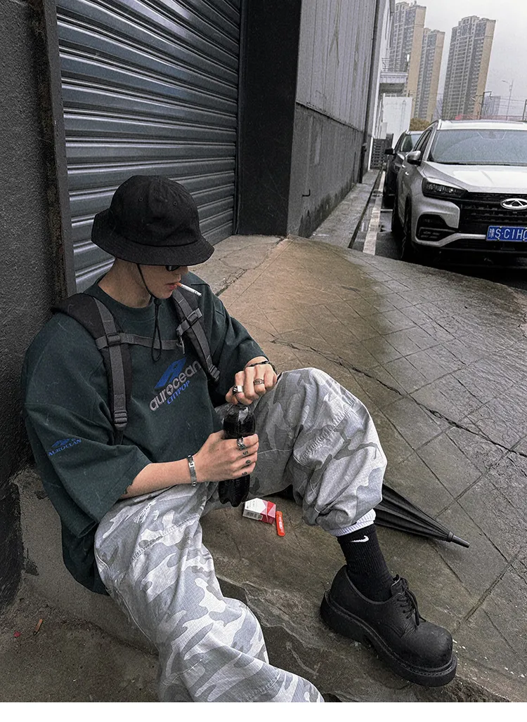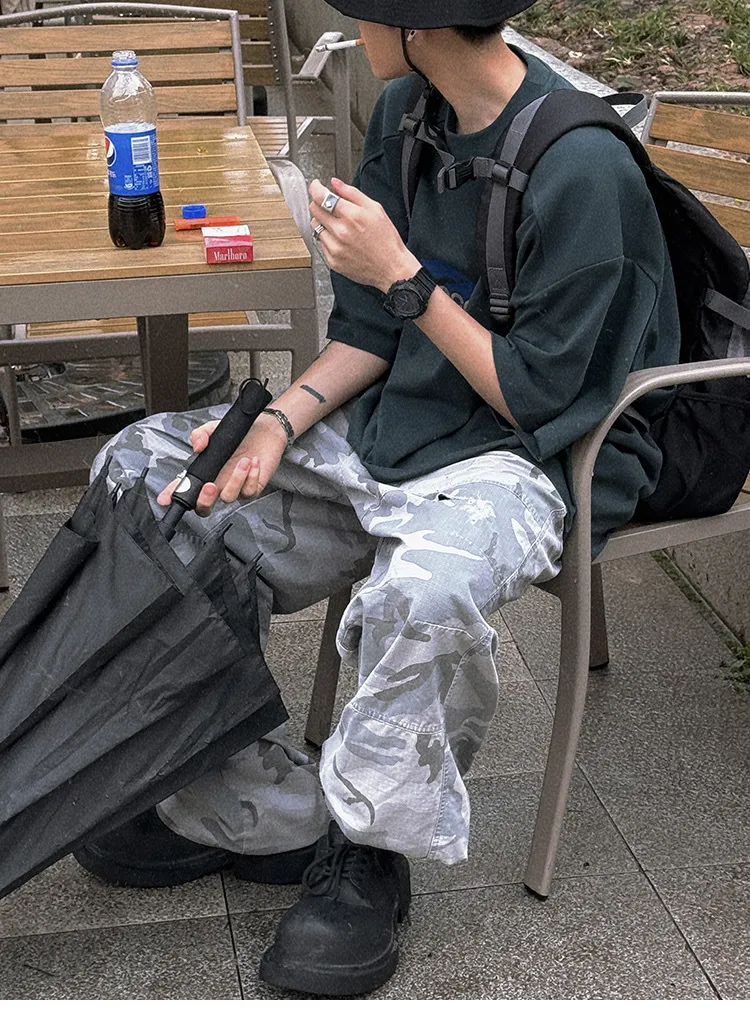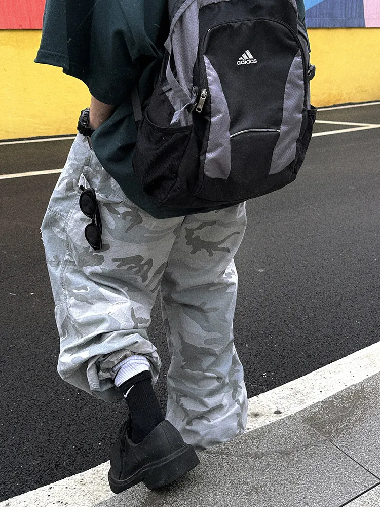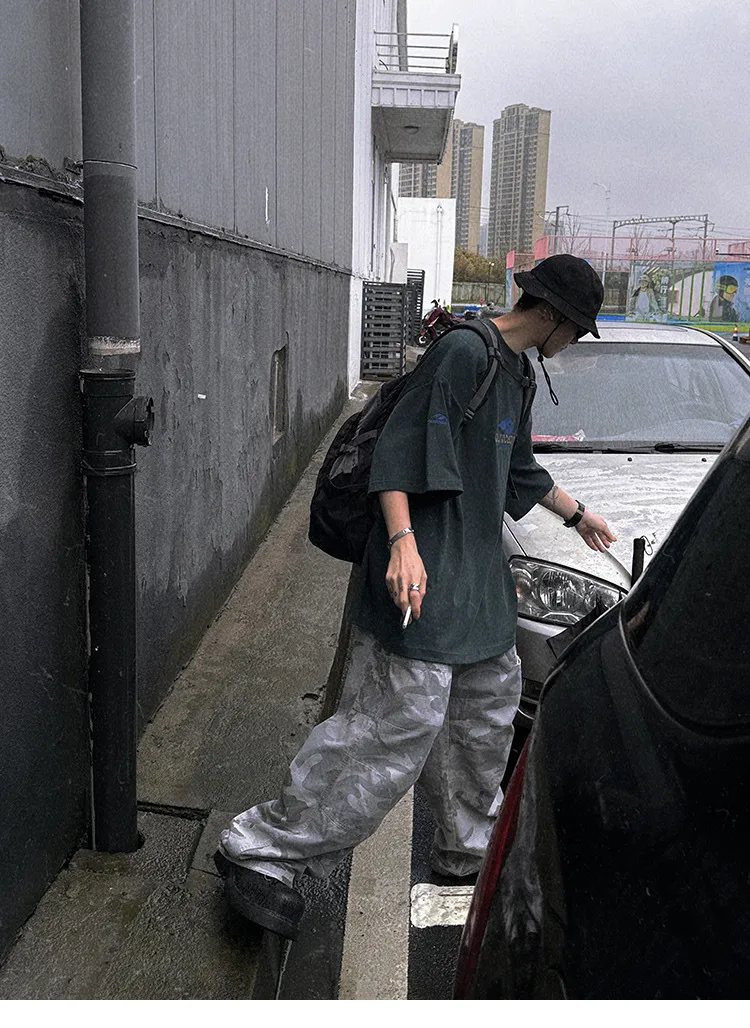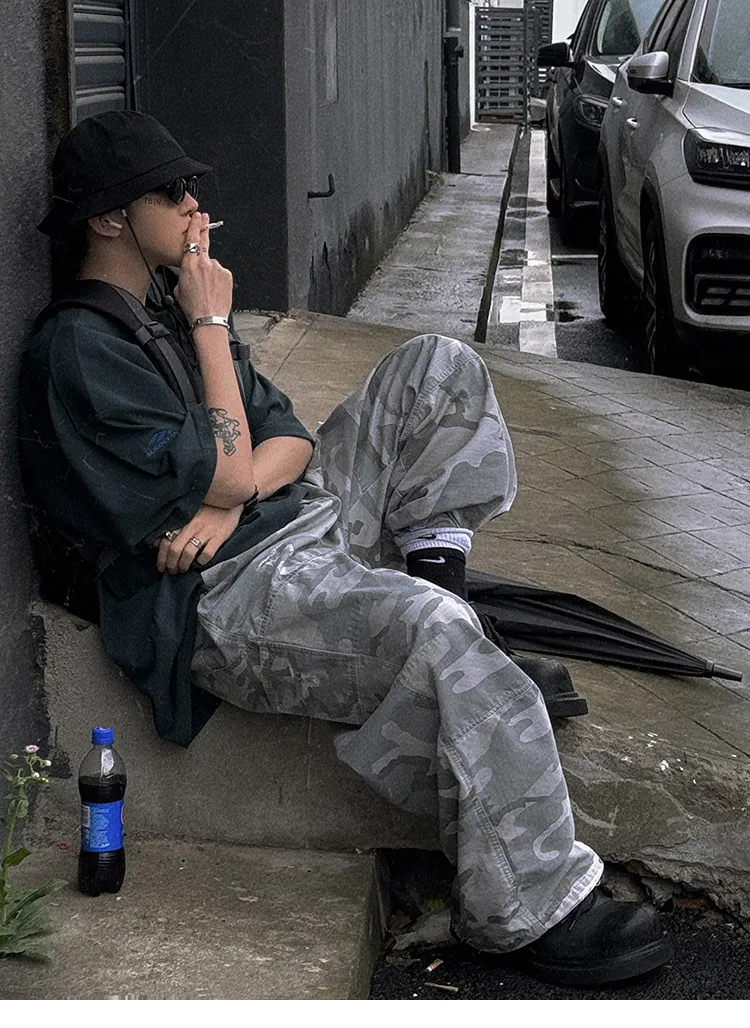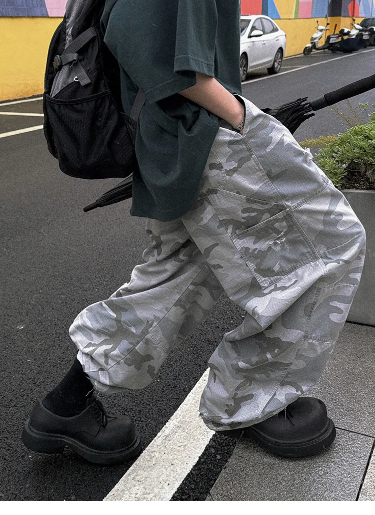 AUROCEAN 訂製水洗 暗紋 破壞 迷彩 闊腿 工裝褲 長褲(淺灰色)