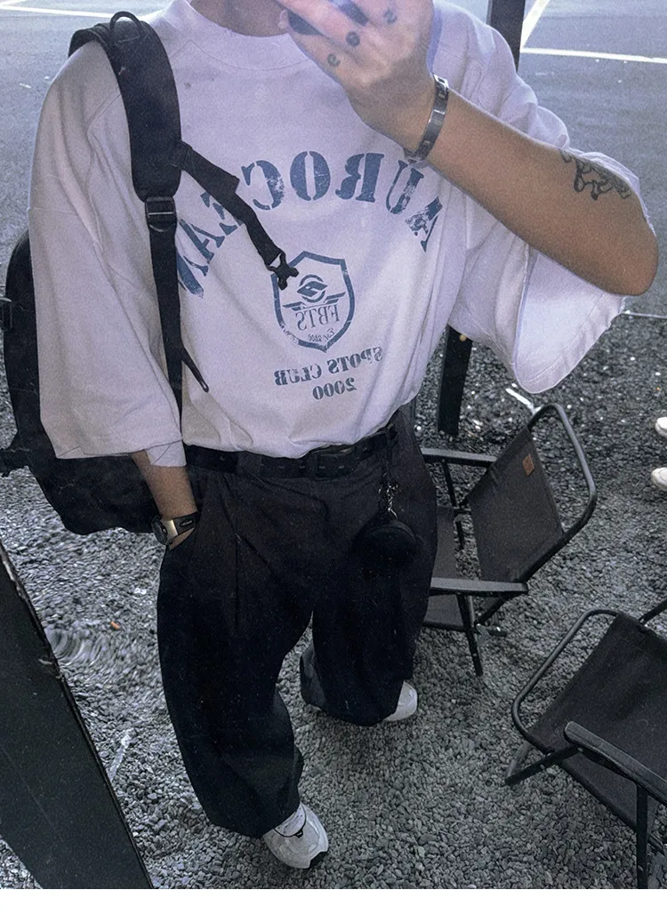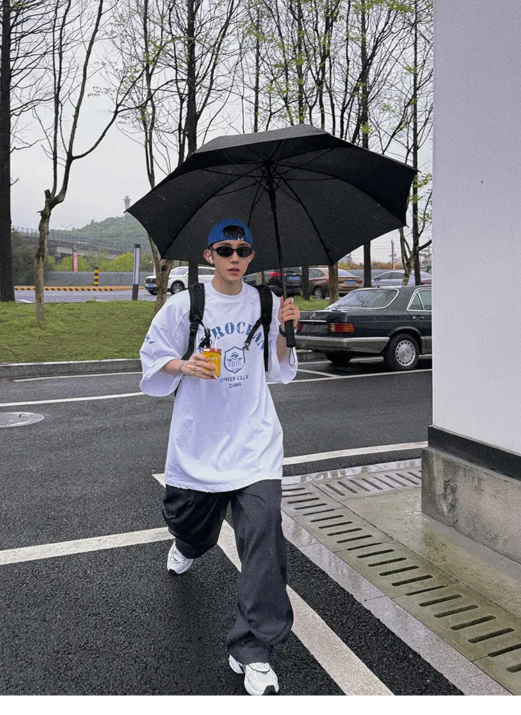 AUROCEAN 復古運動風 破壞感 雙層領 徽章刺繡 重磅 短袖 TEE(灰色)