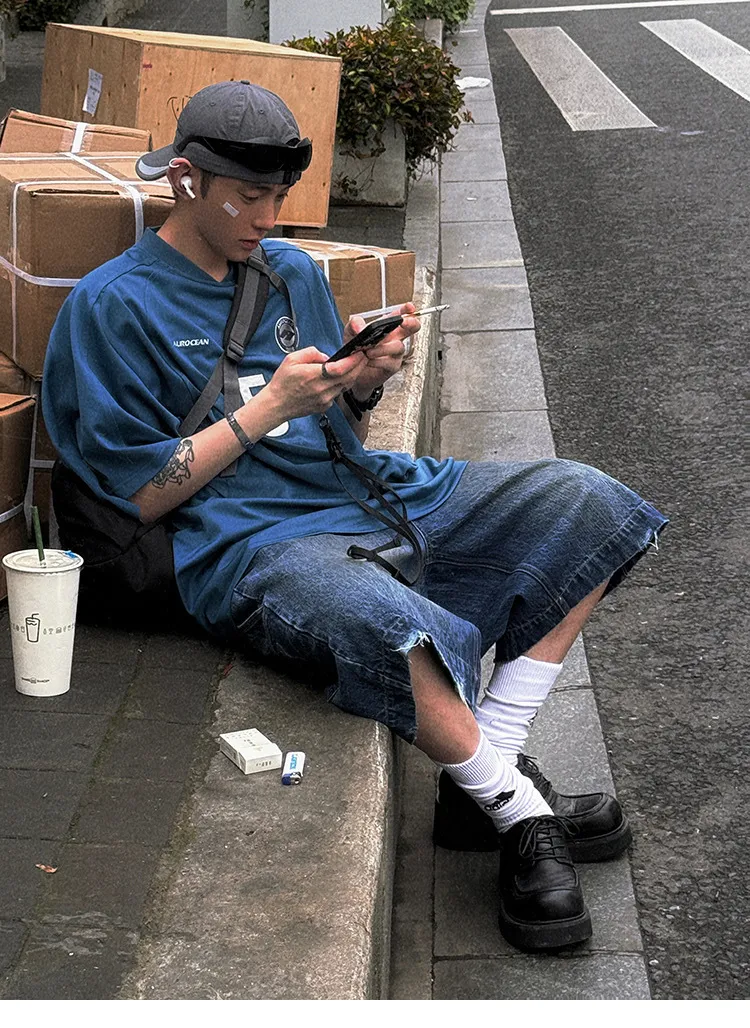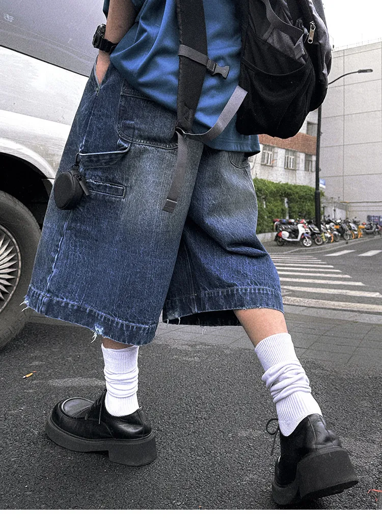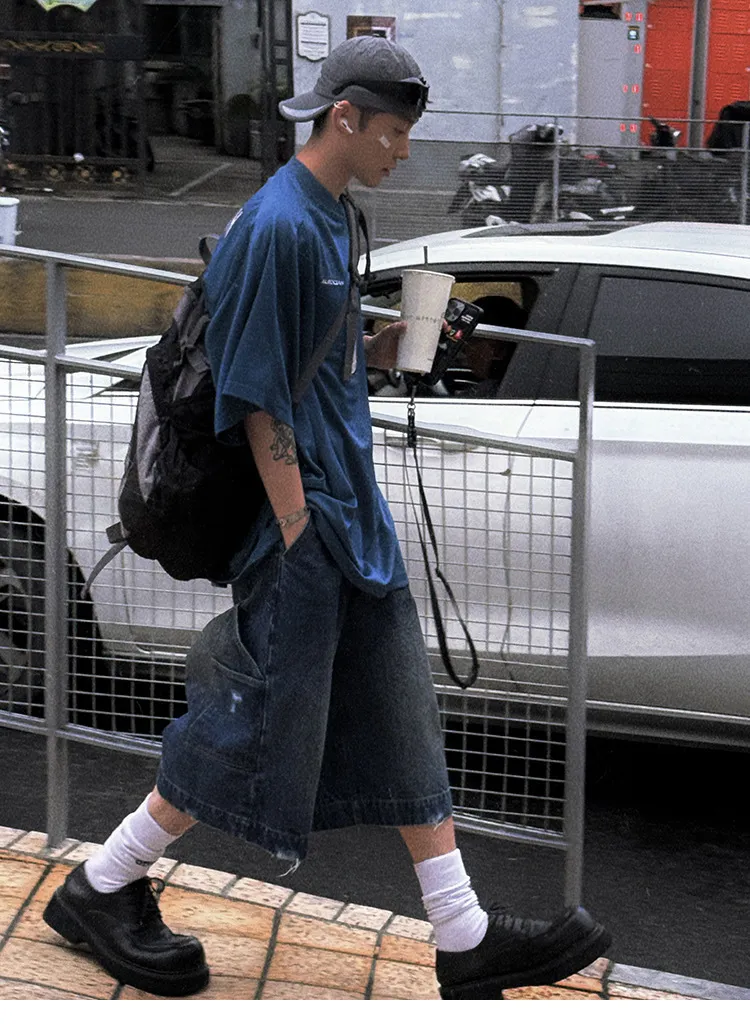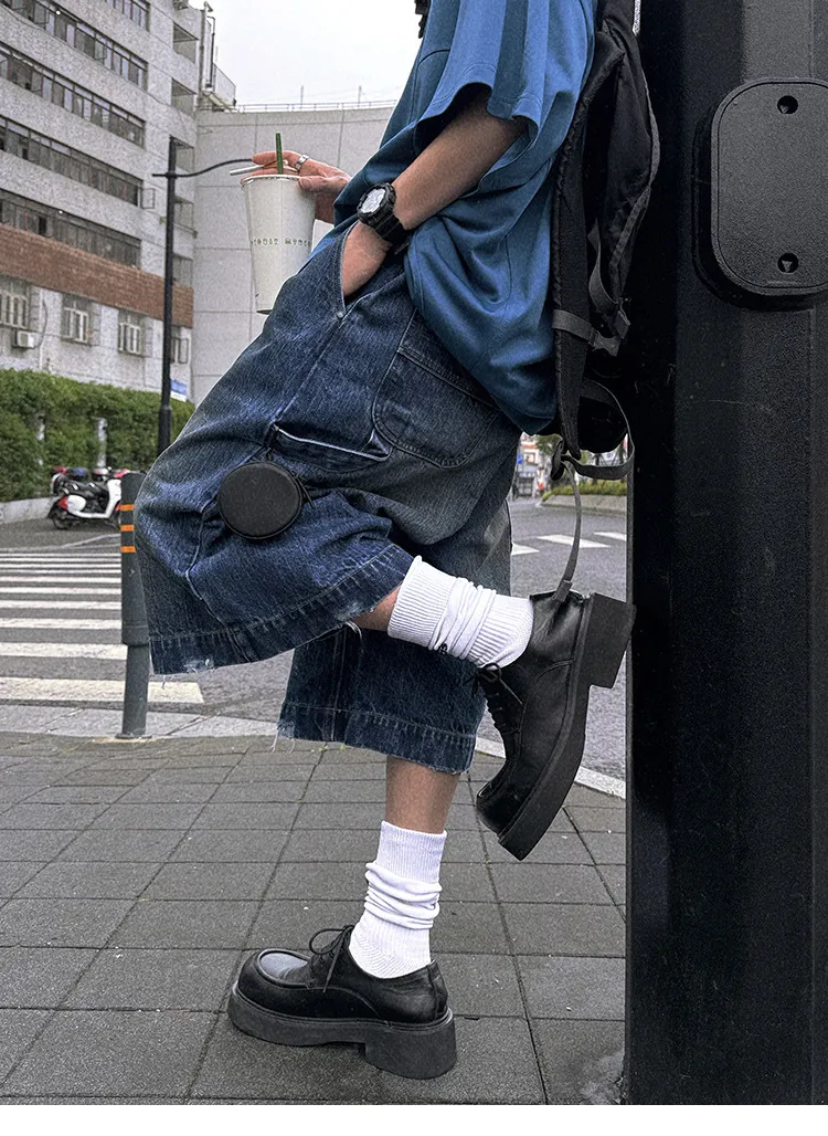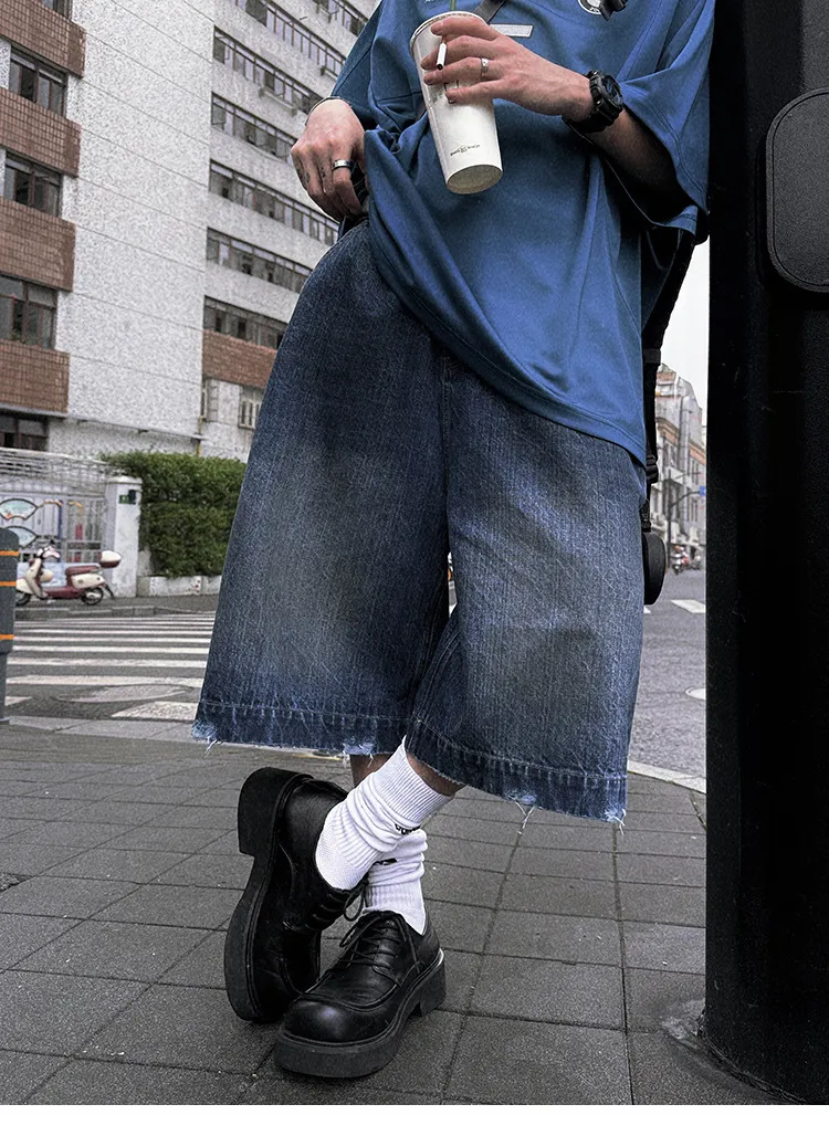 AUROCEAN 訂製水洗 暗紋 破壞 迷彩 寬版 六分褲 短褲(深灰色)
