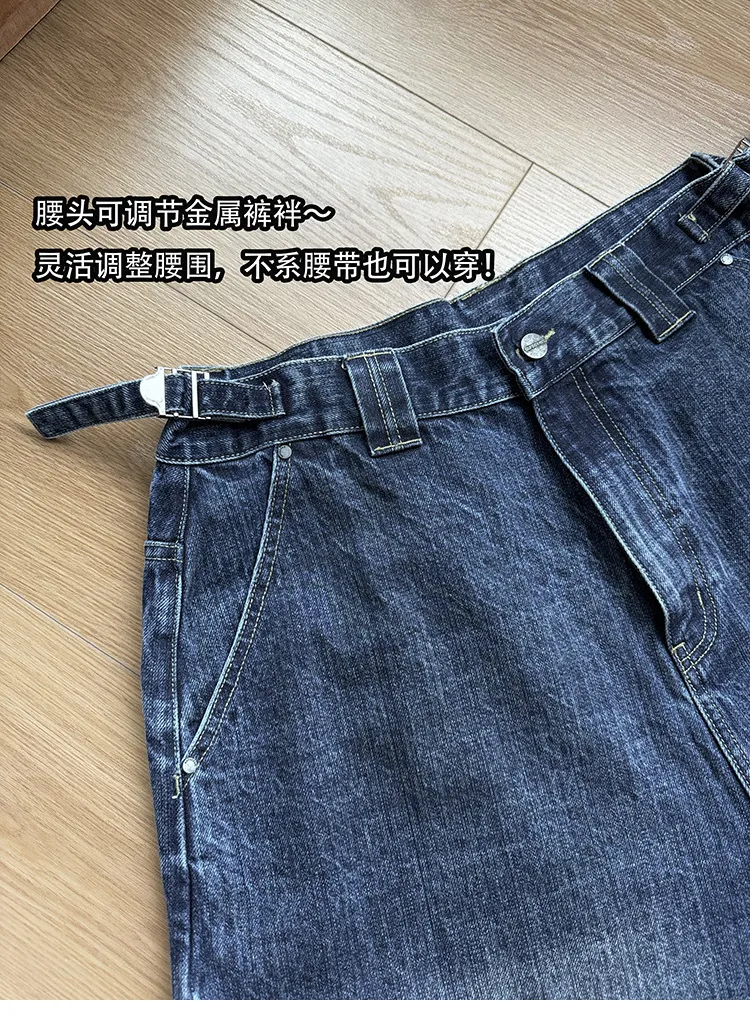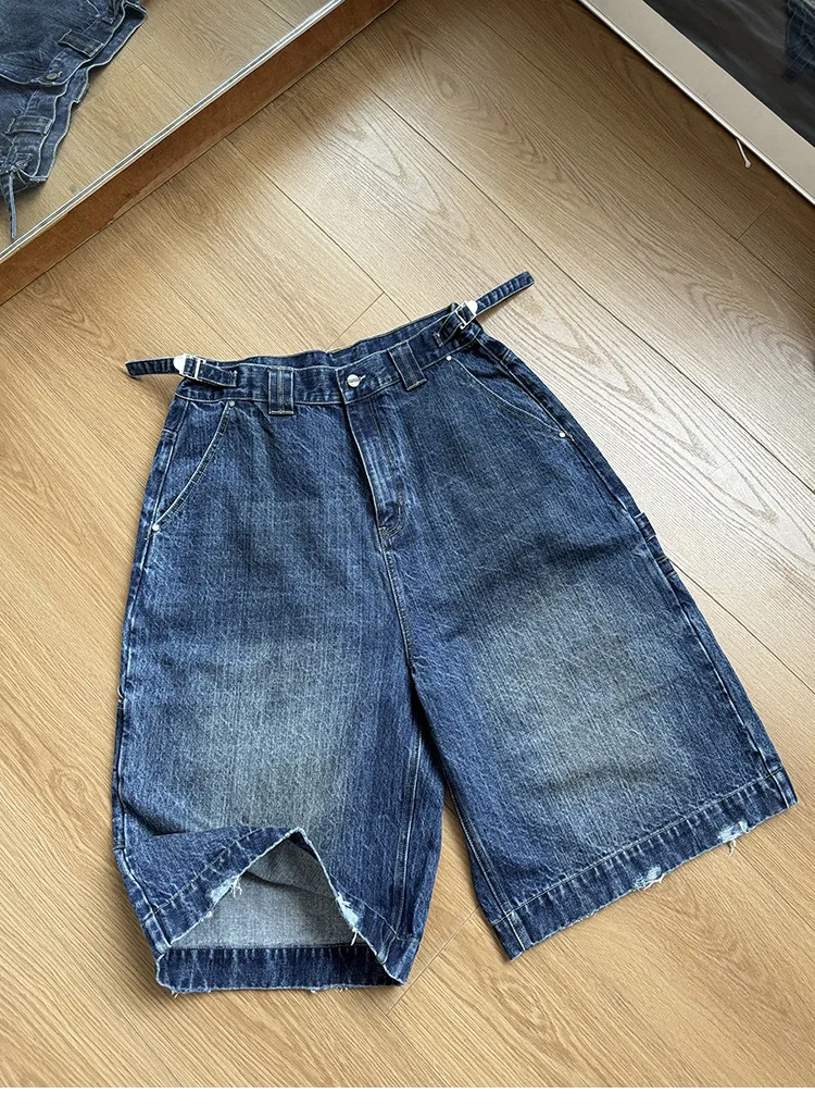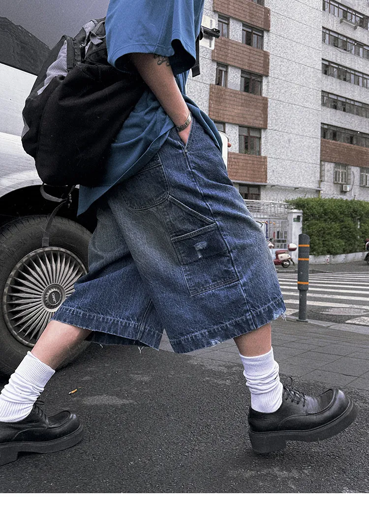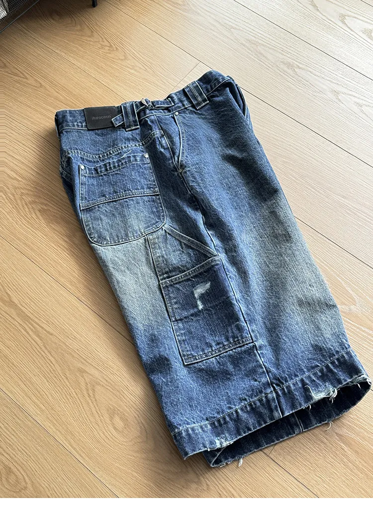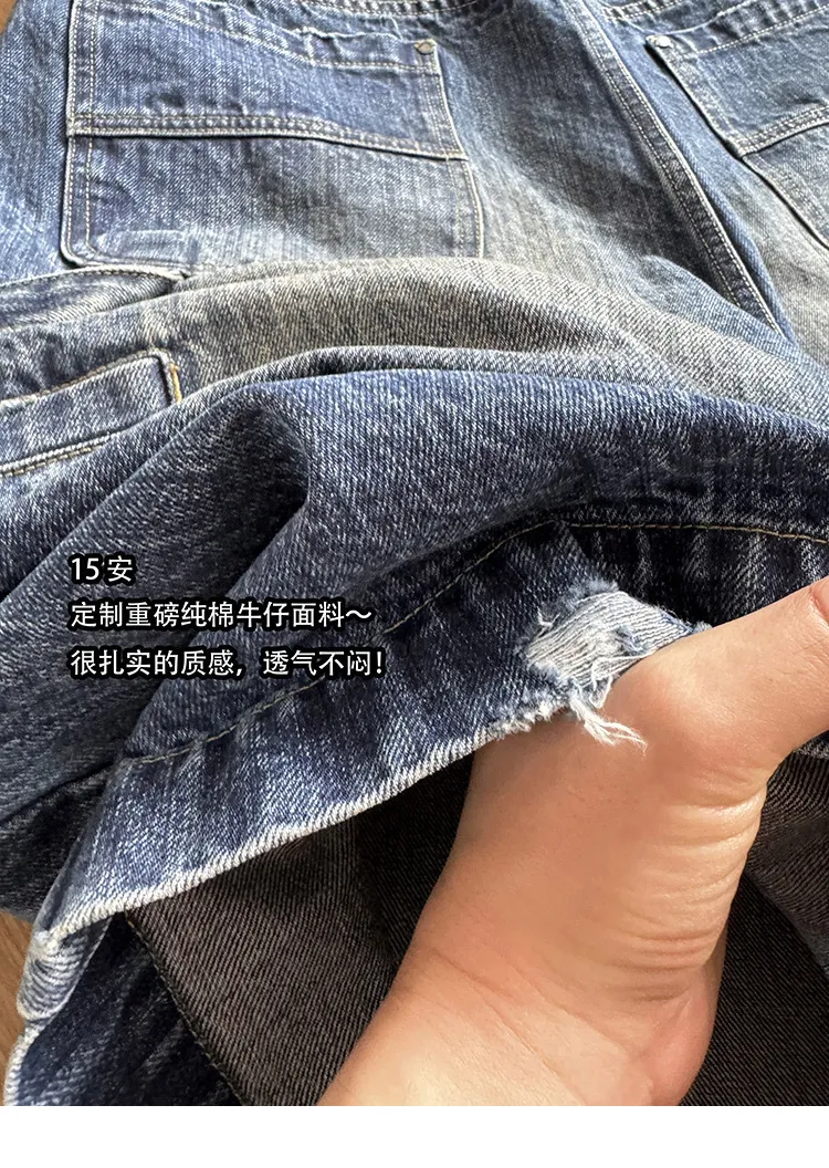 AUROCEAN 微髒深藍 訂製面料 做舊 工裝感 七分褲 牛仔褲(深藍色)