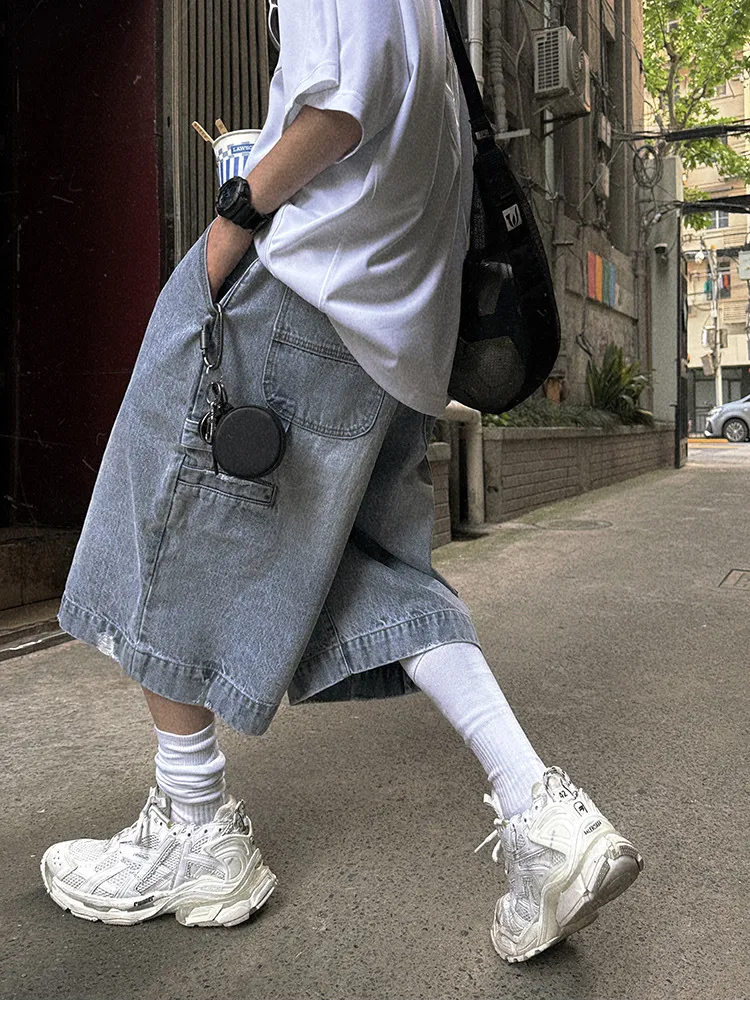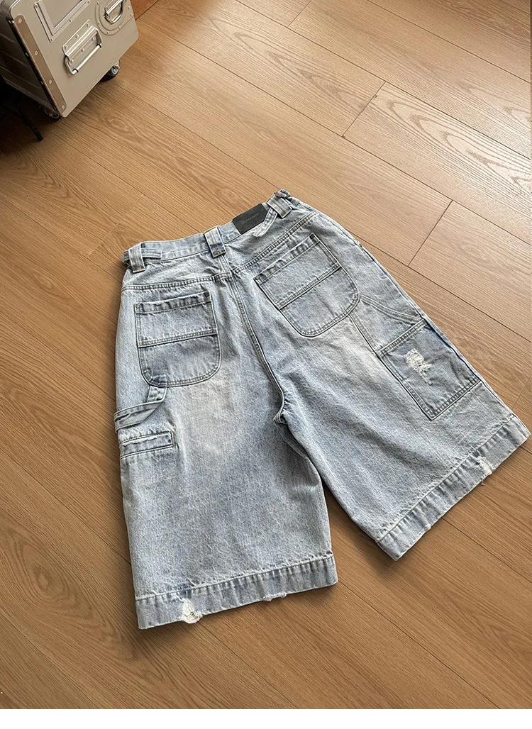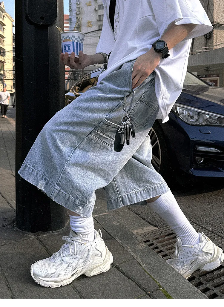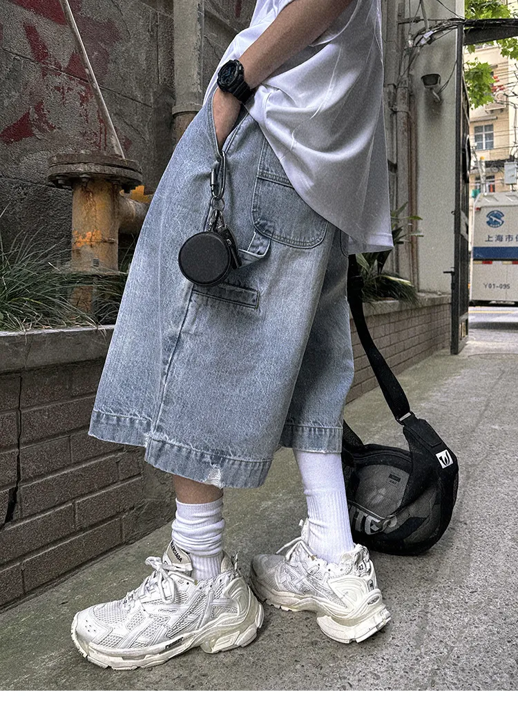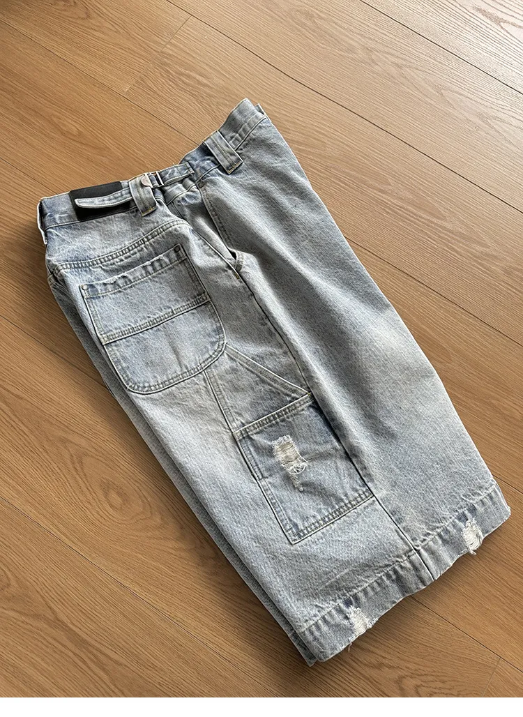 AUROCEAN 水洗做舊 破壞 重磅 工裝大口袋 短褲(灰白色)