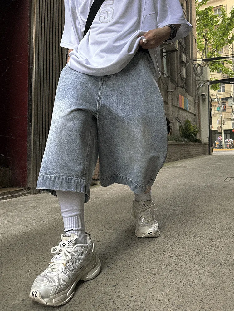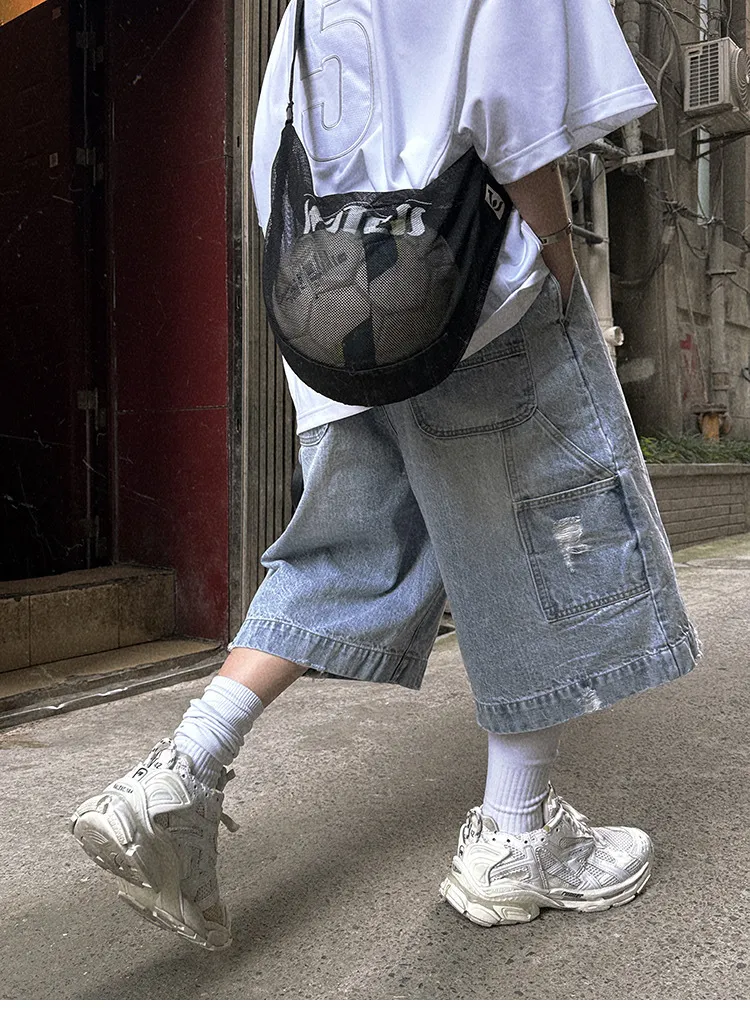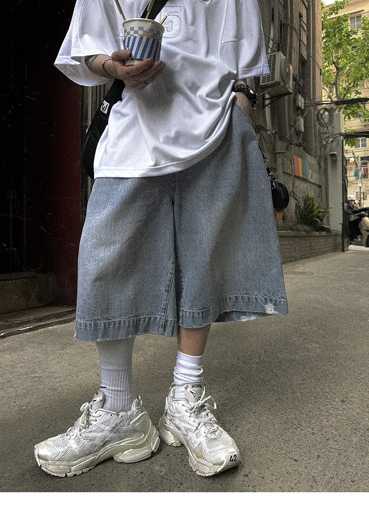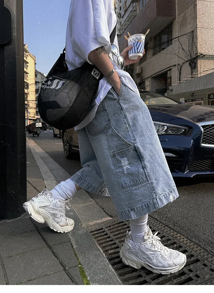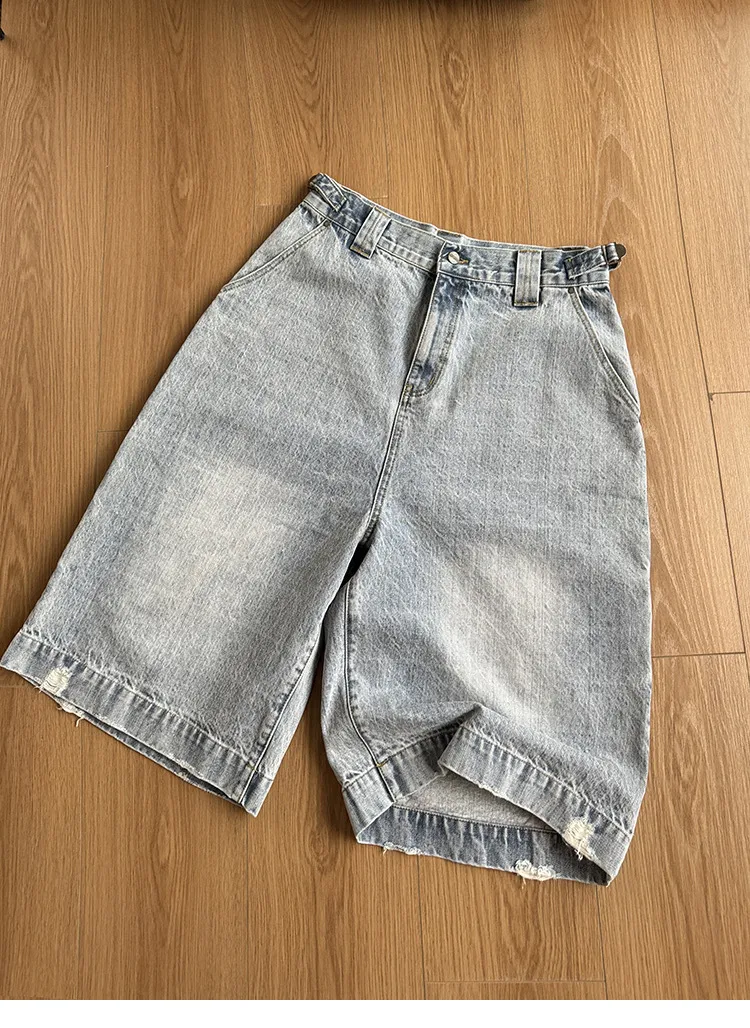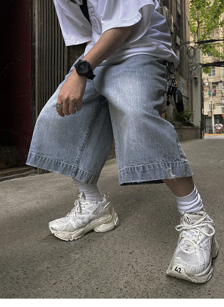 AUROCEAN 水洗做舊 破壞 重磅 工裝大口袋 短褲(灰白色)