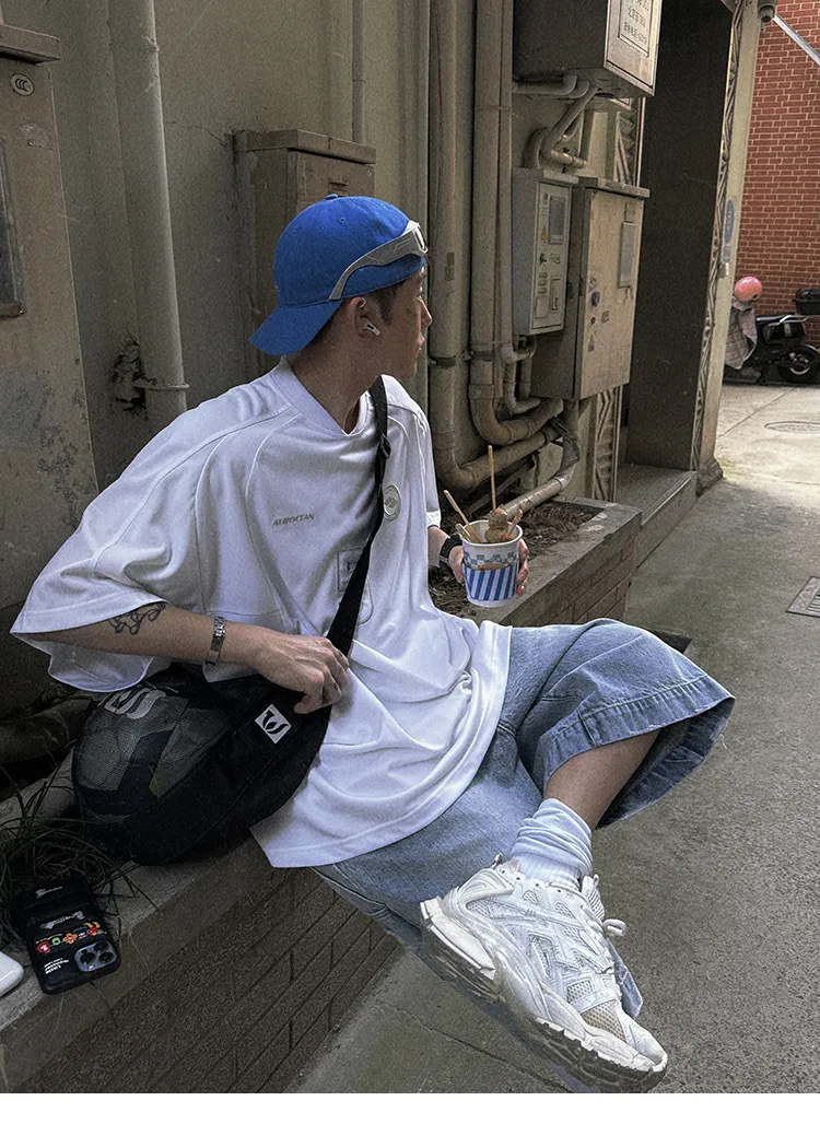 AUROCEAN 復古運動風 破壞感 雙層領 徽章刺繡 重磅 短袖 TEE(灰色)