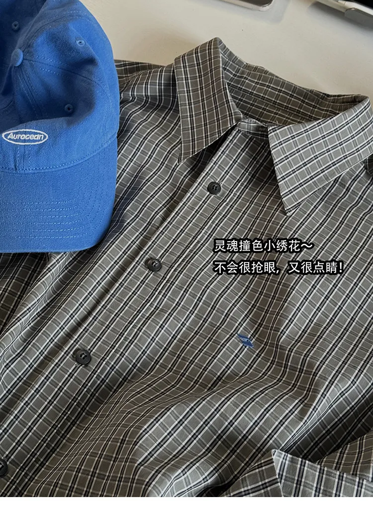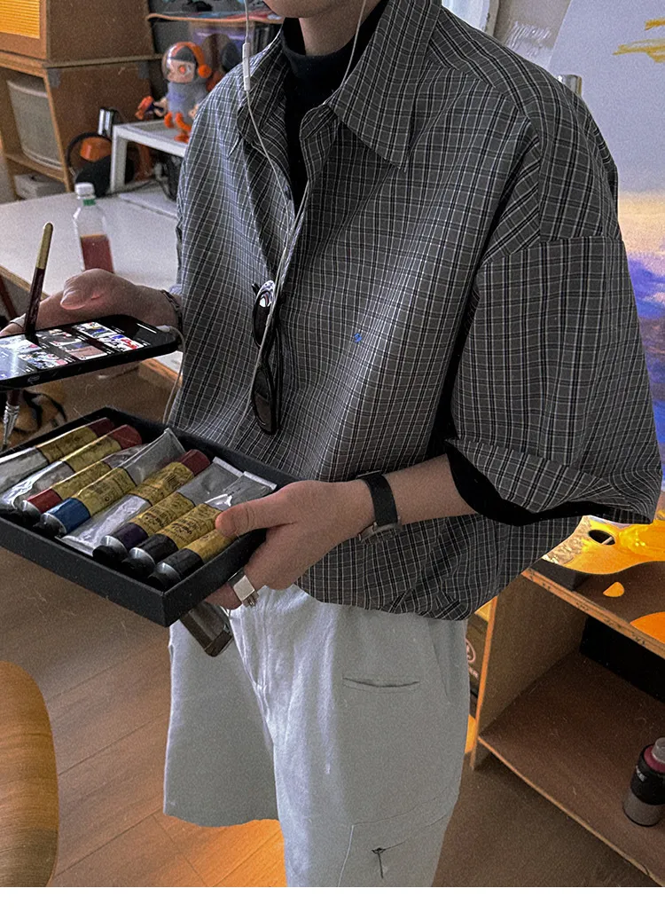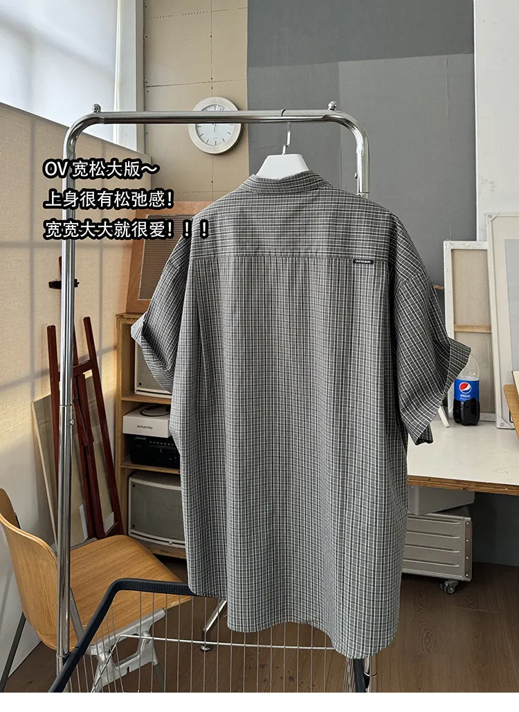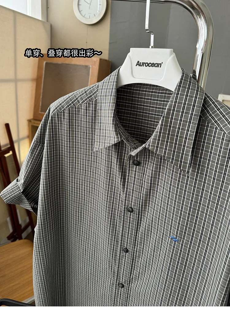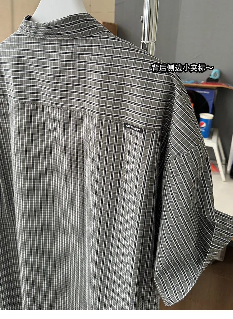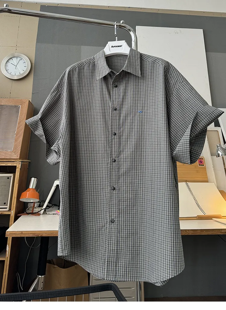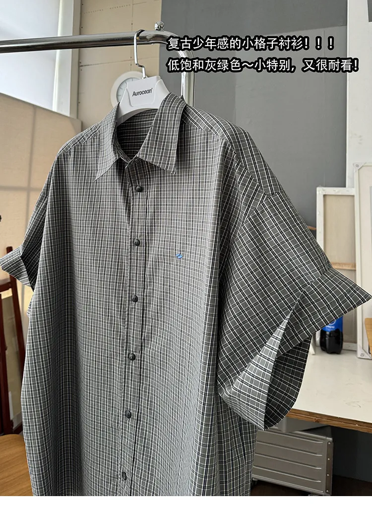 AUROCEAN 復古 鬆弛感 格紋 短袖 襯衫(灰綠色)