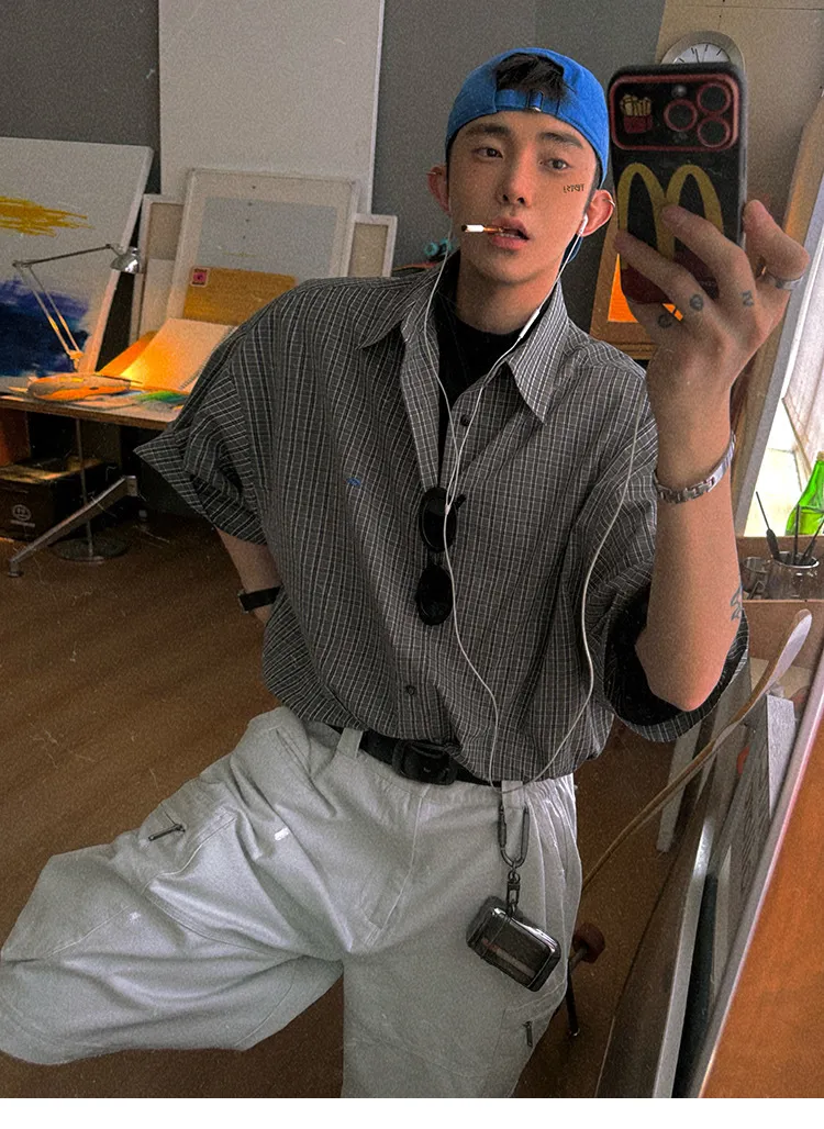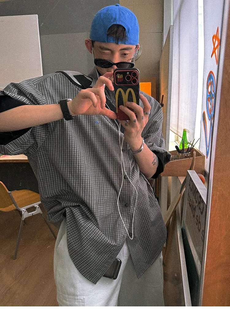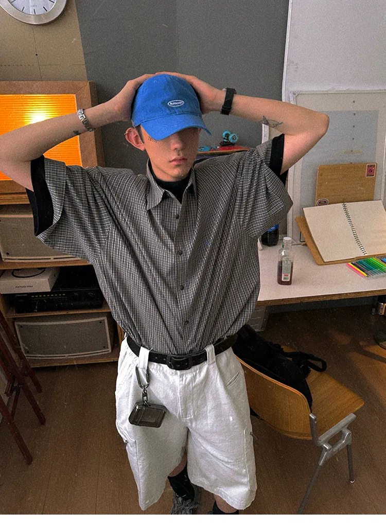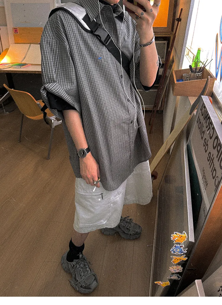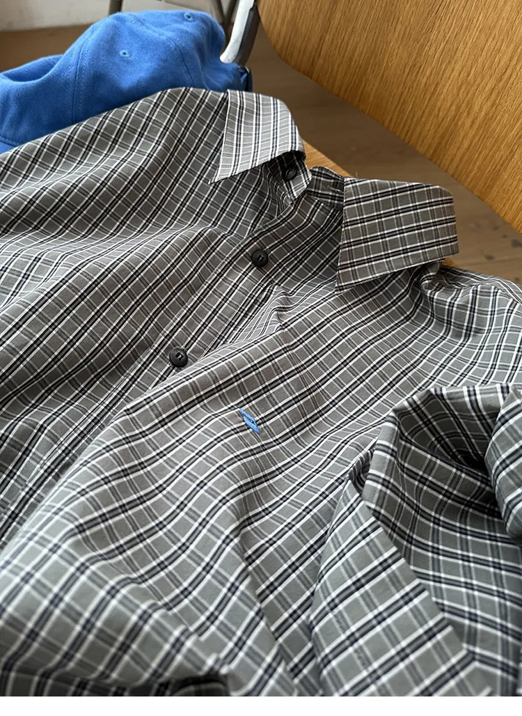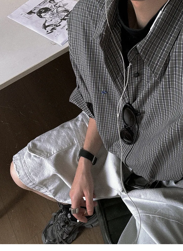 AUROCEAN 復古 鬆弛感 格紋 短袖 襯衫(灰綠色)