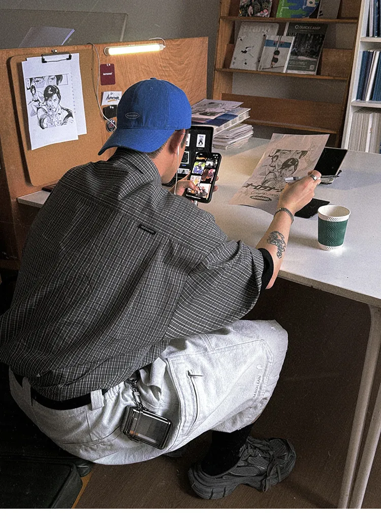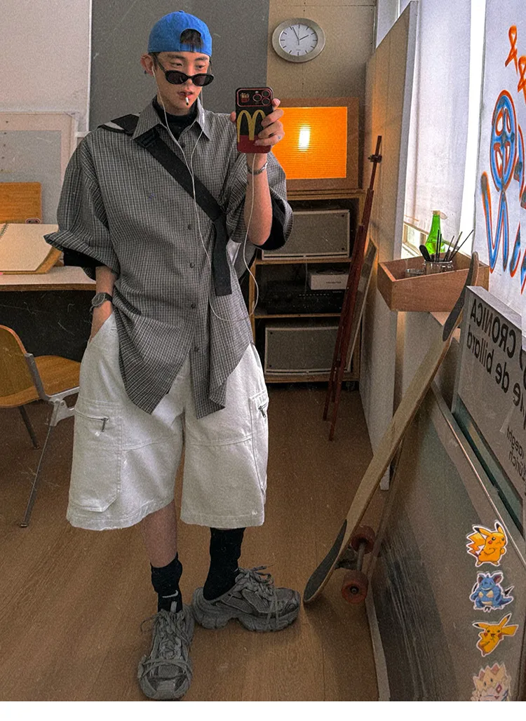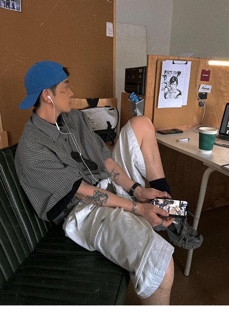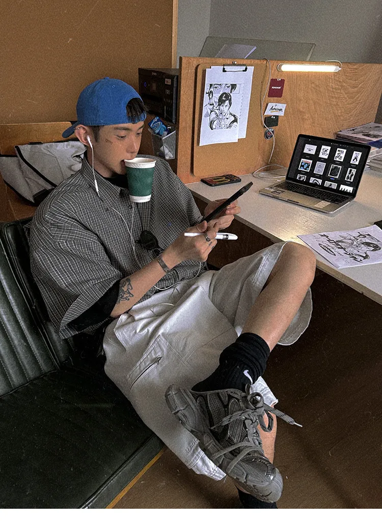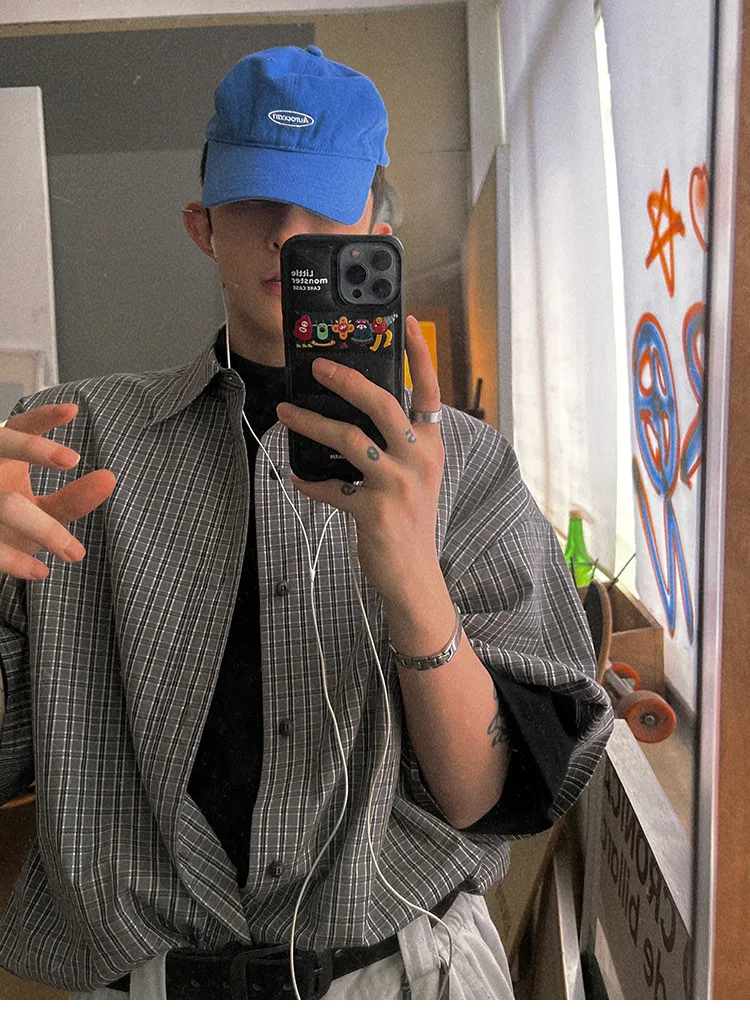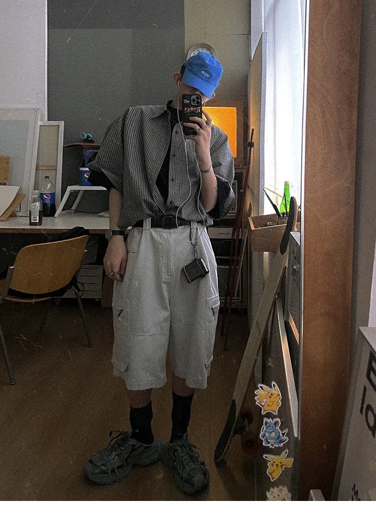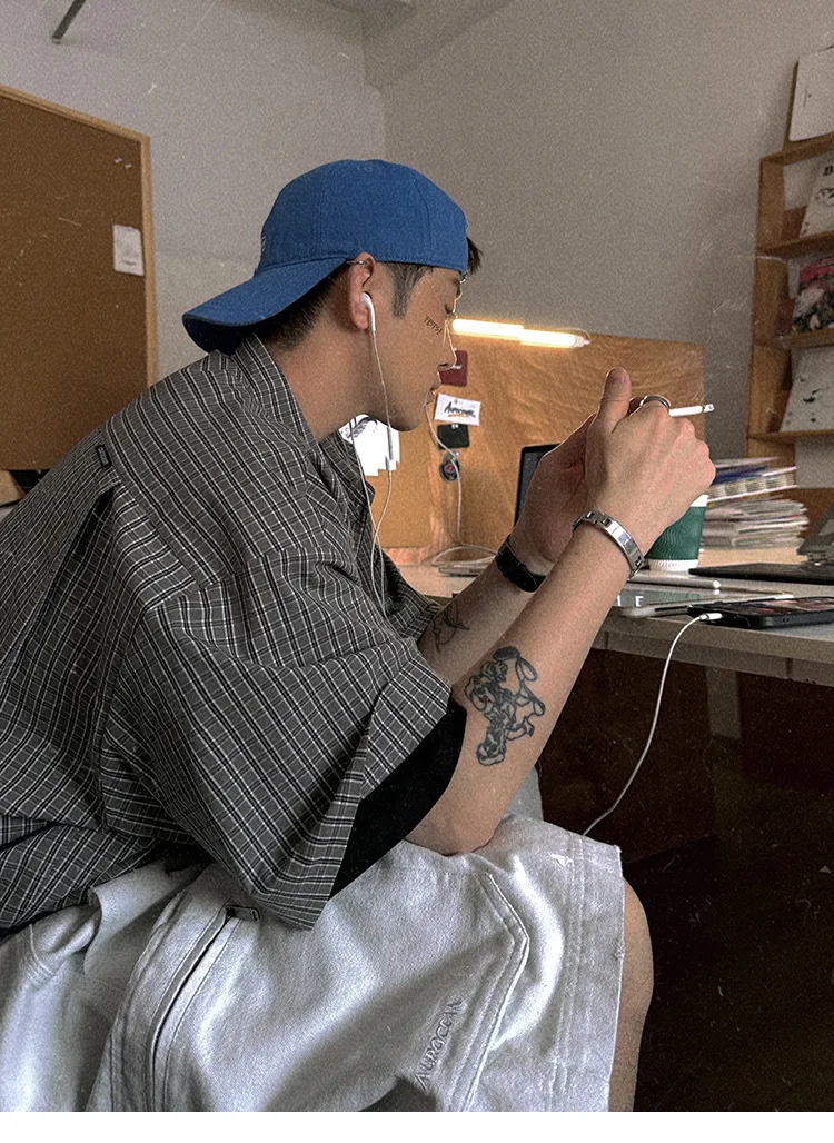 AUROCEAN 復古 鬆弛感 格紋 短袖 襯衫(灰綠色)
