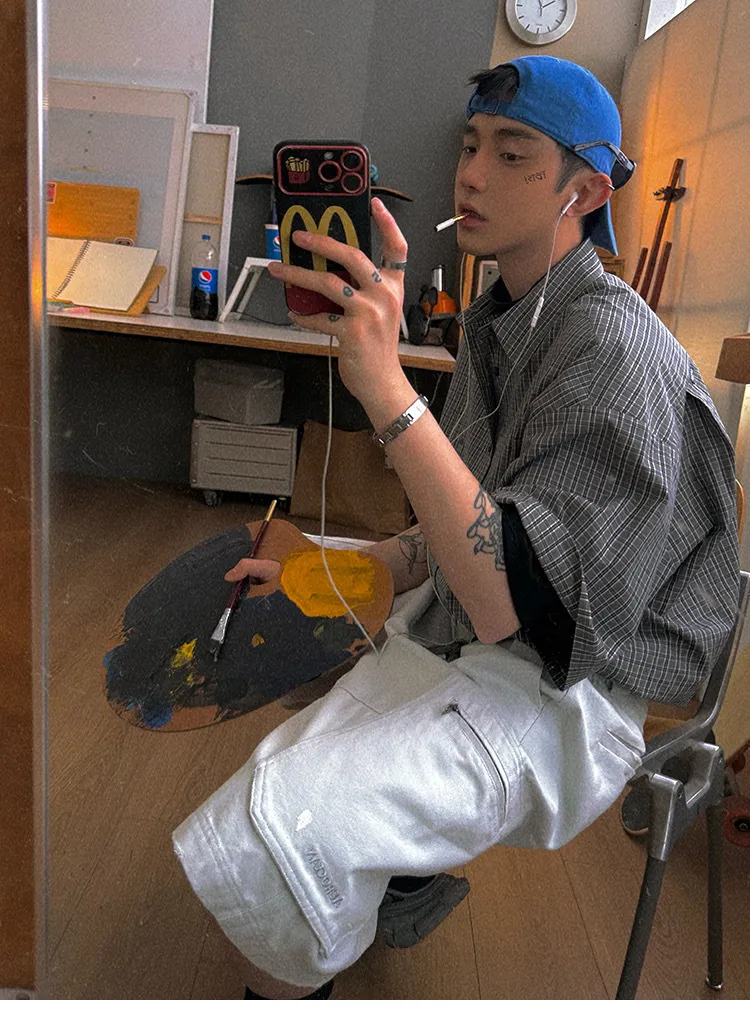 AUROCEAN 訂製水洗 暗紋 破壞 迷彩 寬版 六分褲 短褲(深灰色)
