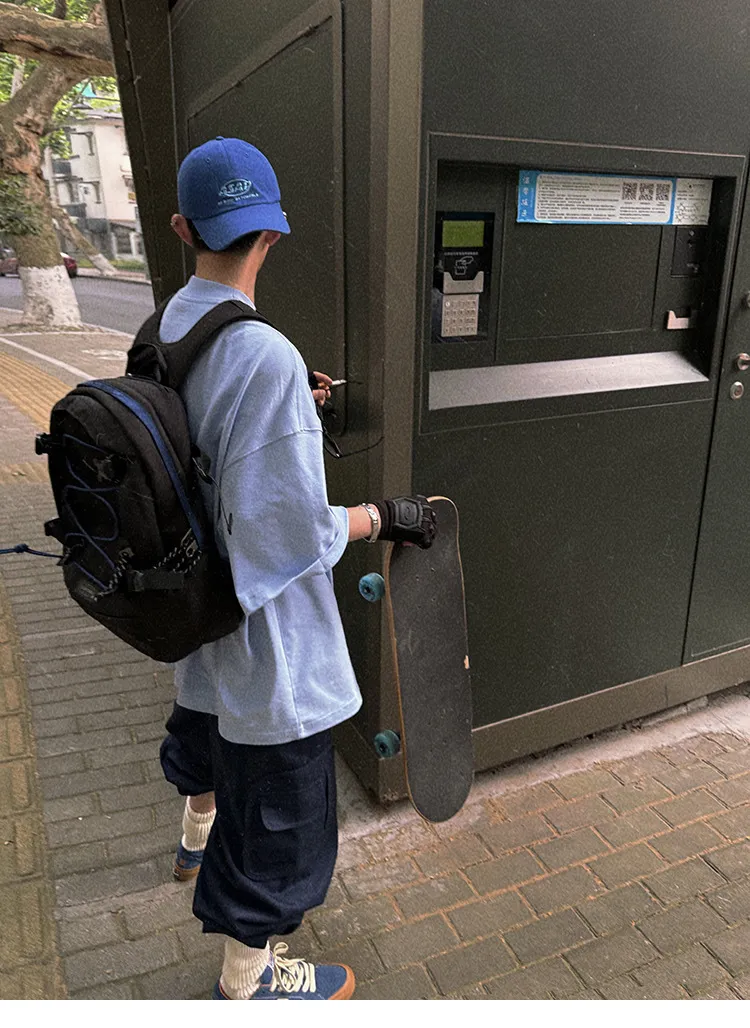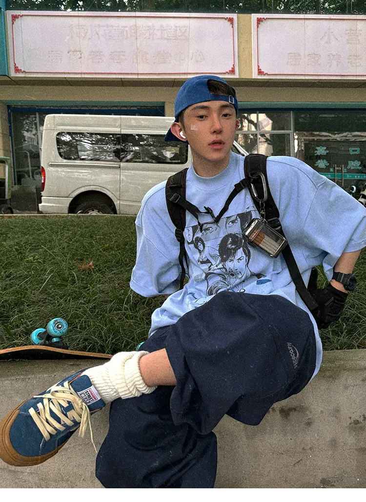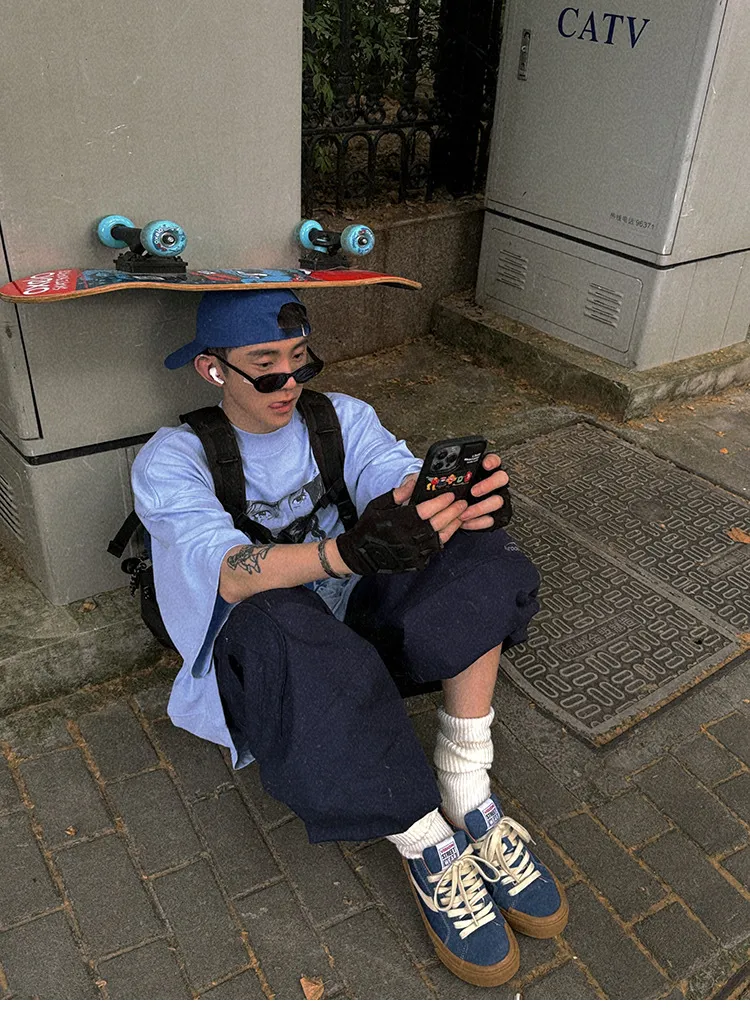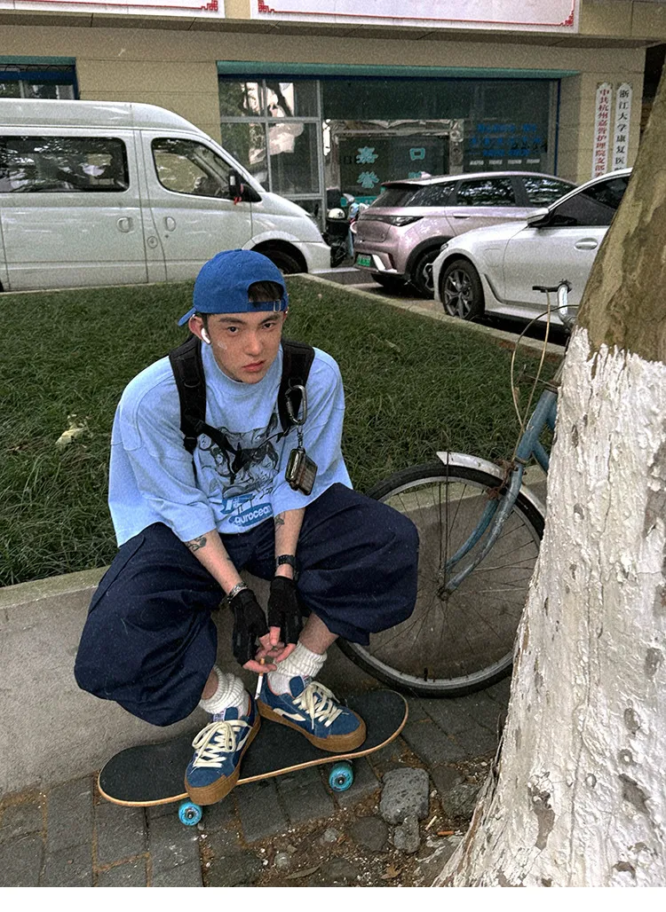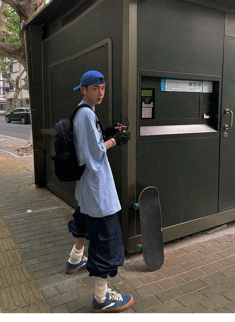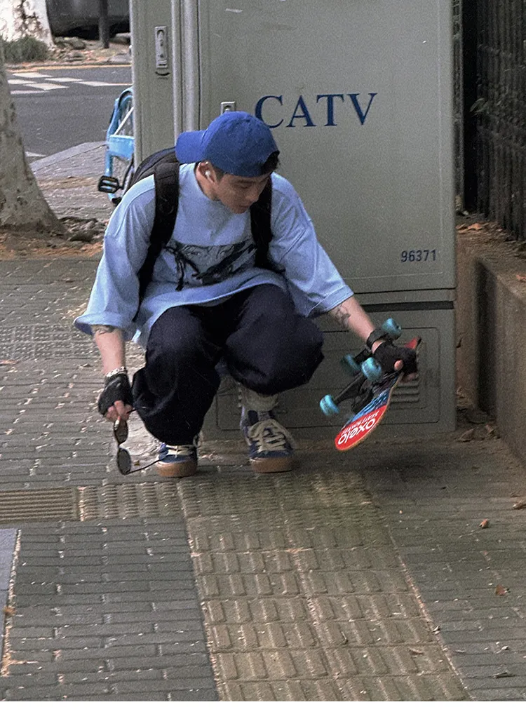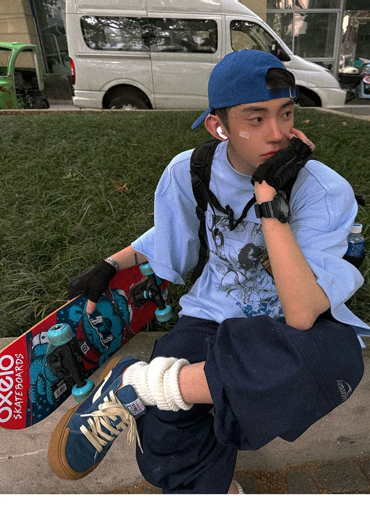 AUROCEAN 滑板少年 撞色 格紋 短袖 襯衫(藍色)