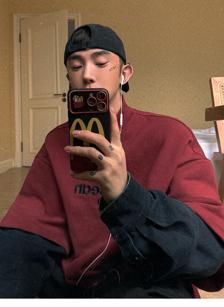 AUROCEAN 美式男孩 假兩件拼接 刺繡LOGO 重磅小高領 大學踢(紅色)