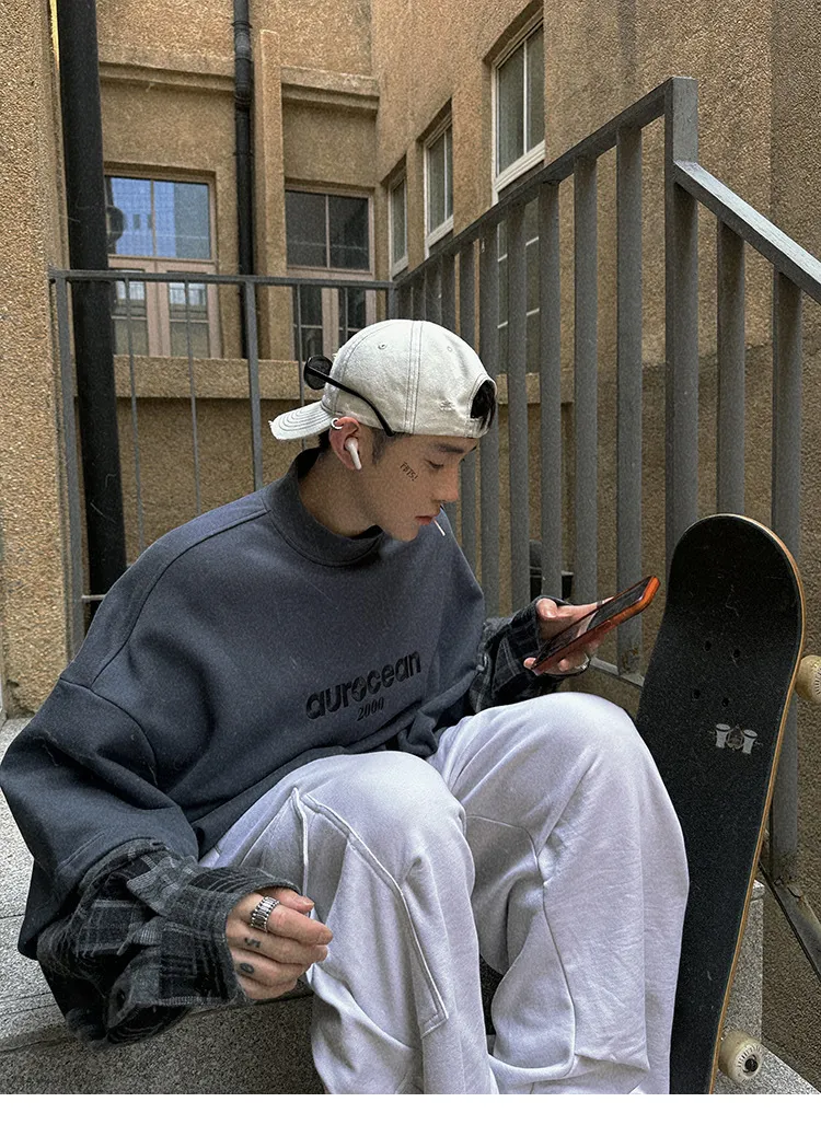 AUROCEAN 美式男孩 假兩件拼接 刺繡LOGO 重磅小高領 大學踢(深灰色)