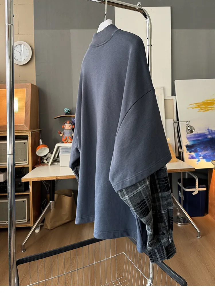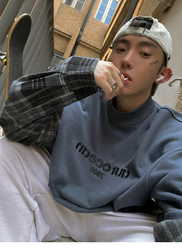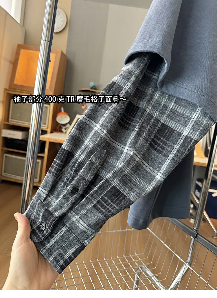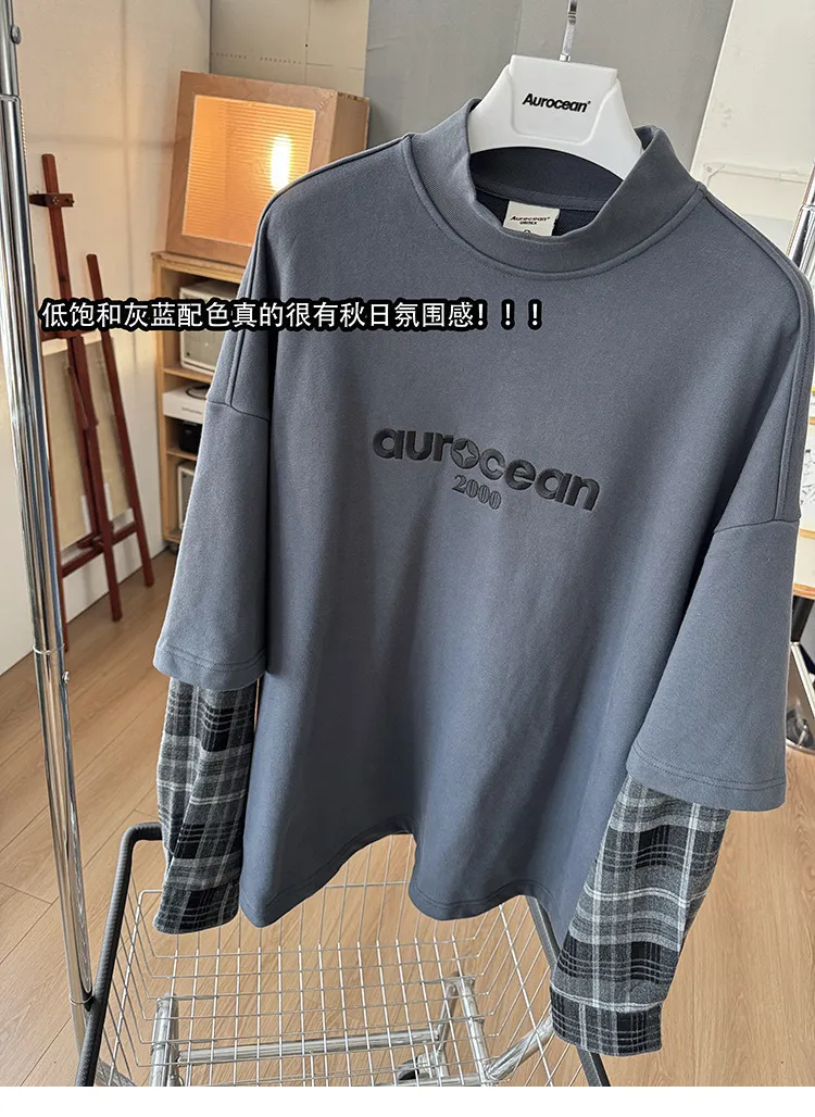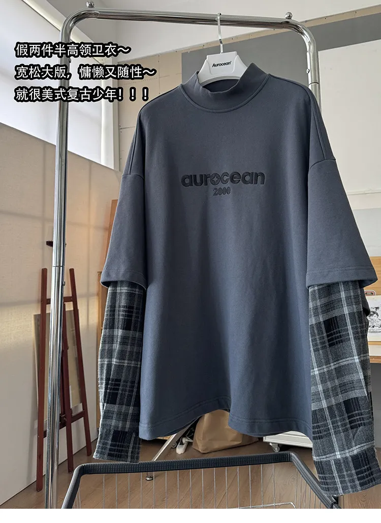 AUROCEAN 美式男孩 假兩件拼接 格紋 刺繡LOGO 重磅小高領 大學踢(灰藍色)