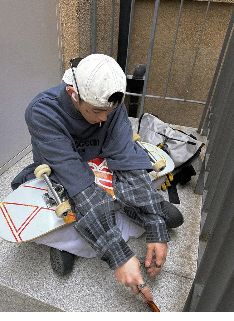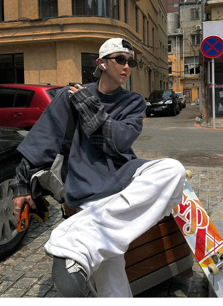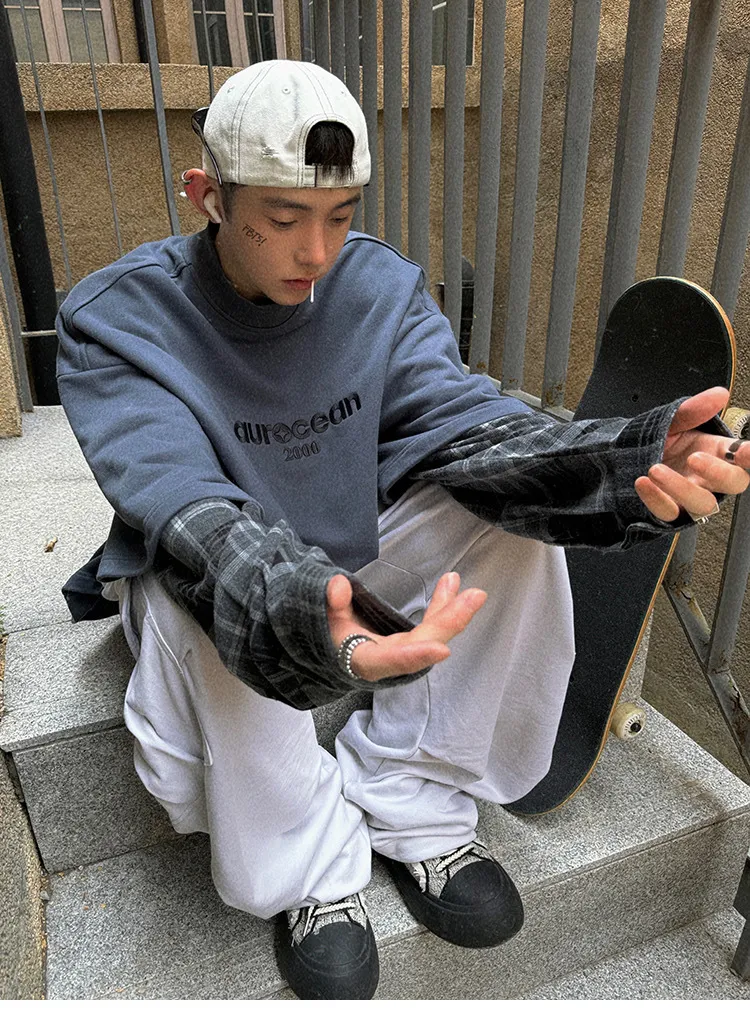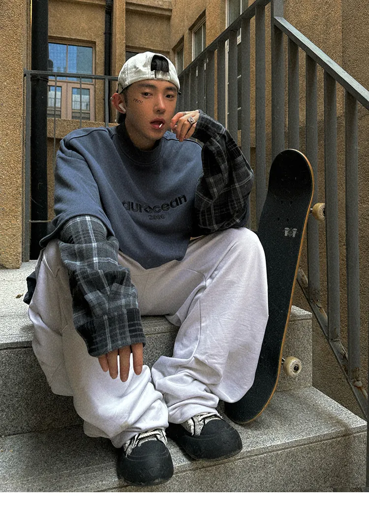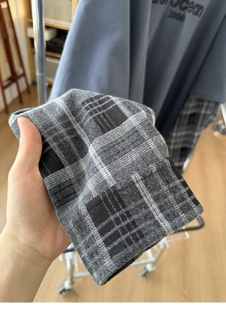 AUROCEAN 美式男孩 假兩件拼接 格紋 刺繡LOGO 重磅小高領 大學踢(灰藍色)