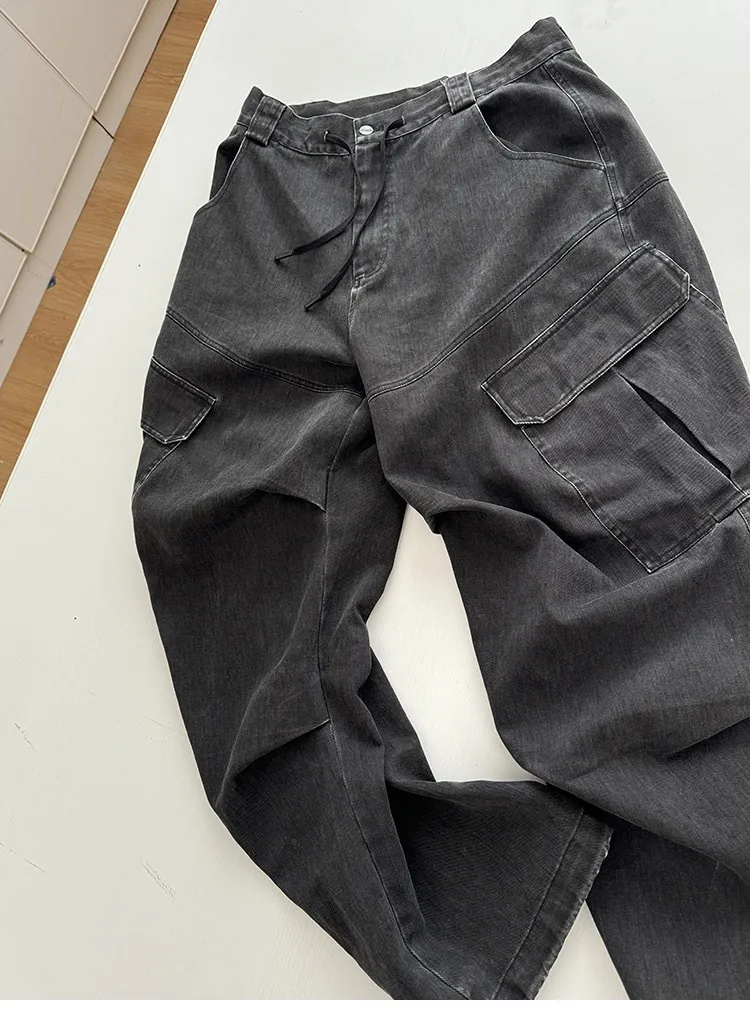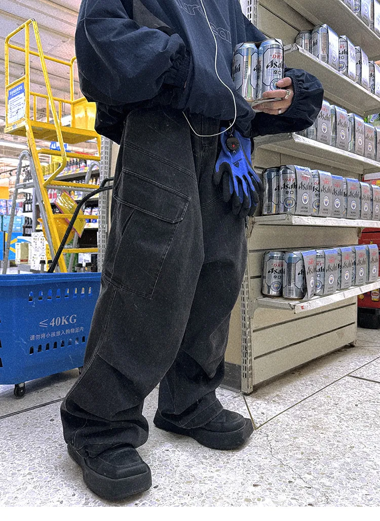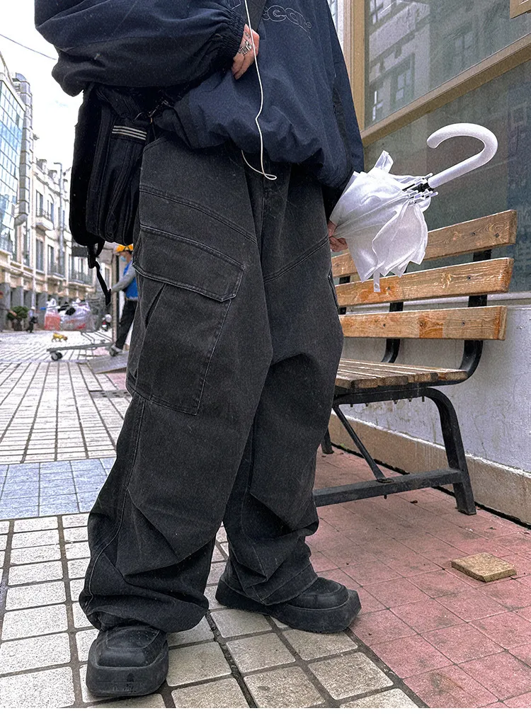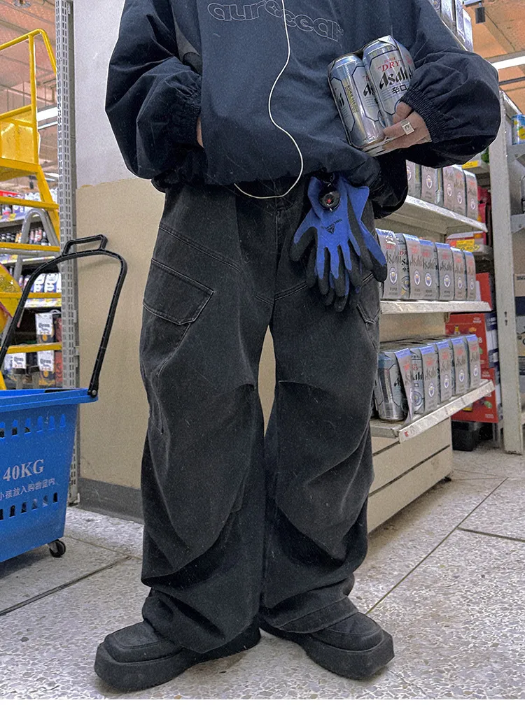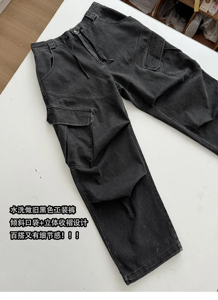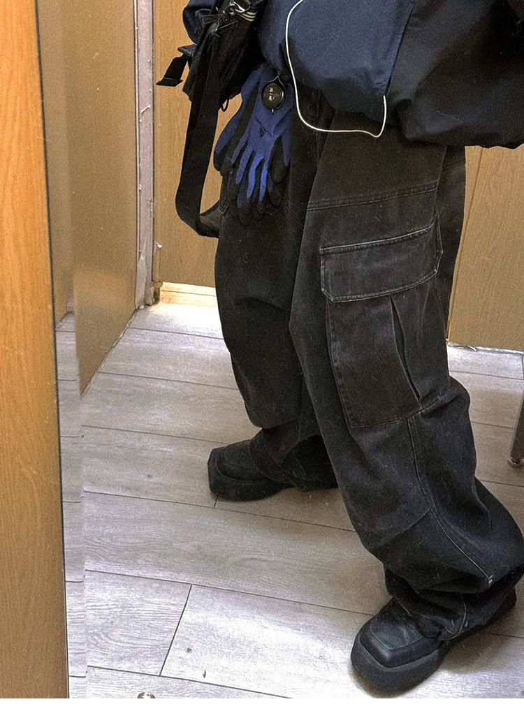 AUROCEAN 純棉 水洗 大口袋 長褲 工裝褲 闊腿褲 (黑色)