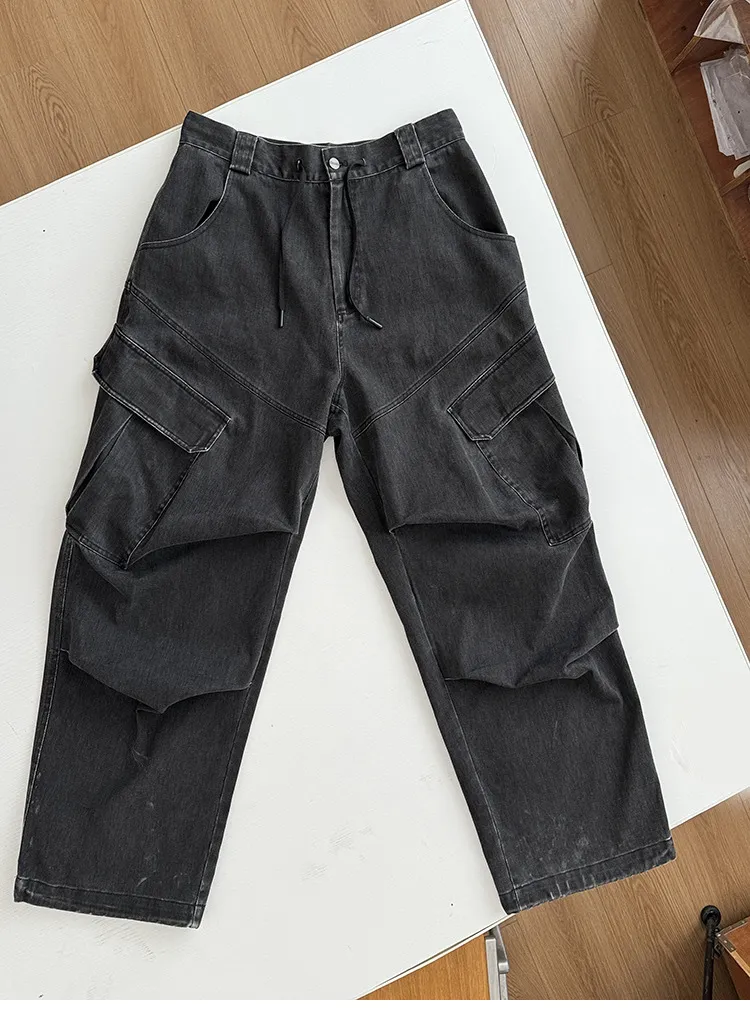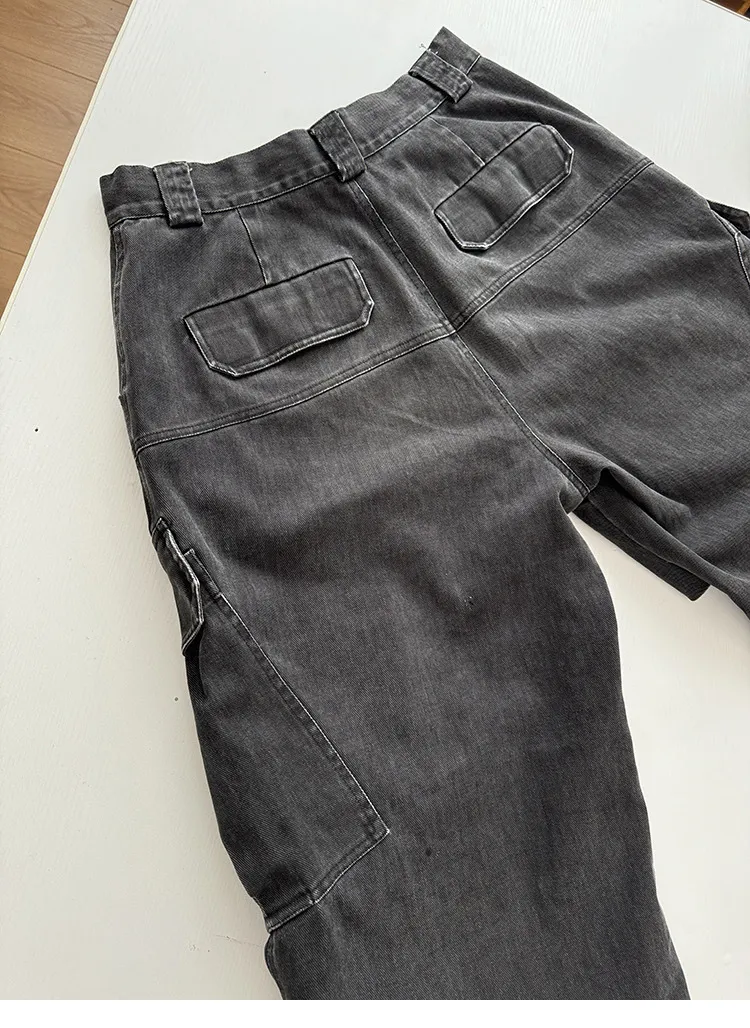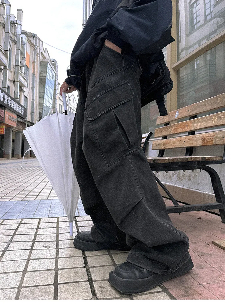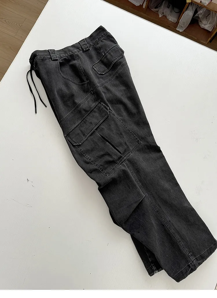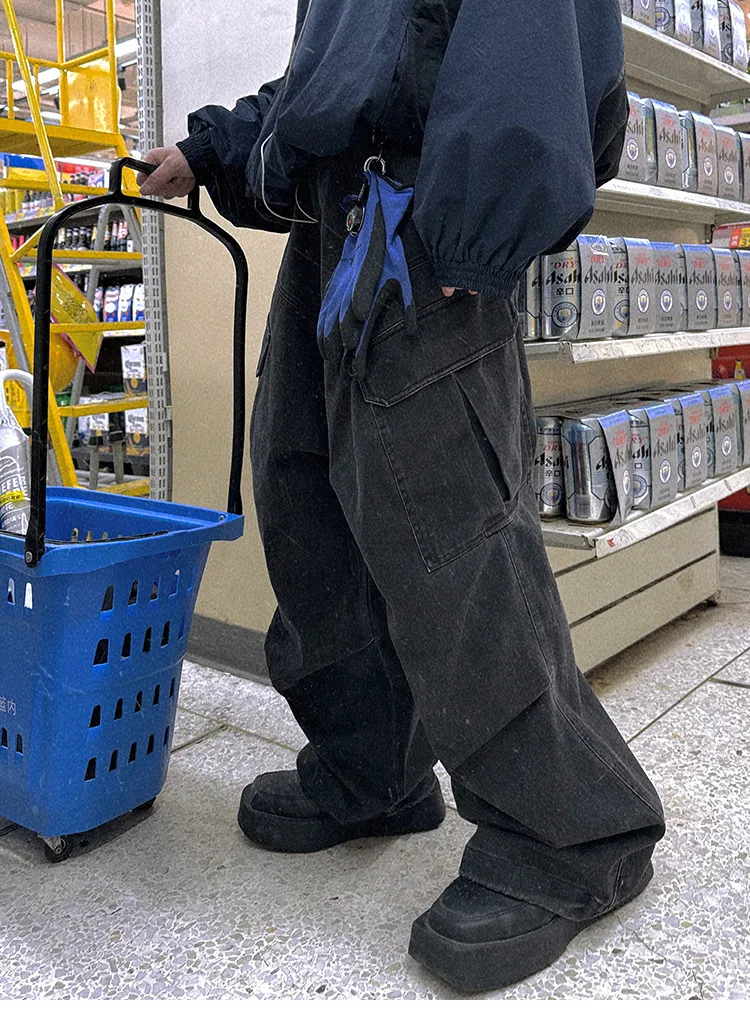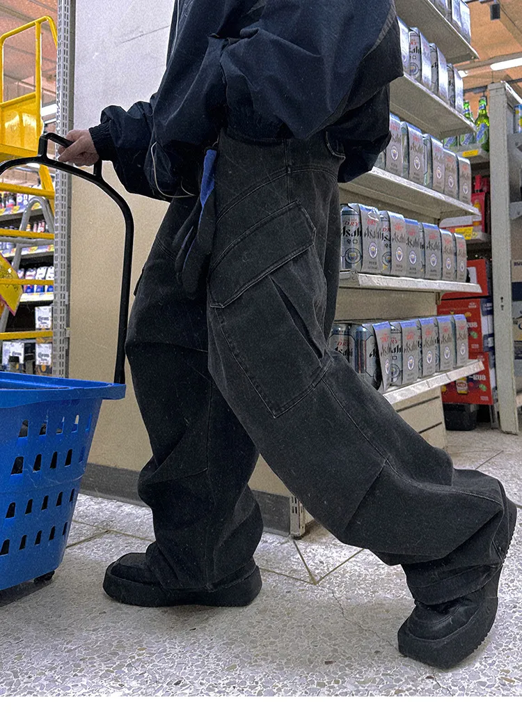 AUROCEAN 純棉 水洗 大口袋 長褲 工裝褲 闊腿褲 (黑色)