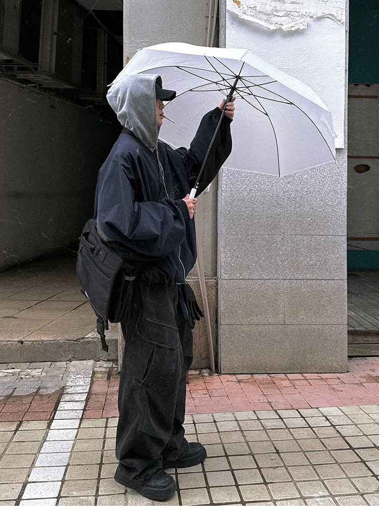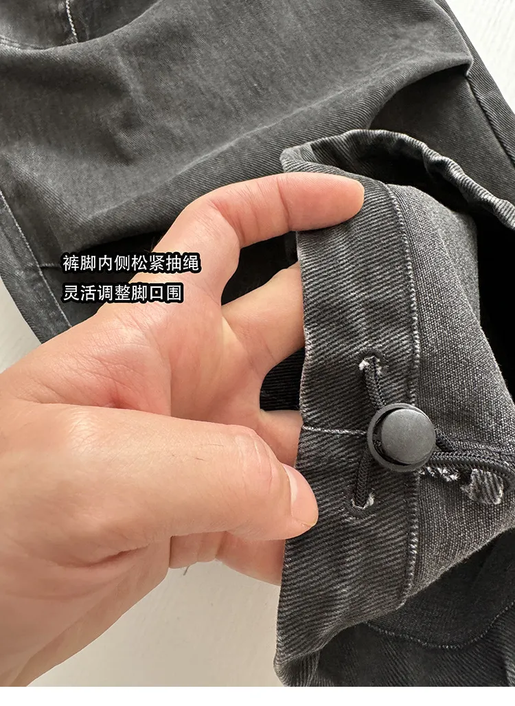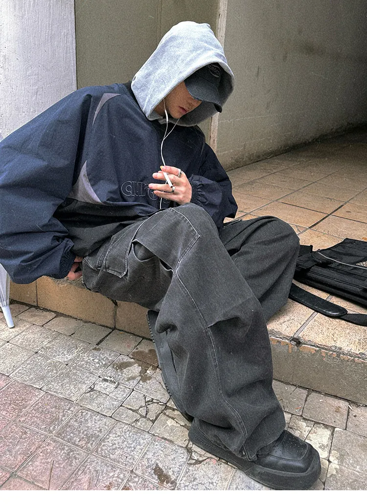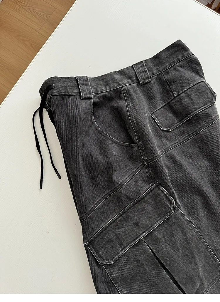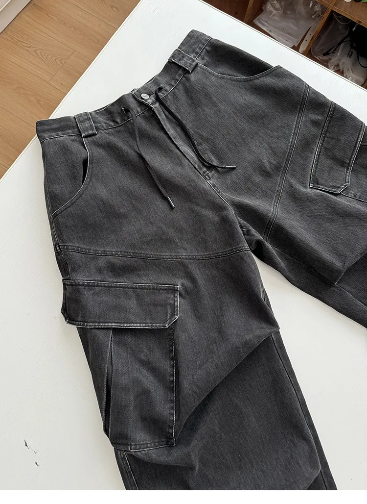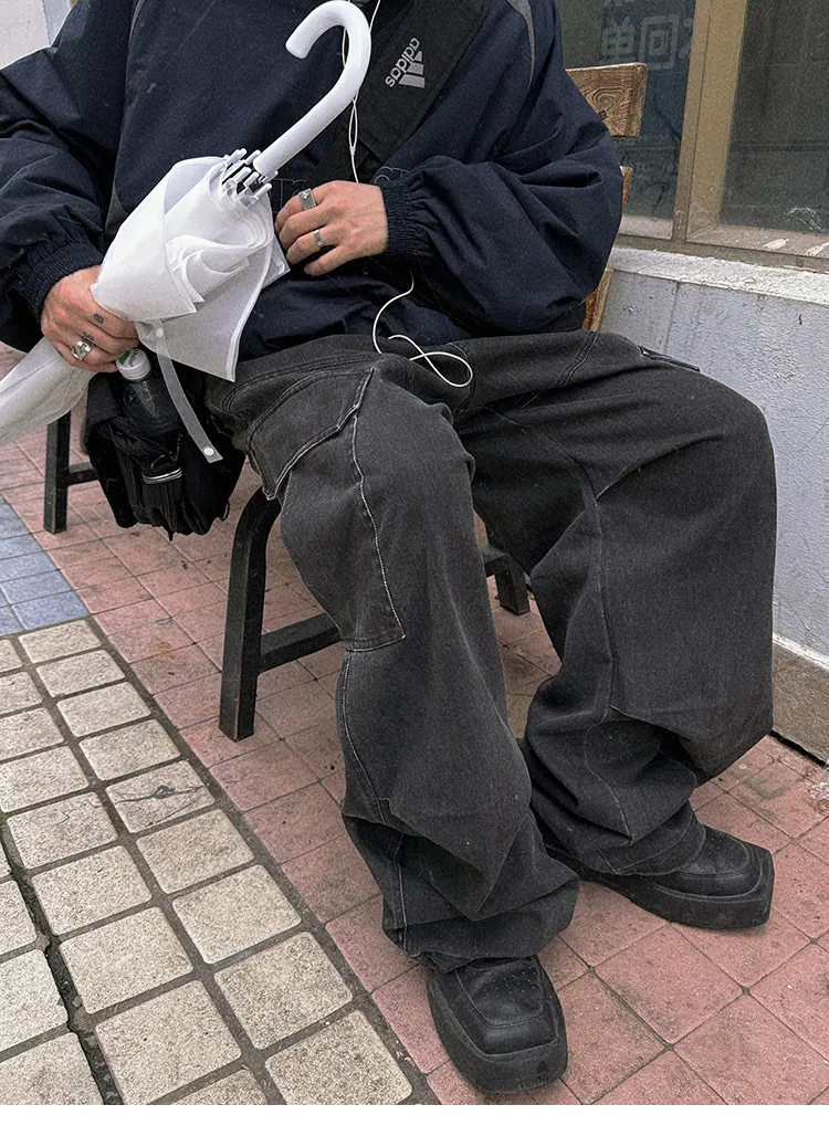 AUROCEAN 純棉 水洗 大口袋 長褲 工裝褲 闊腿褲 (黑色)
