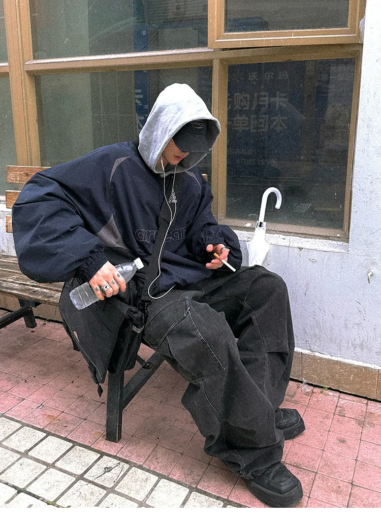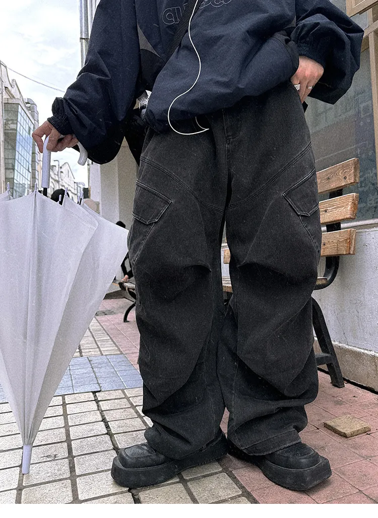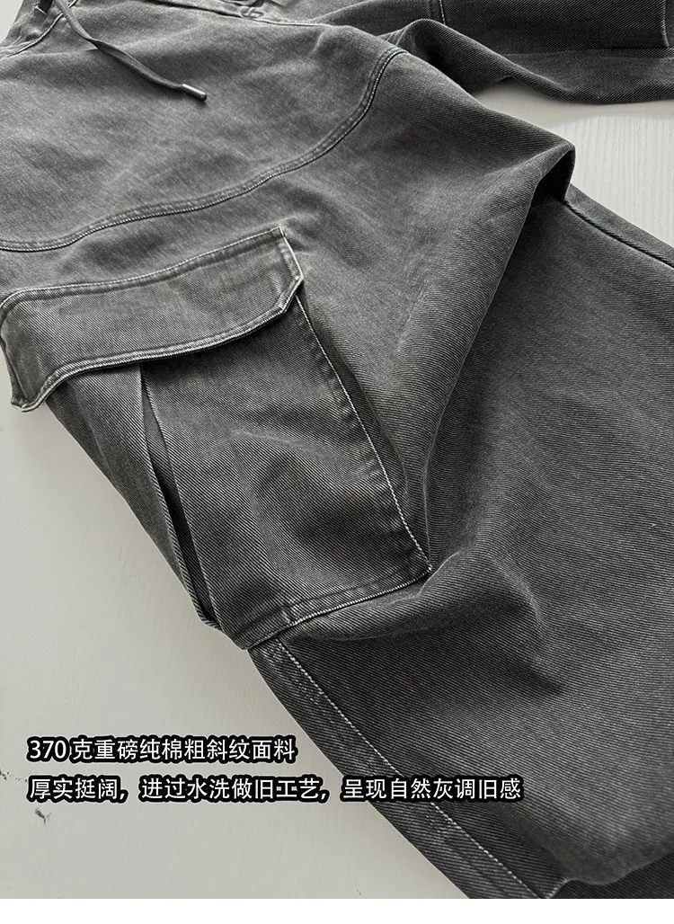 AUROCEAN 立體收褶 大口袋 400G重磅 棉褲 闊腿褲 (冷鐵灰色)