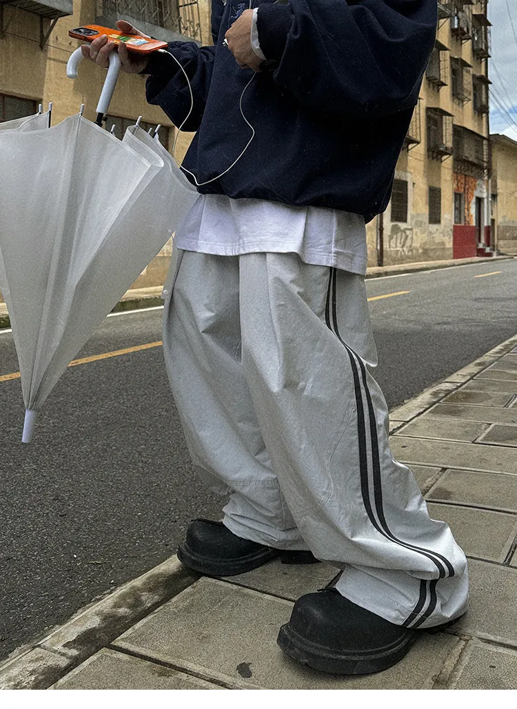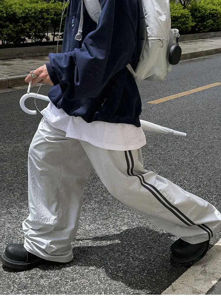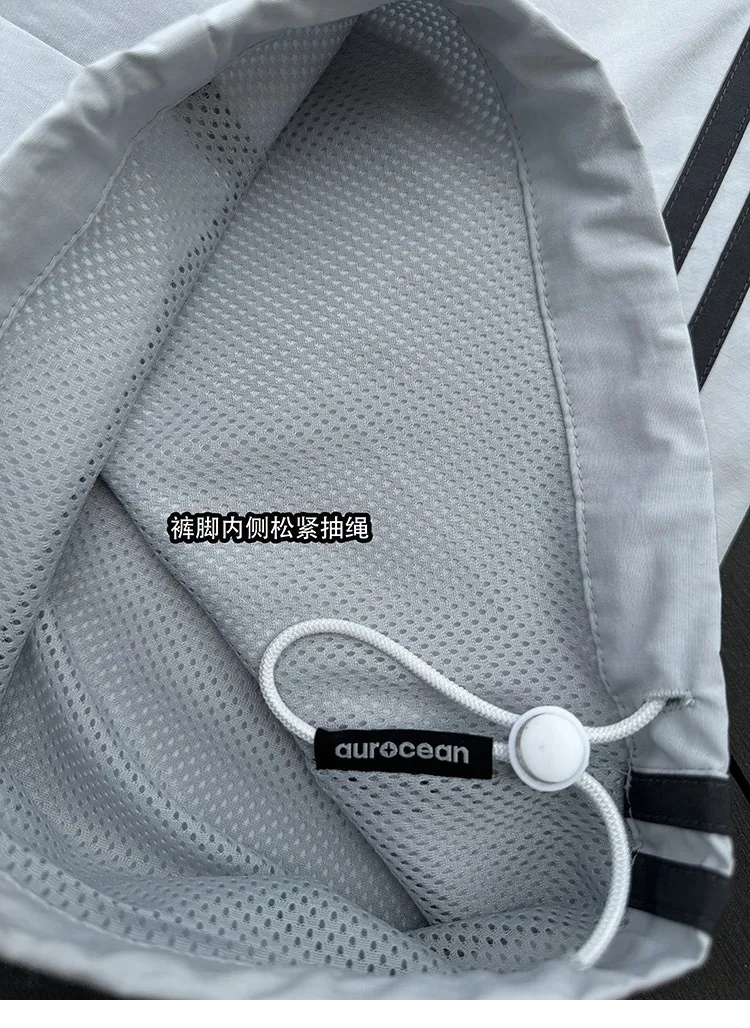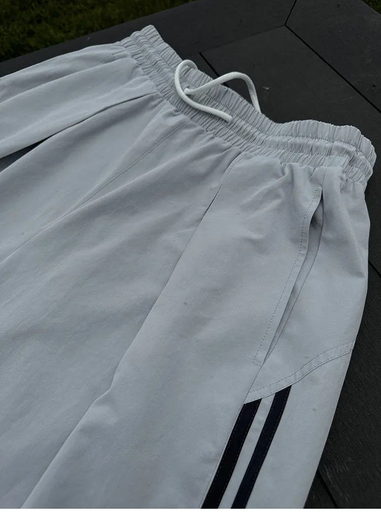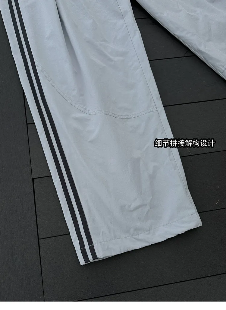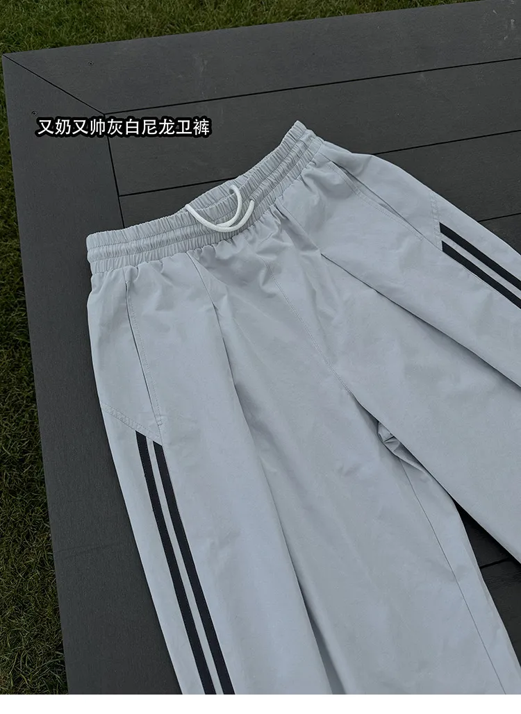 AUROCEAN 灰白 邊條 堆疊感 尼龍 運動褲 長褲(灰白色)