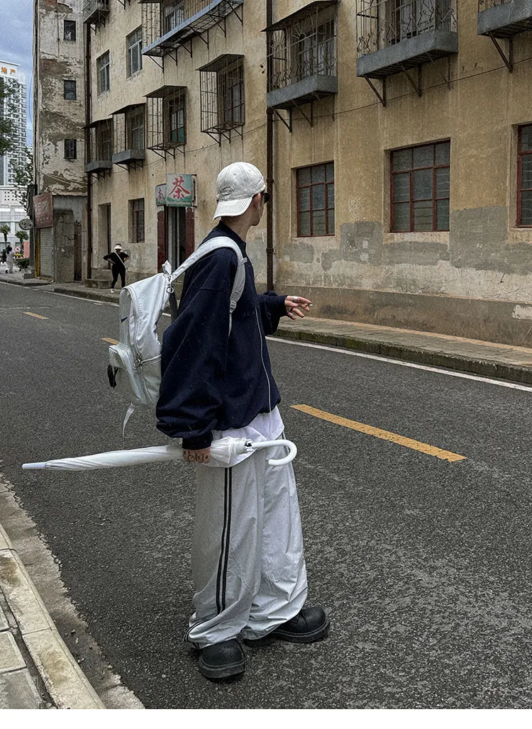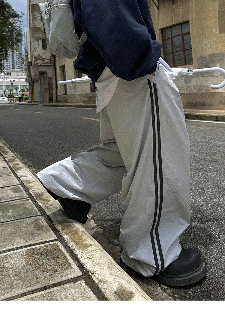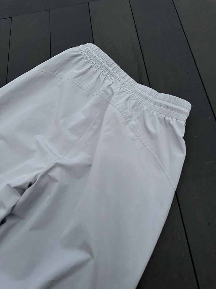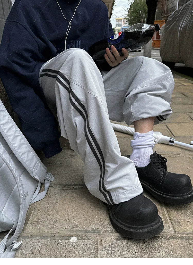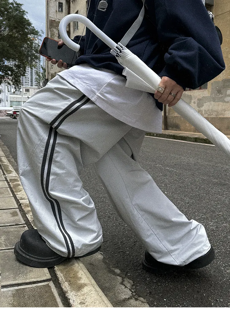 AUROCEAN 灰白 邊條 堆疊感 尼龍 運動褲 長褲(灰白色)